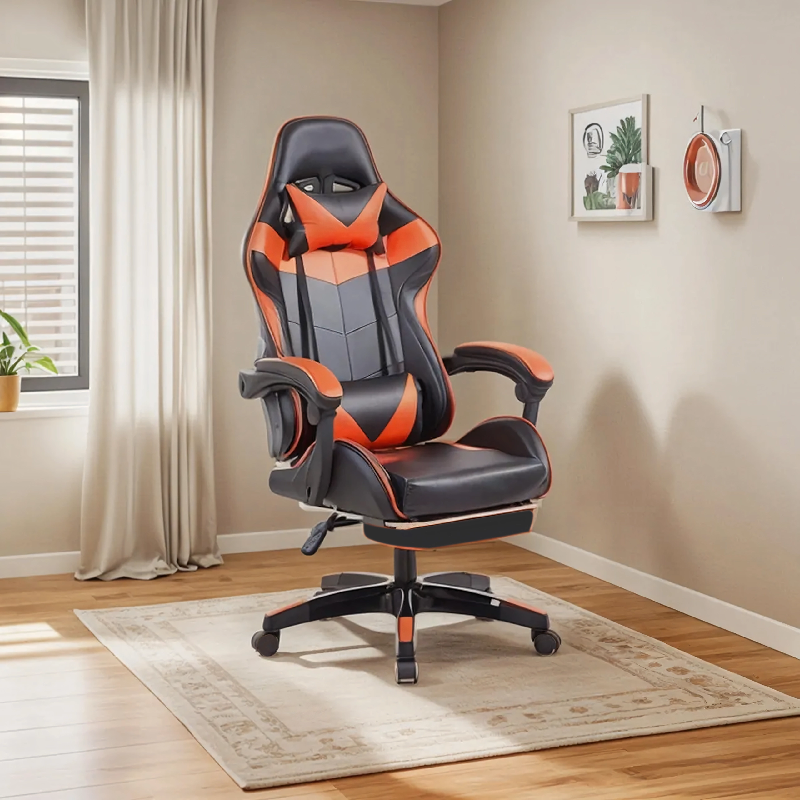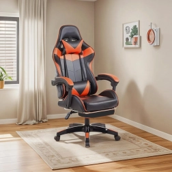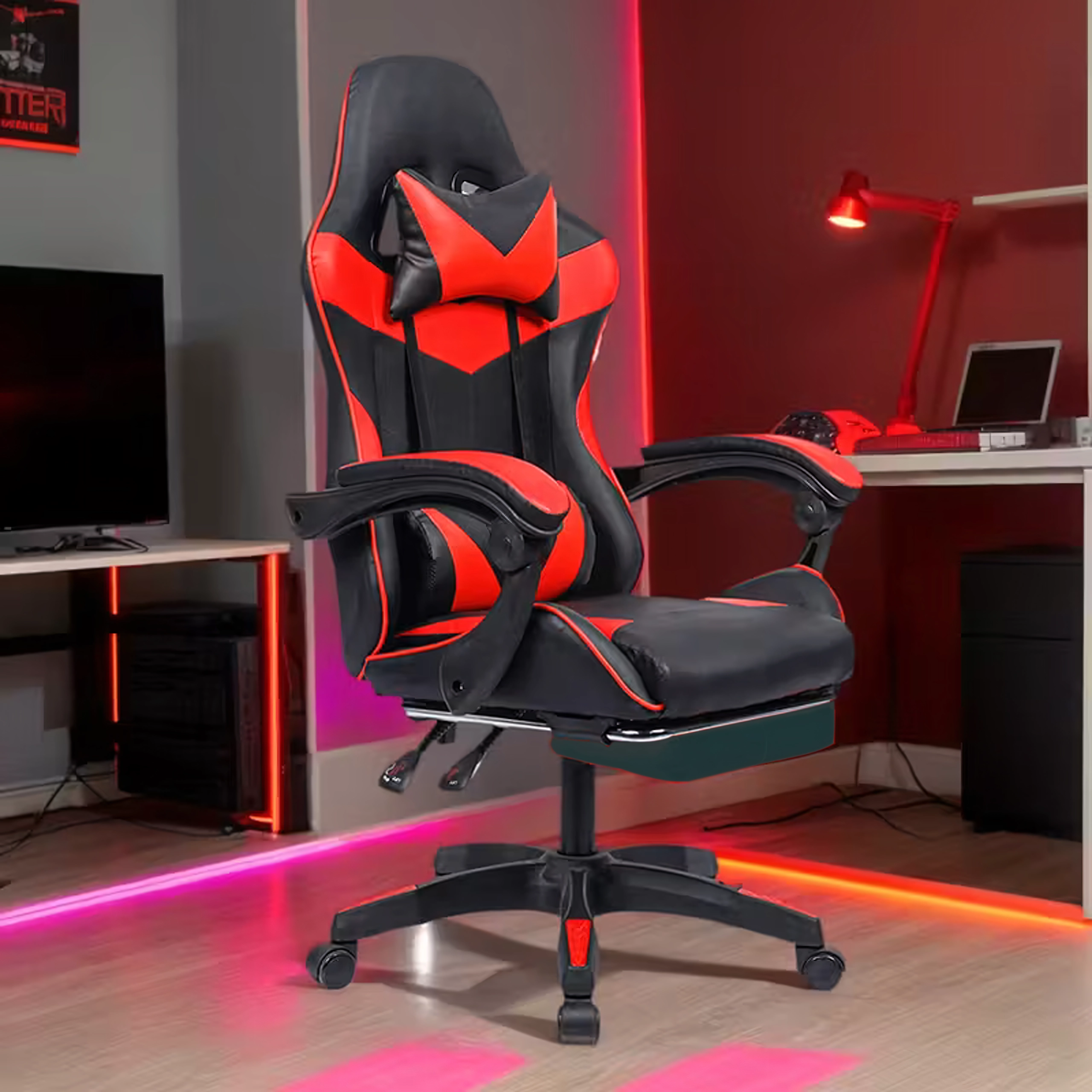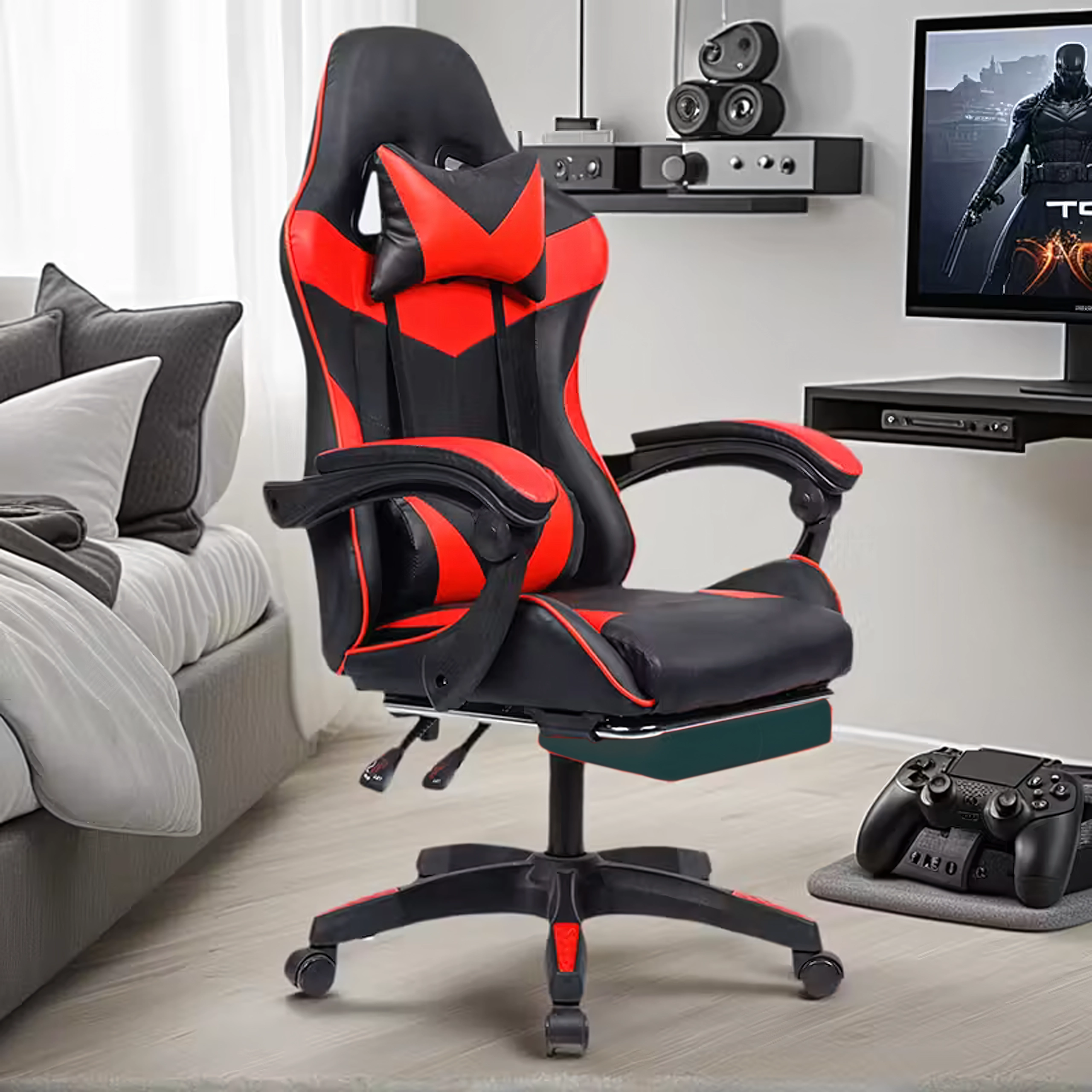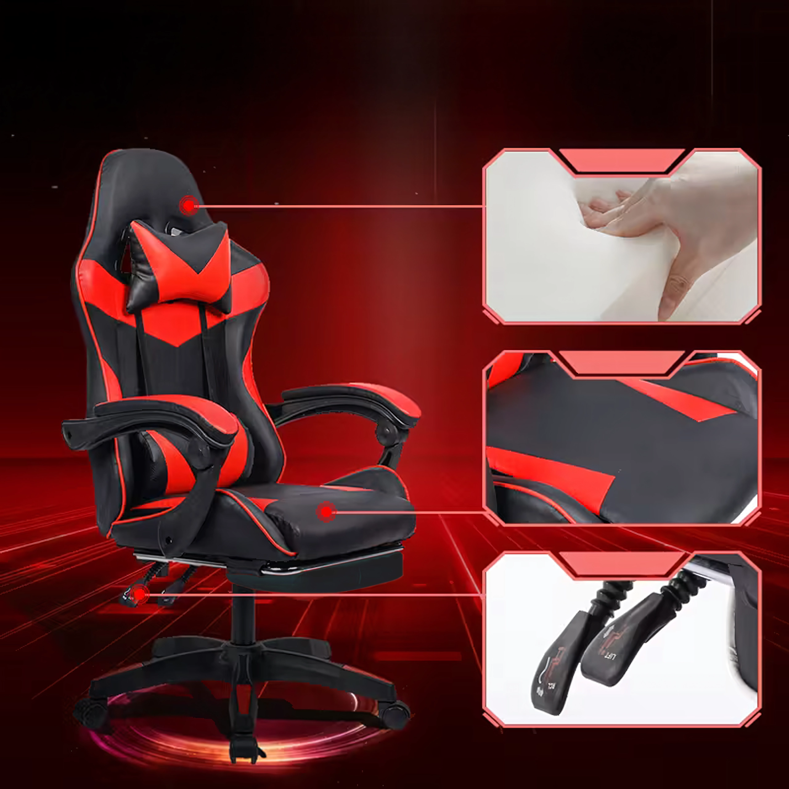 Fotel gamingowy z podnóżkiem został zaprojektowany z myślą o stabilności, wsparciu i wygodnym siedzeniu podczas długich godzin przy komputerze. Wysokie oparcie z zagłówkiem i poduszką lędźwiową pomaga odciążyć plecy, a płynne odchylanie oparcia oraz wysuwany podnóżek pozwalają szybko przejść z trybu pracy do relaksu.