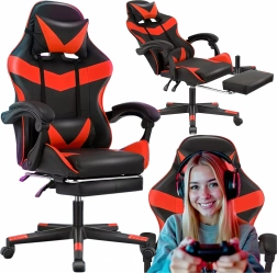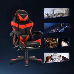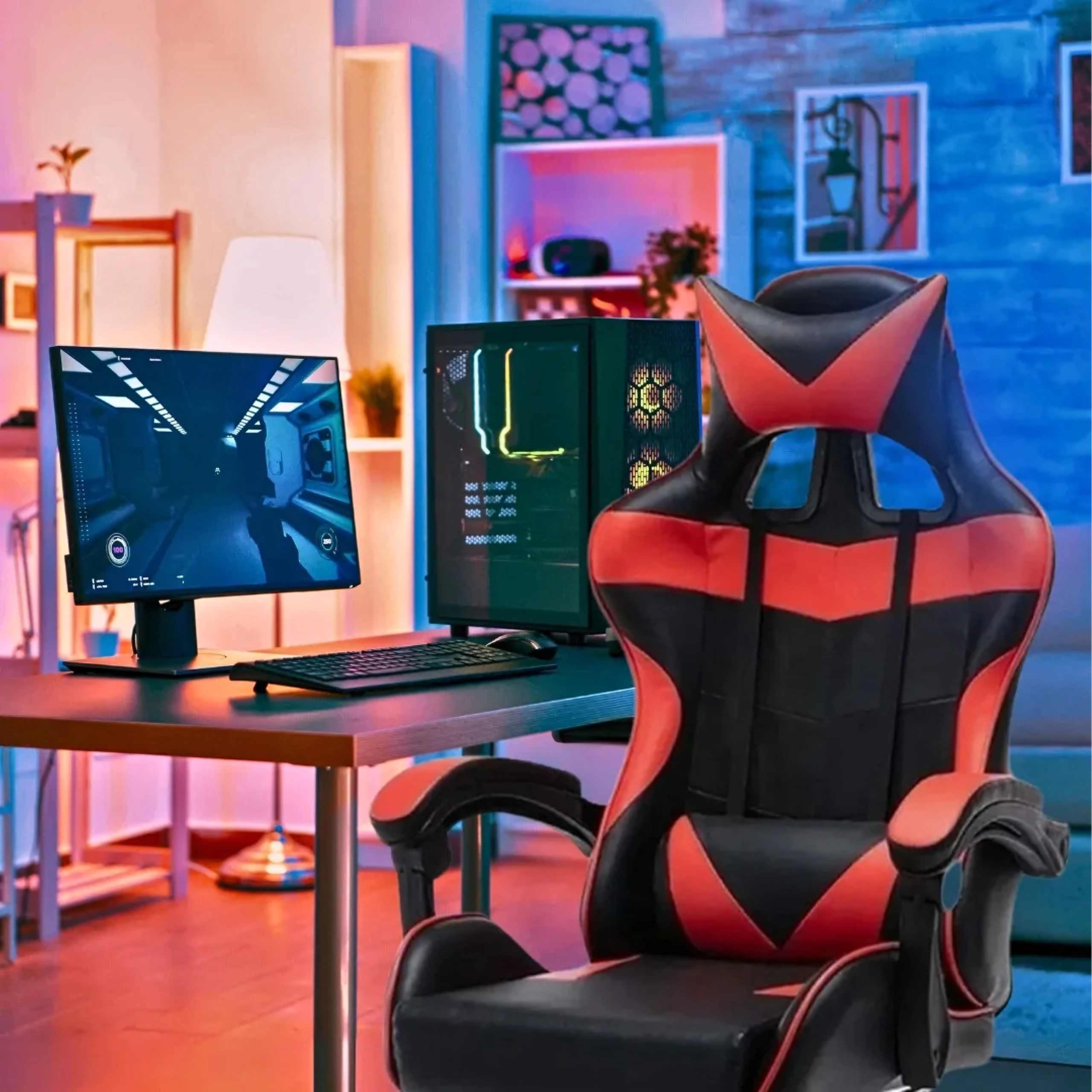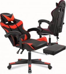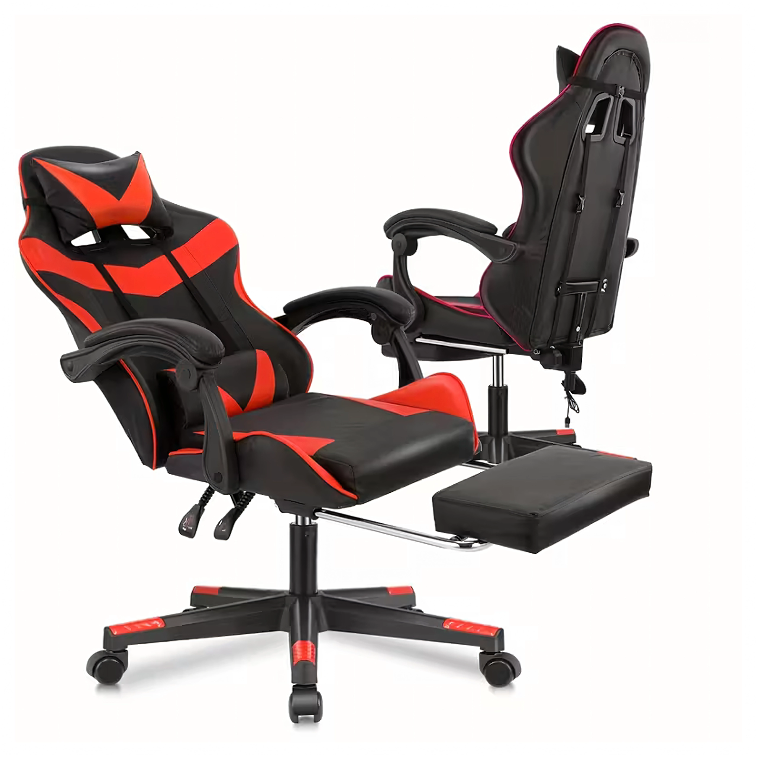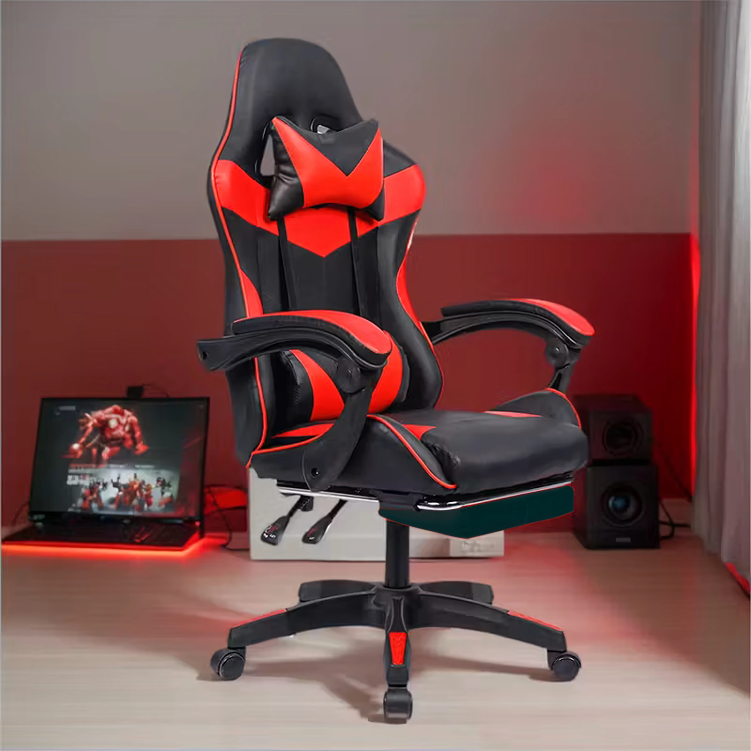 Fotel gamingowy z podnóżkiem został zaprojektowany z myślą o stabilności, wsparciu i wygodnym siedzeniu podczas długich godzin przy komputerze. Wysokie oparcie z zagłówkiem i poduszką lędźwiową pomaga odciążyć plecy, a płynne odchylanie oparcia oraz wysuwany podnóżek pozwalają szybko przejść z trybu pracy do relaksu.