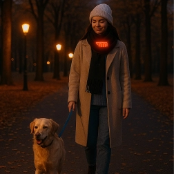 - Bezpieczna i prosta obsługa za pomocą przycisku bezpośrednio na szaliku.