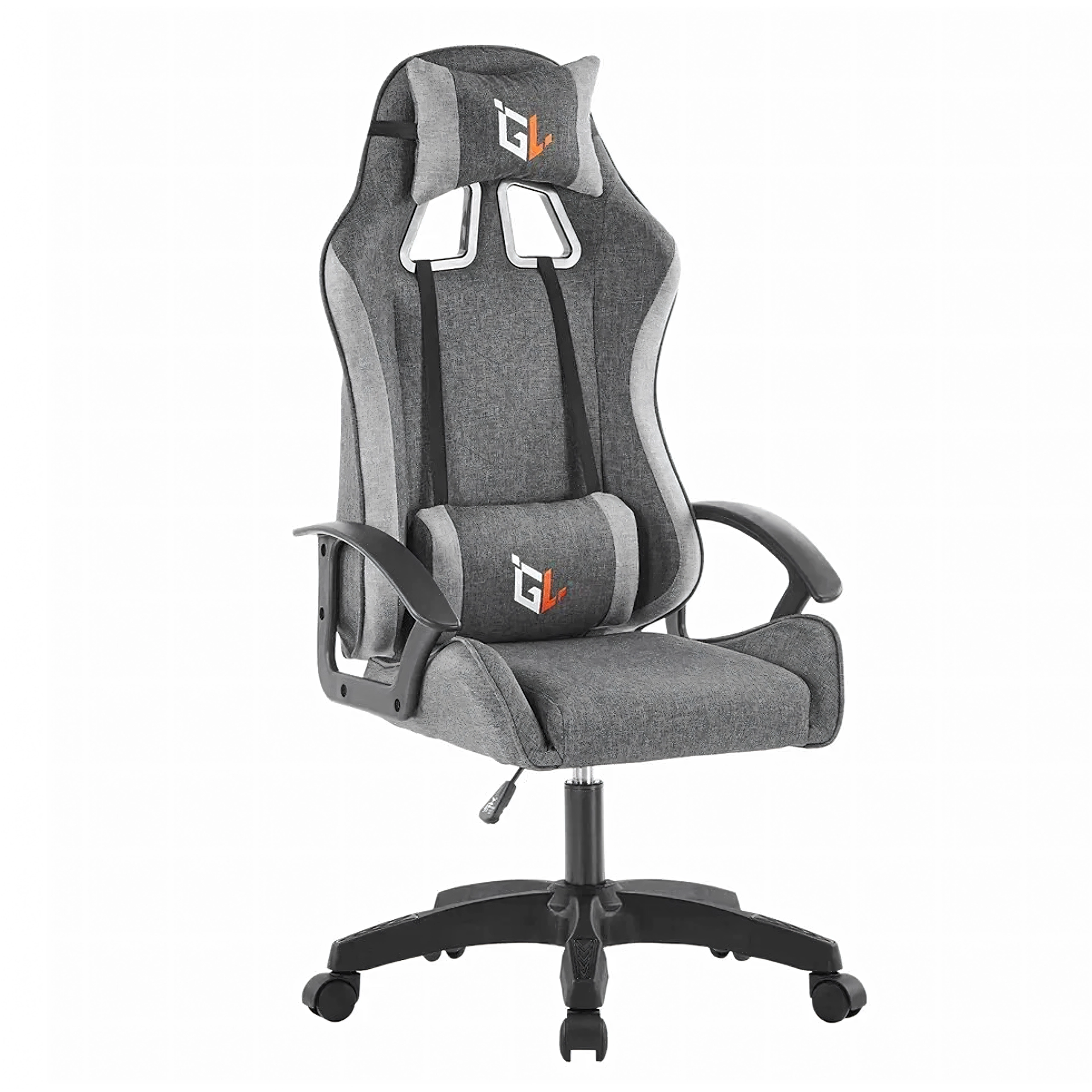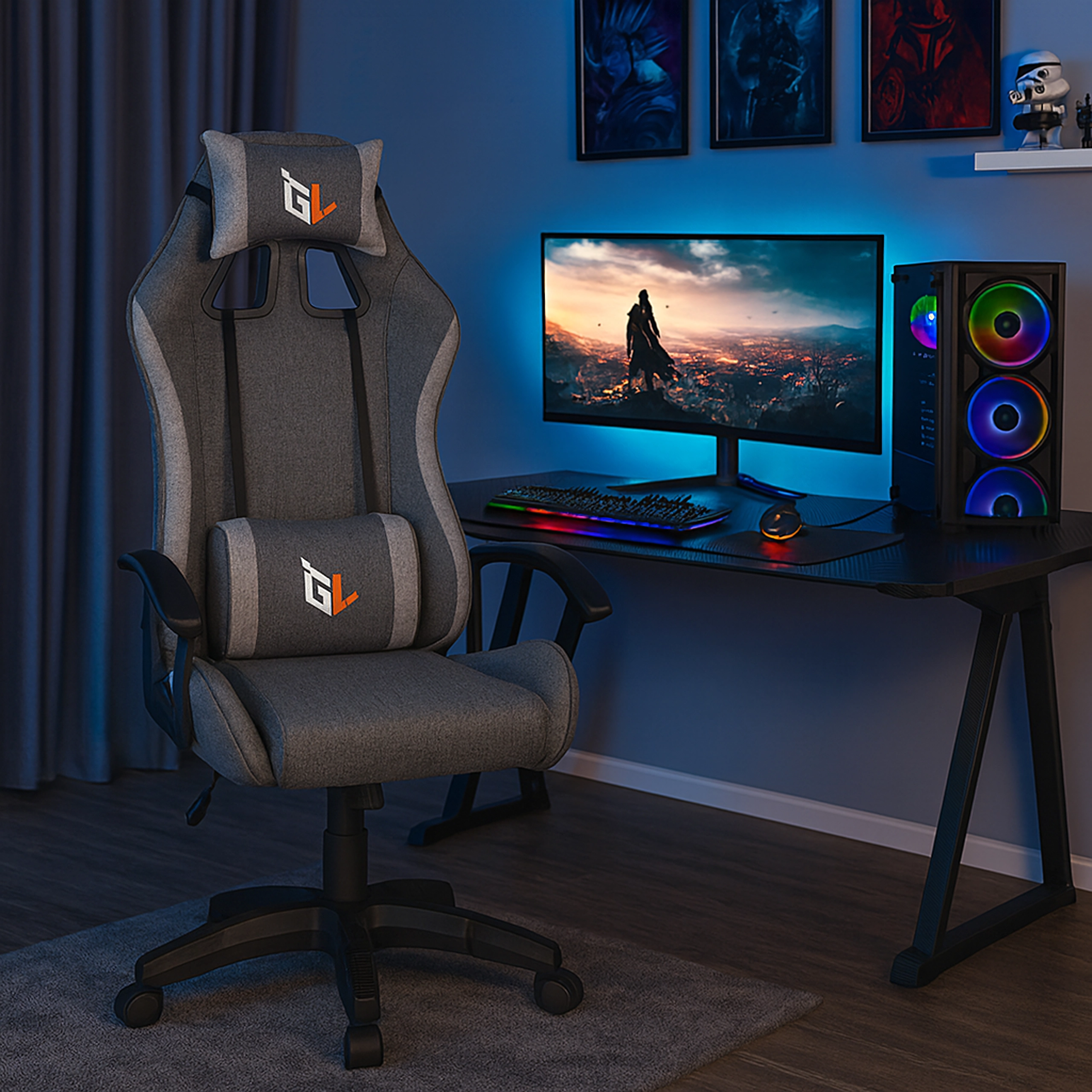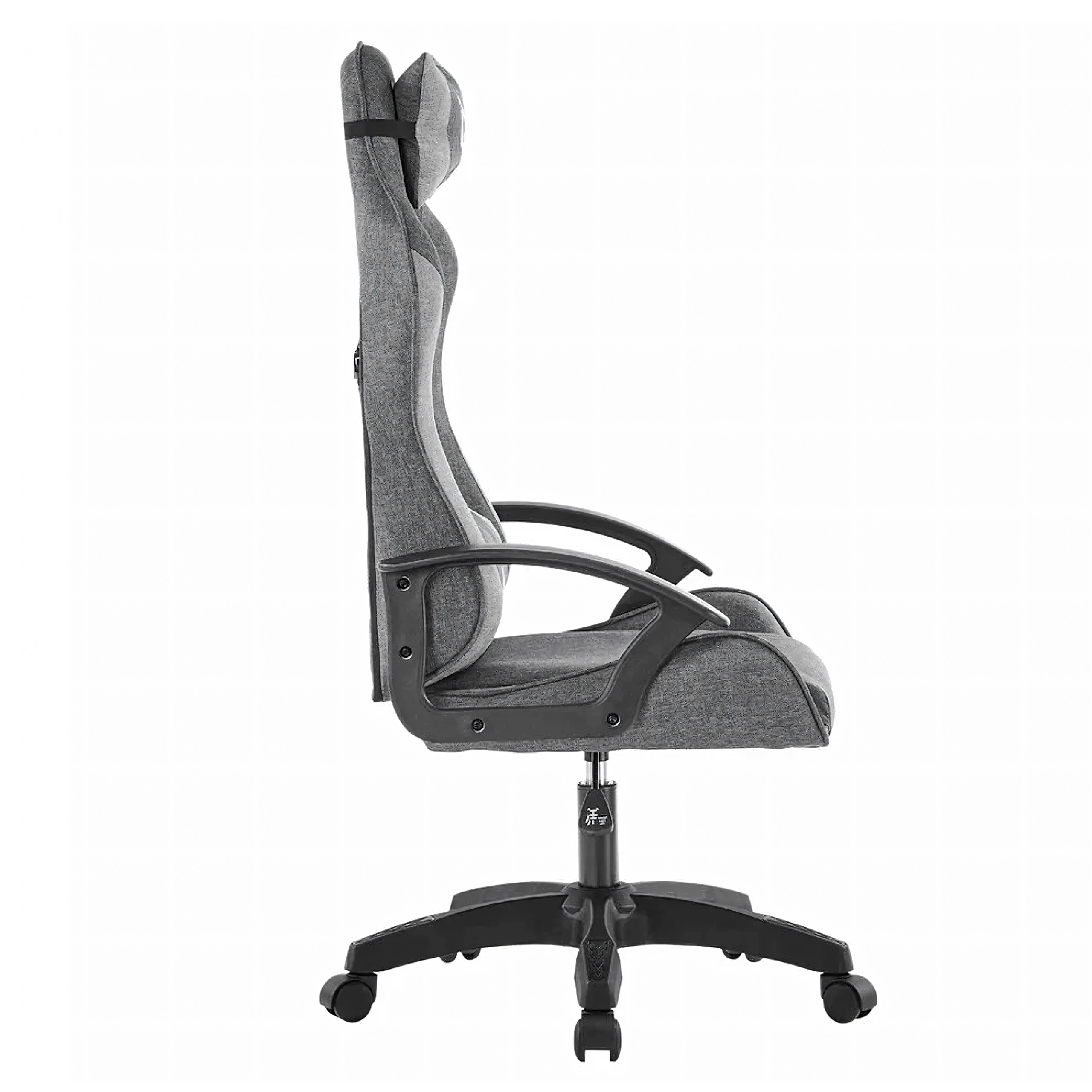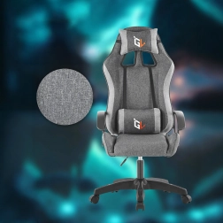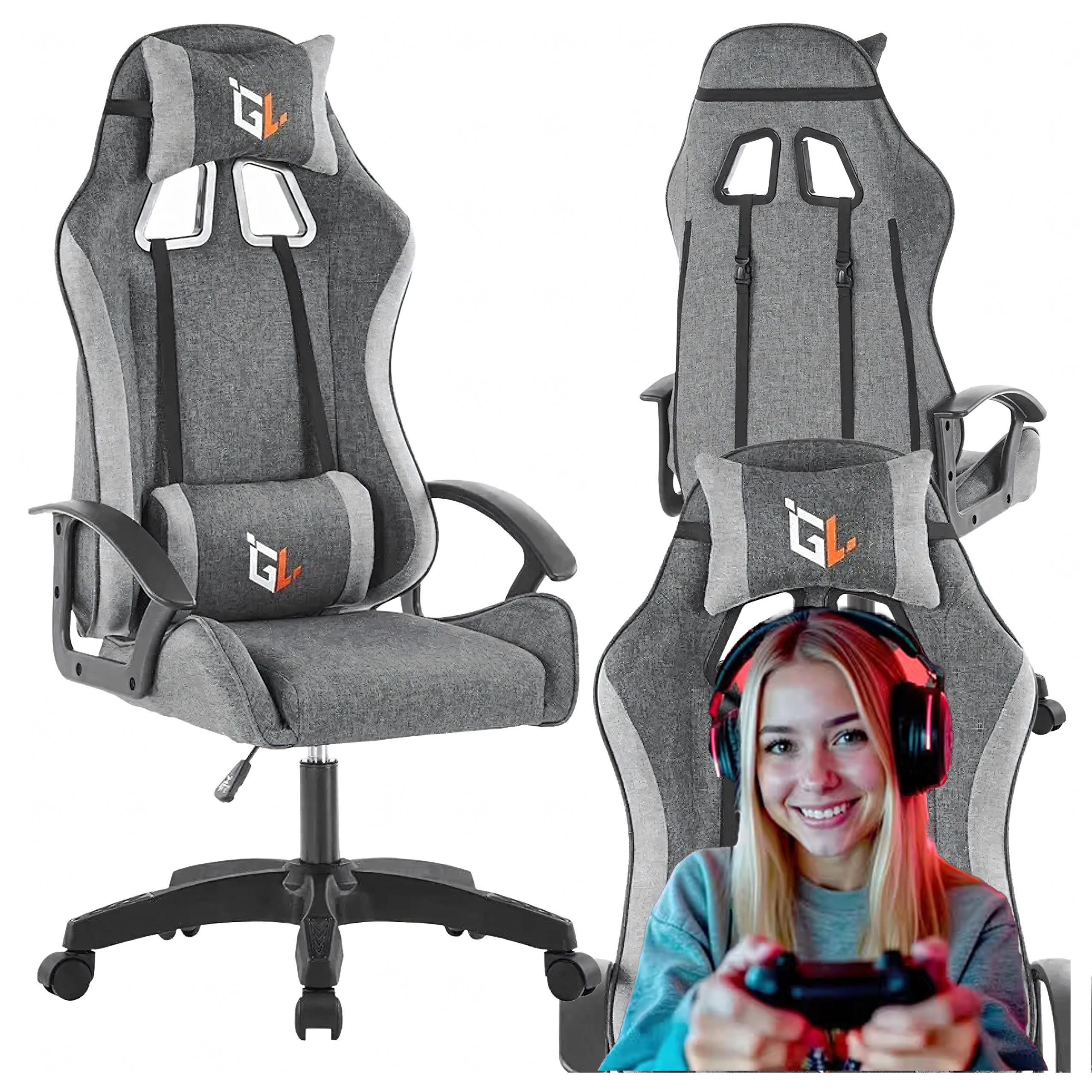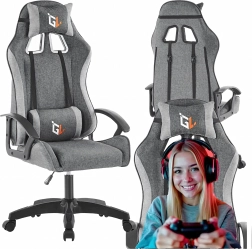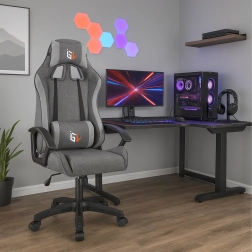 Stylowe i wygodne krzesło gamingowe na długie godziny przy komputerze. Oferuje ergonomiczny design, regulację wysokości, wsparcie odcinka lędźwiowego oraz poduszkę pod głowę. Trwałe tapicerowanie tekstylne, stabilna pięcioramienna podstawa i udźwig 100 kg zapewniają pewność podczas grania, nauki i pracy.
