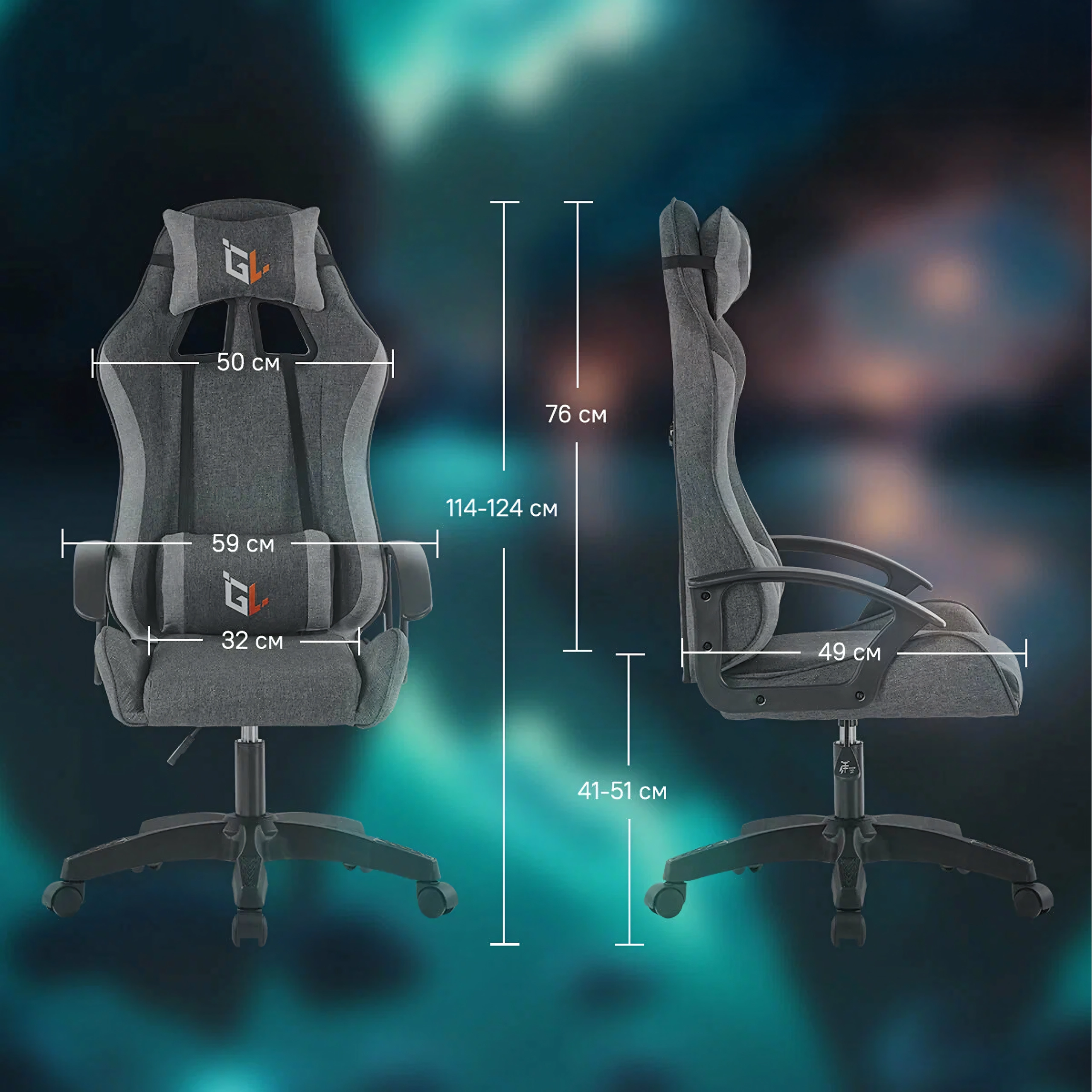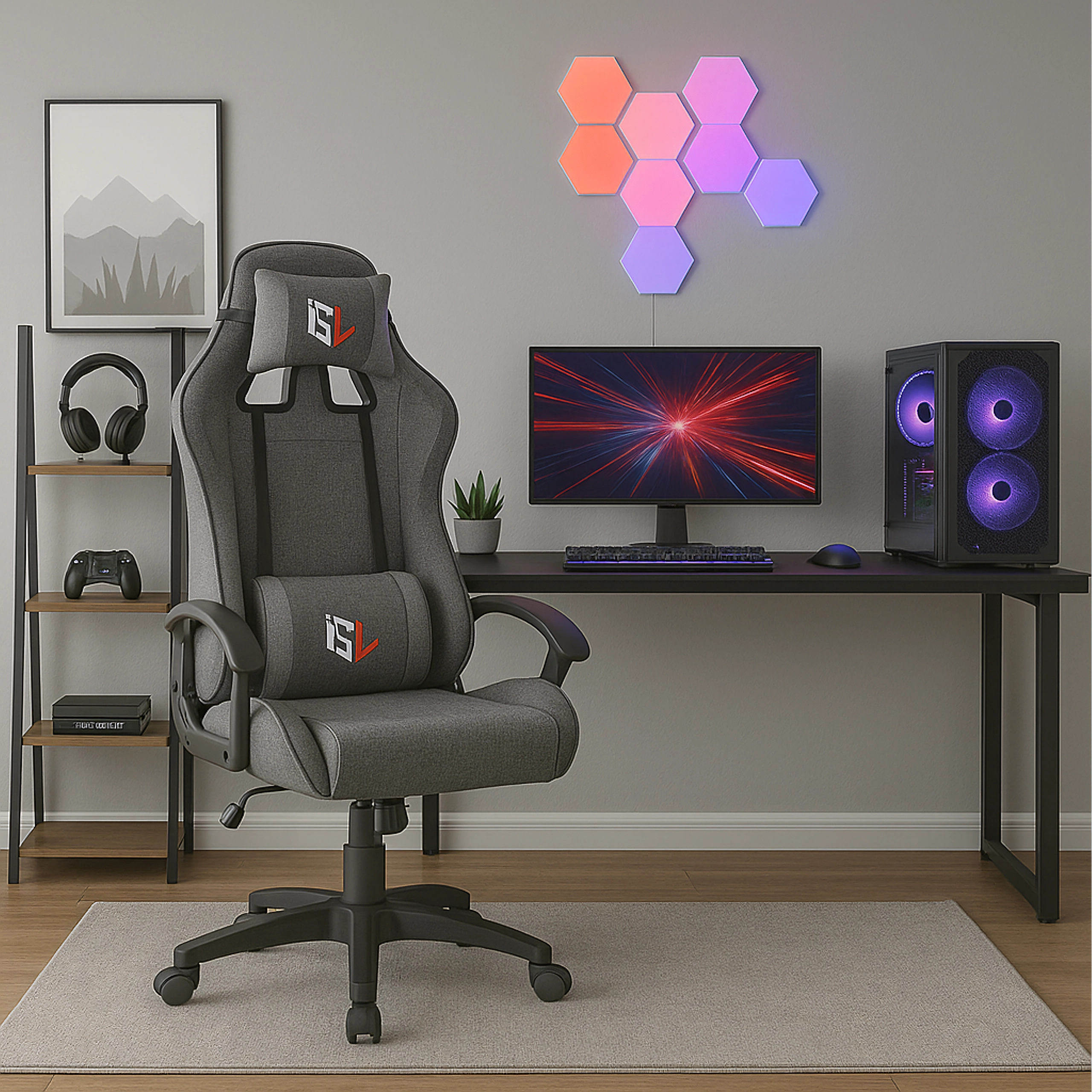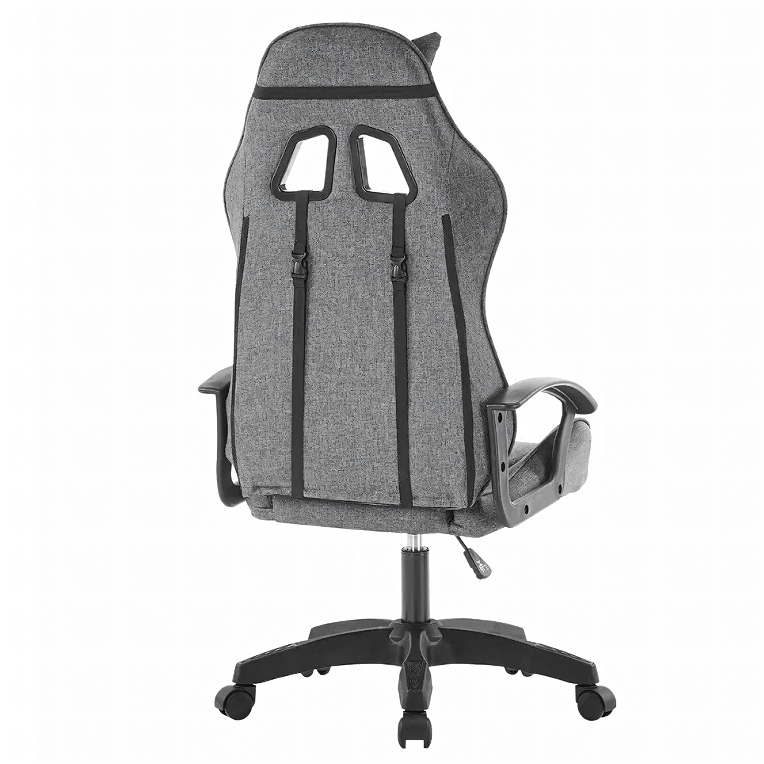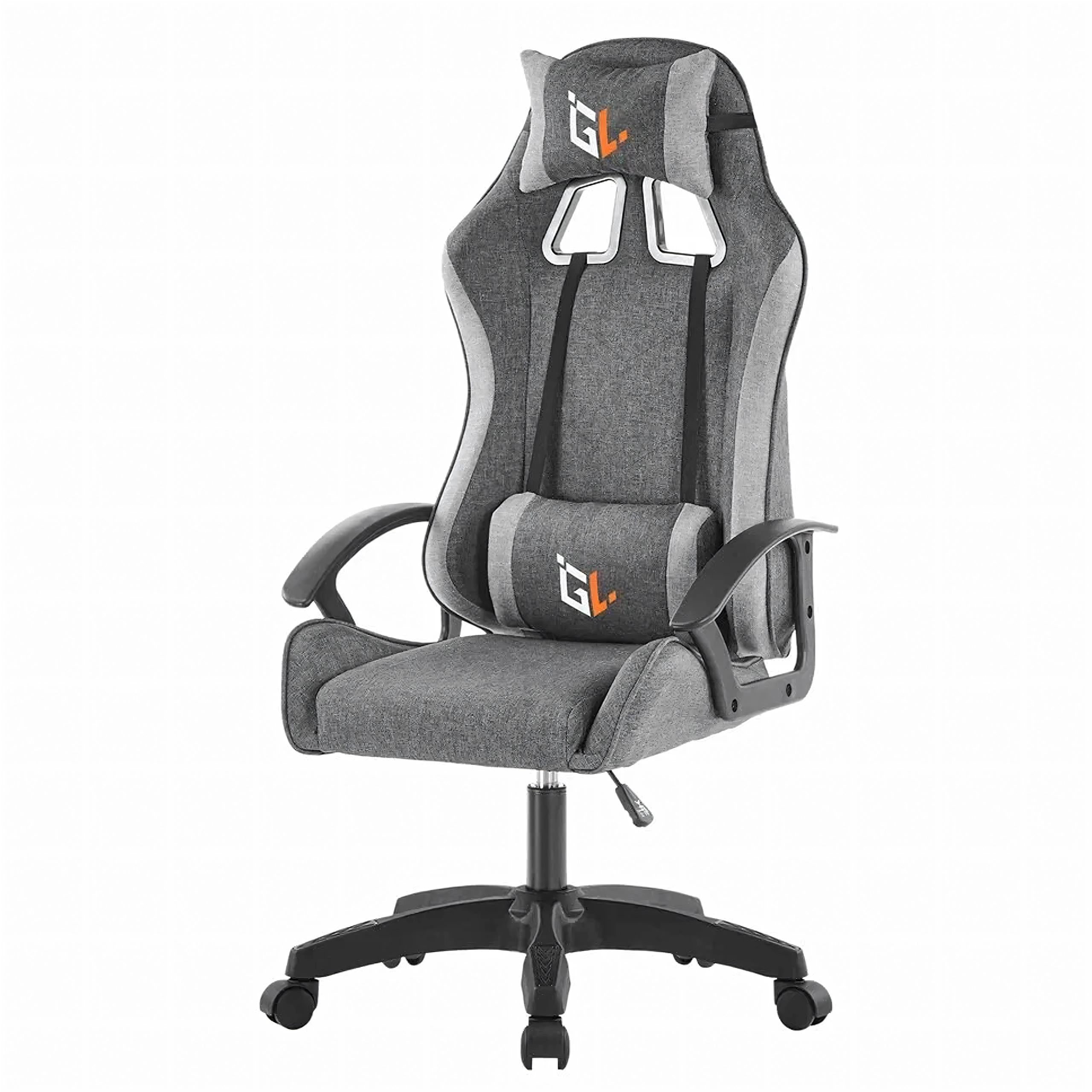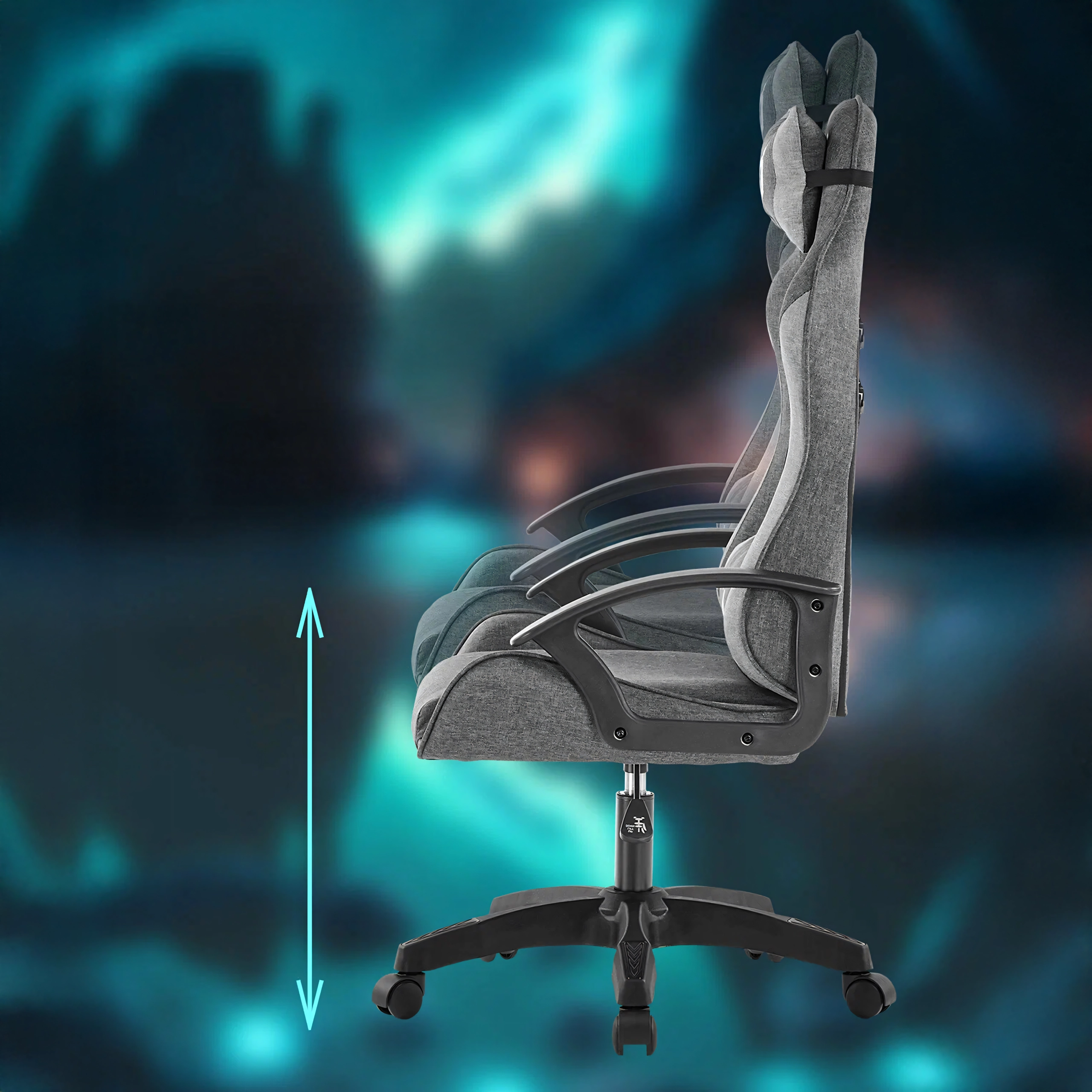 Stylowe i wygodne krzesło gamingowe na długie godziny przy komputerze. Oferuje ergonomiczny design, regulację wysokości, wsparcie odcinka lędźwiowego oraz poduszkę pod głowę. Trwałe tapicerowanie tekstylne, stabilna pięcioramienna podstawa i udźwig 100 kg zapewniają pewność podczas grania, nauki i pracy.
