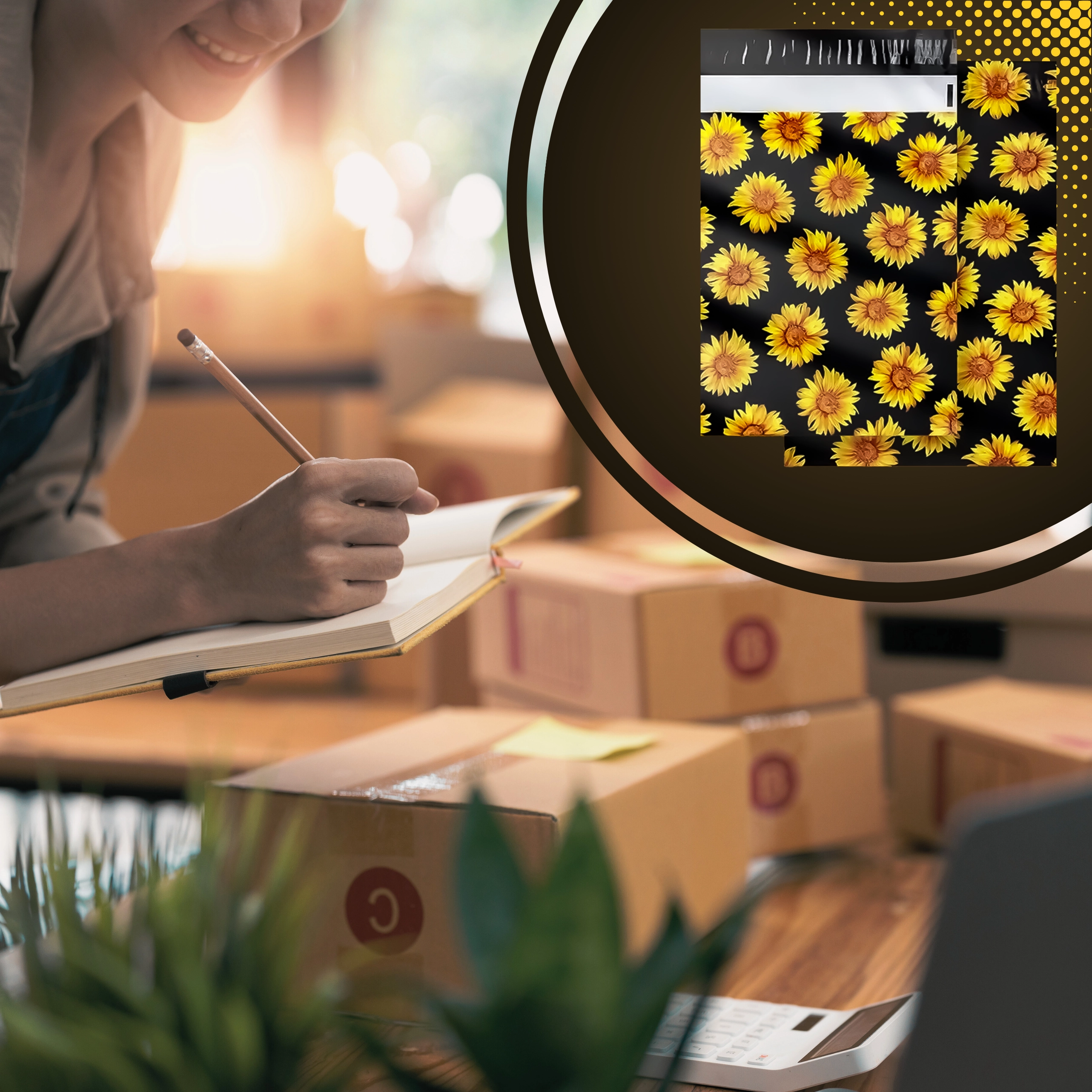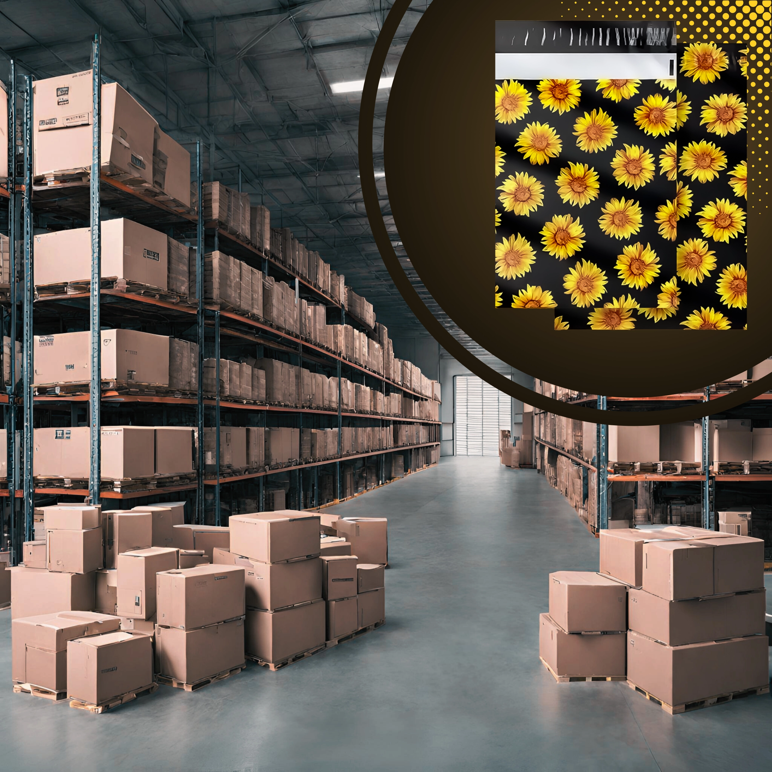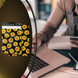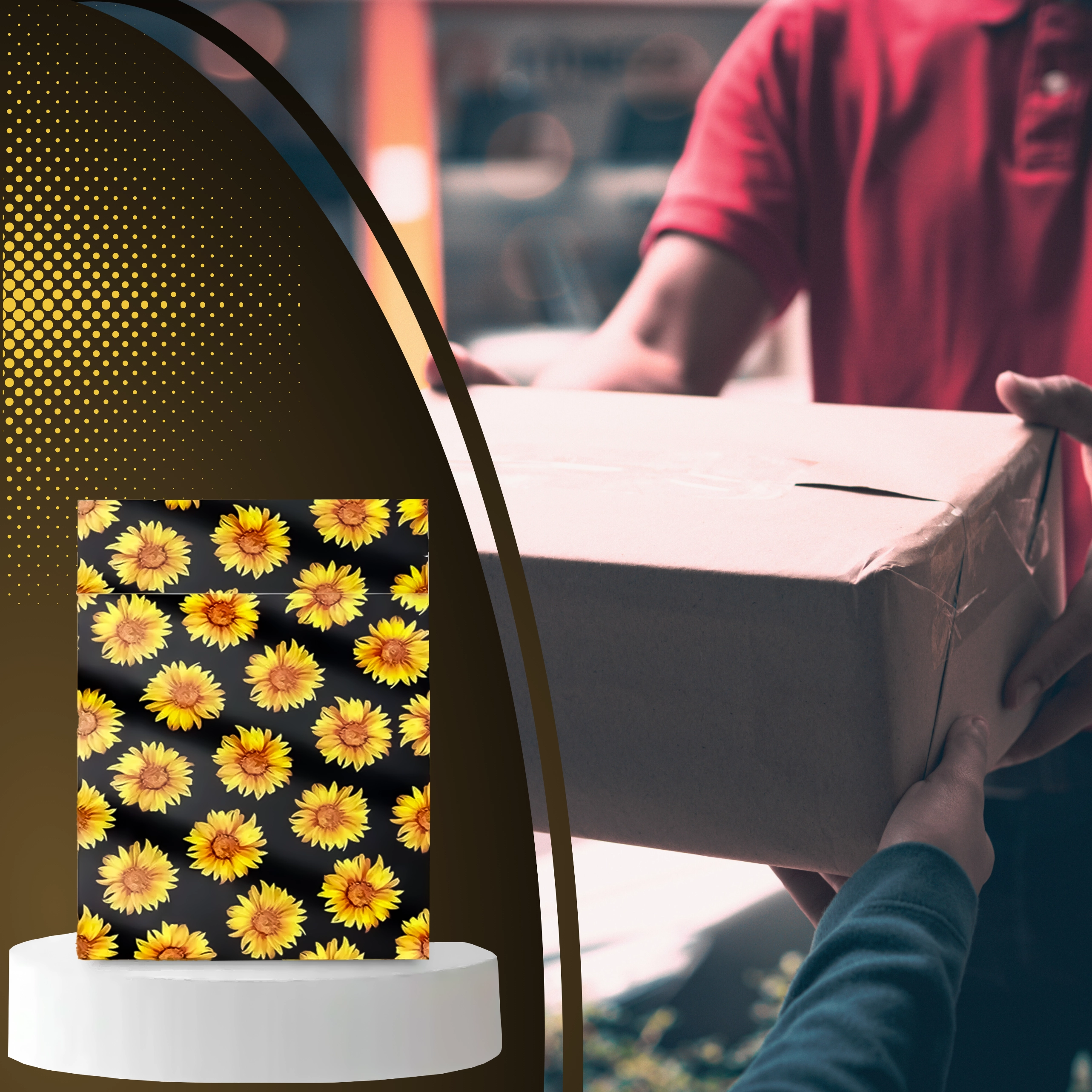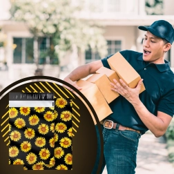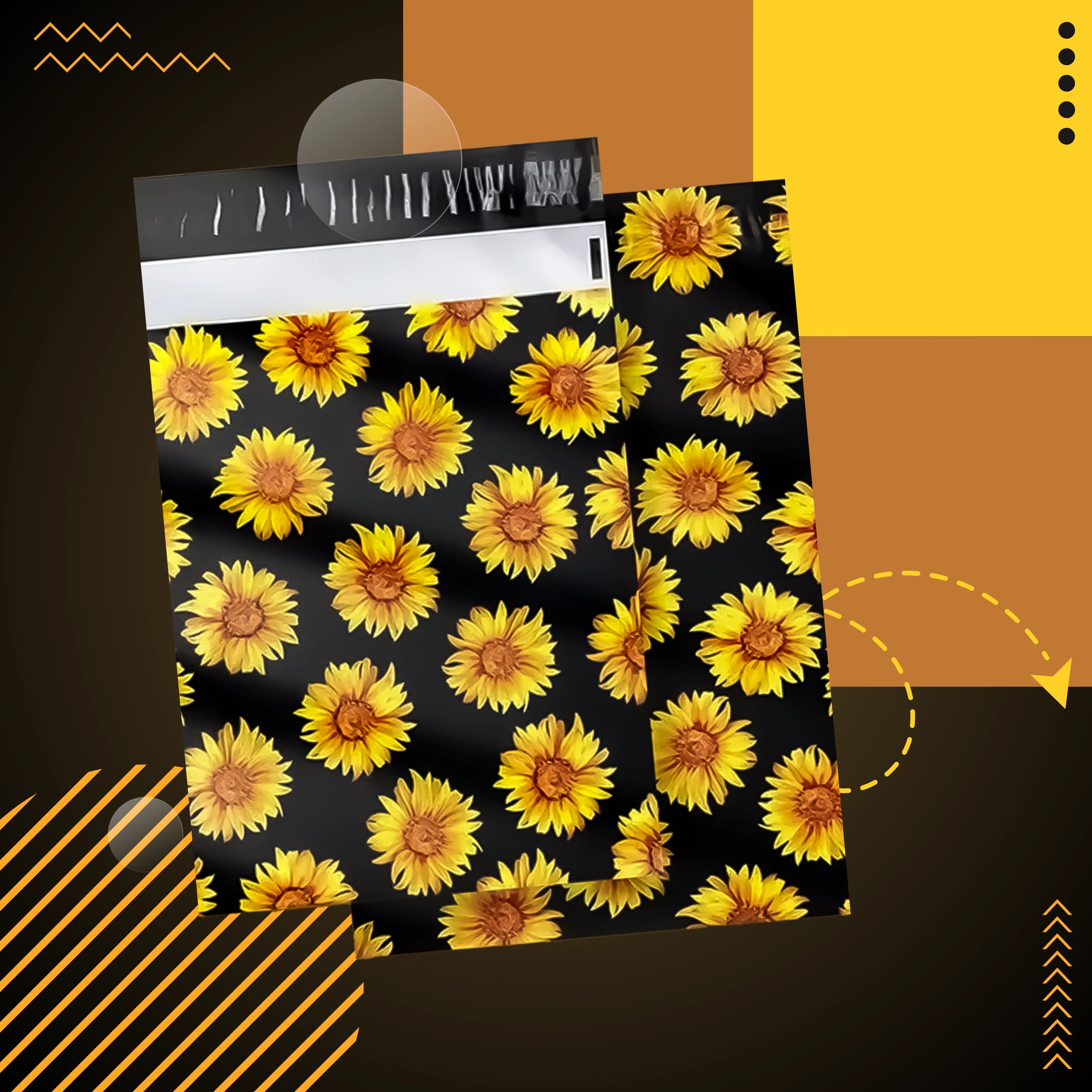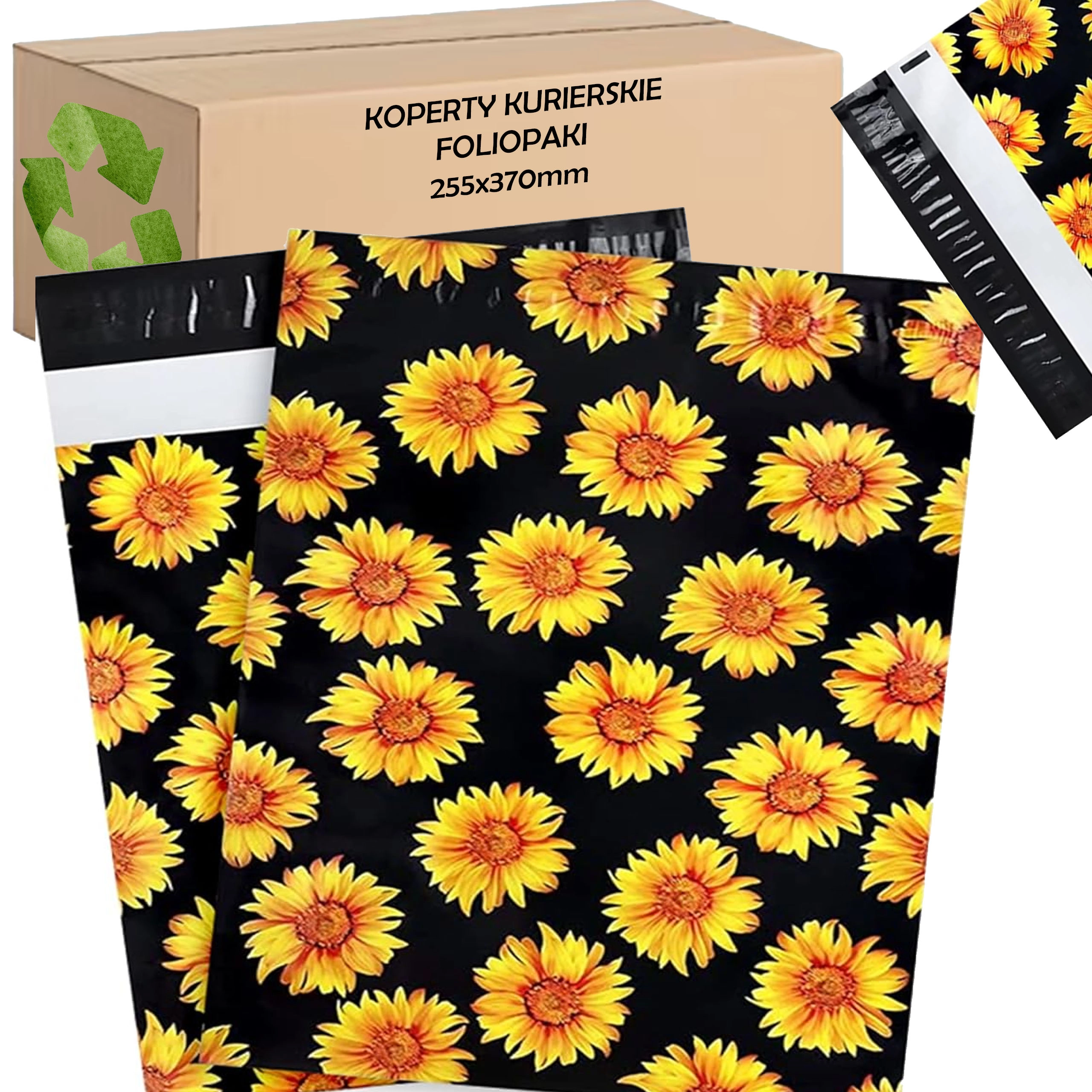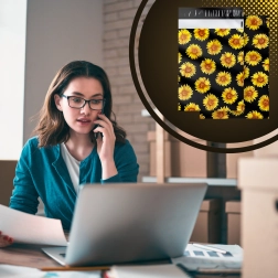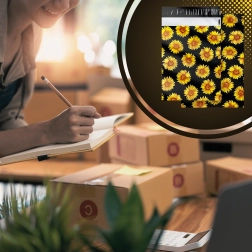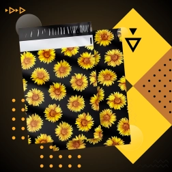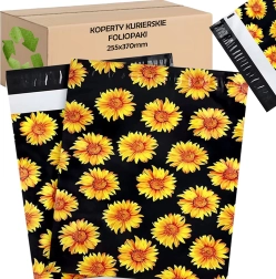 Stylowy nadruk słoneczników na czarnym tle poprawia wrażenia klienta i zamienia każdą przesyłkę w mały prezent.