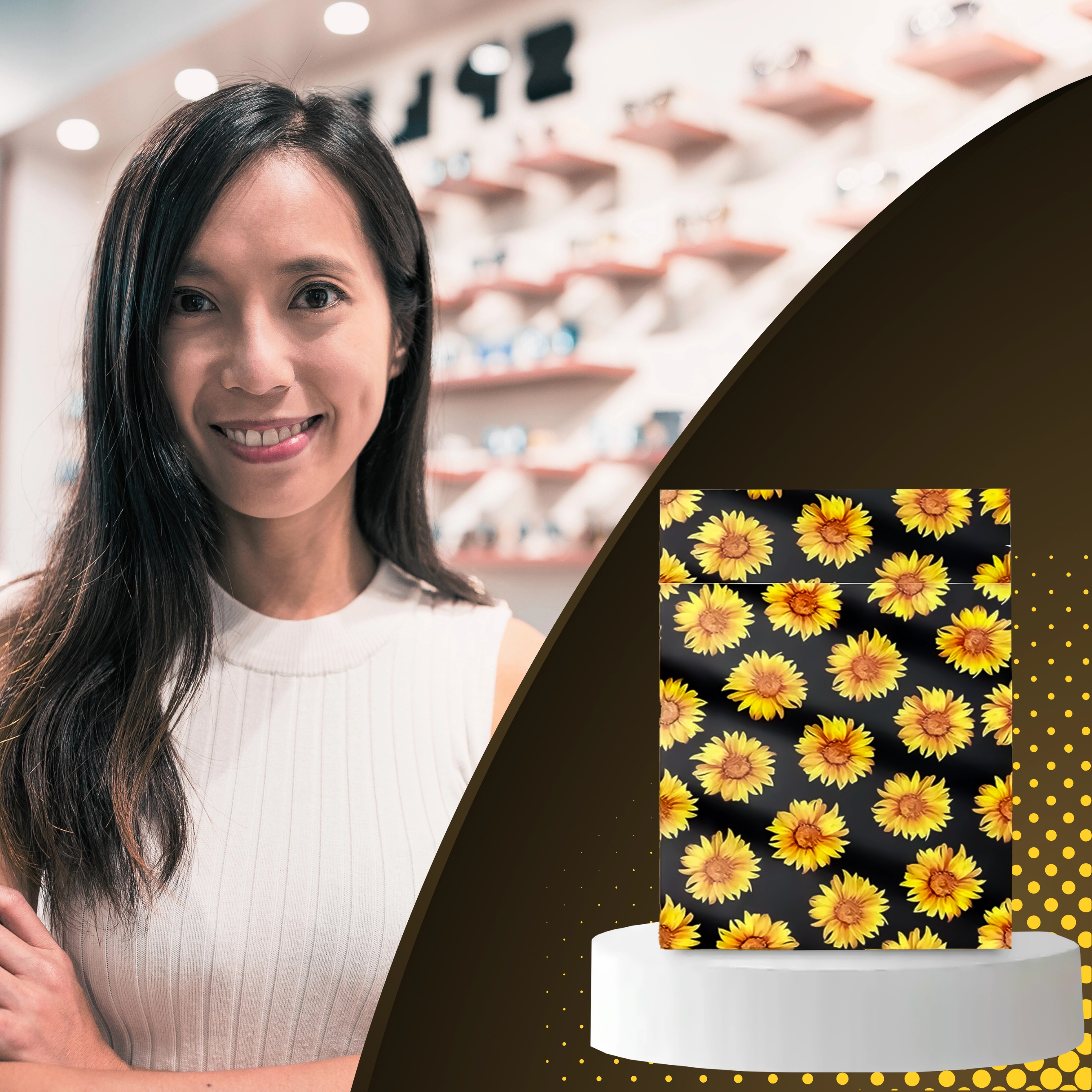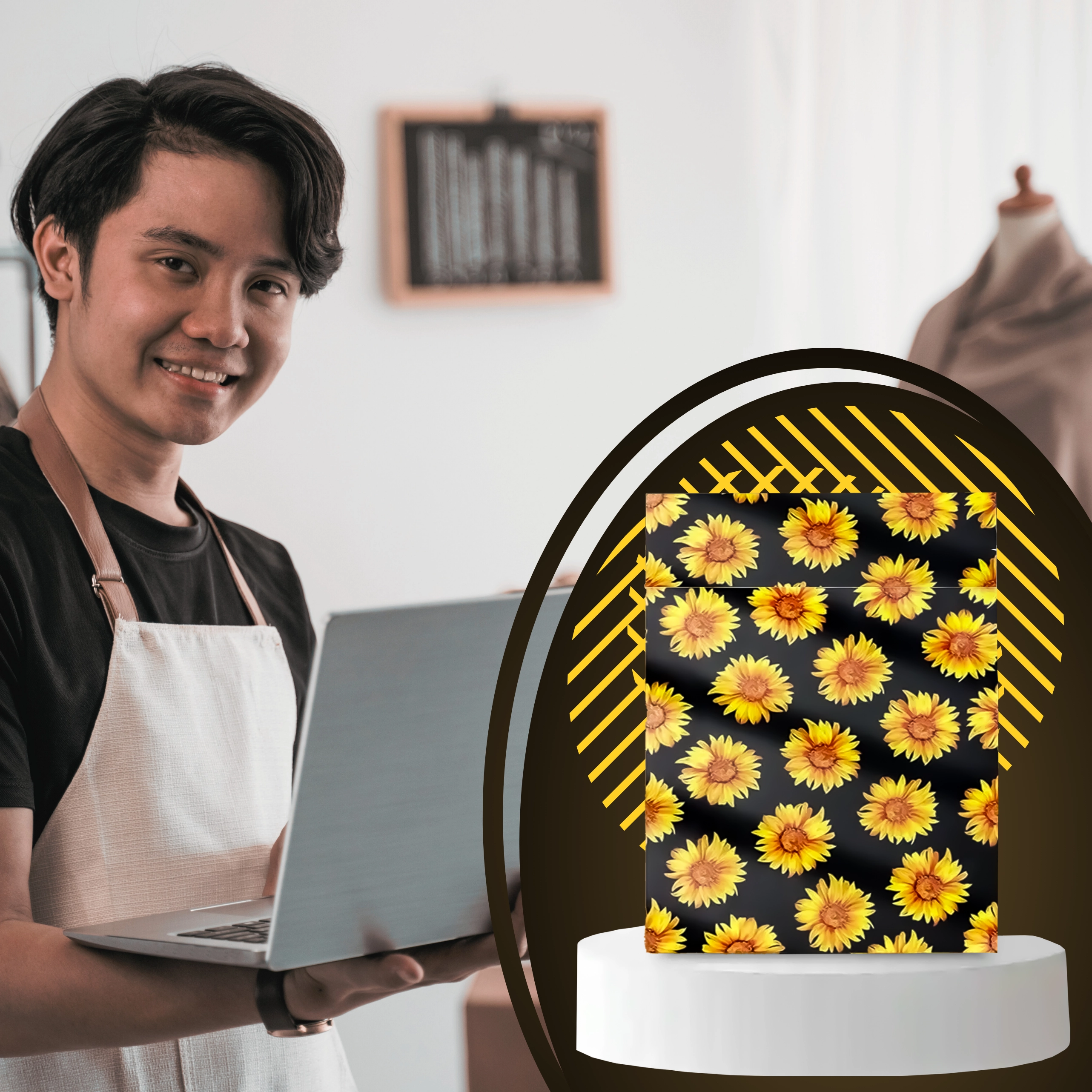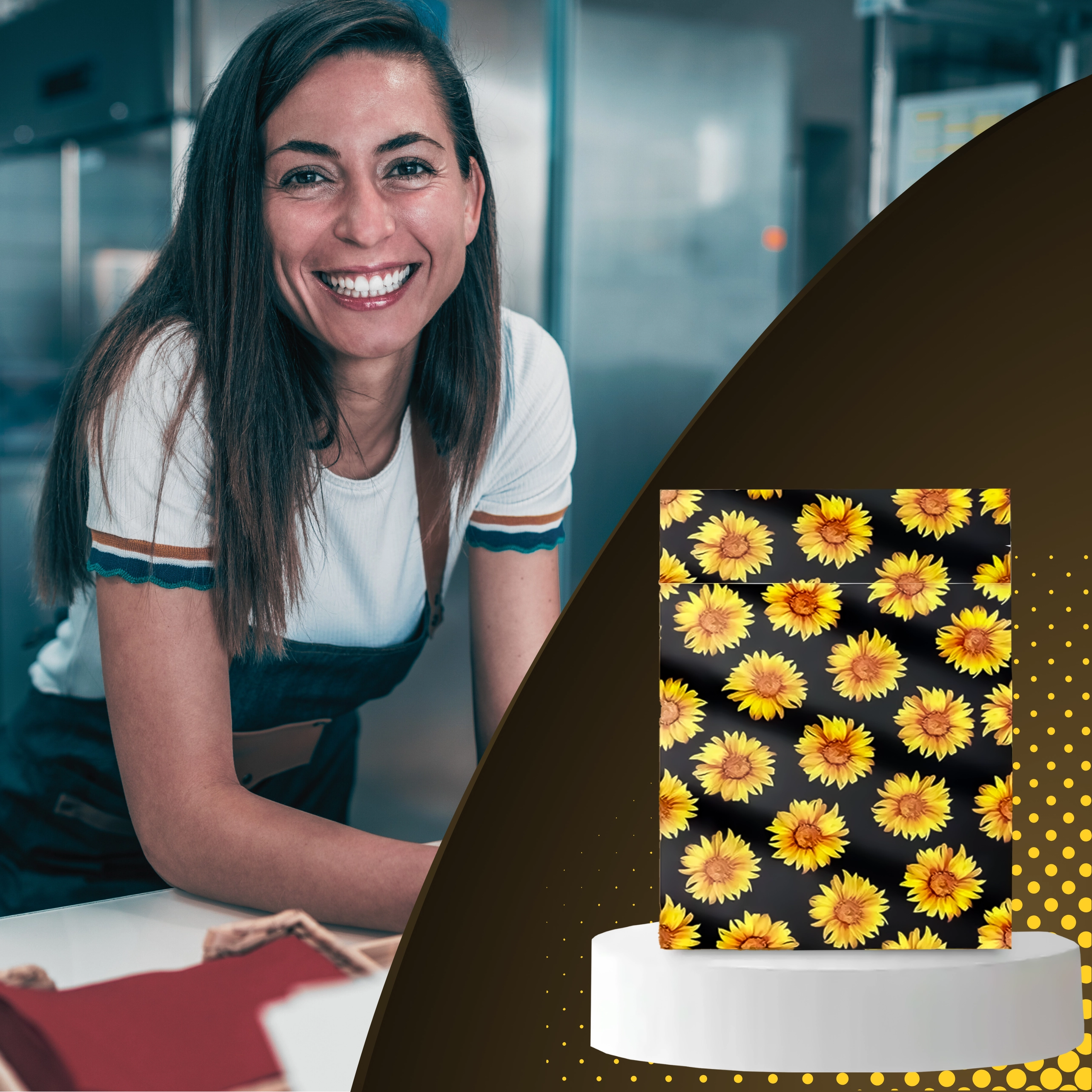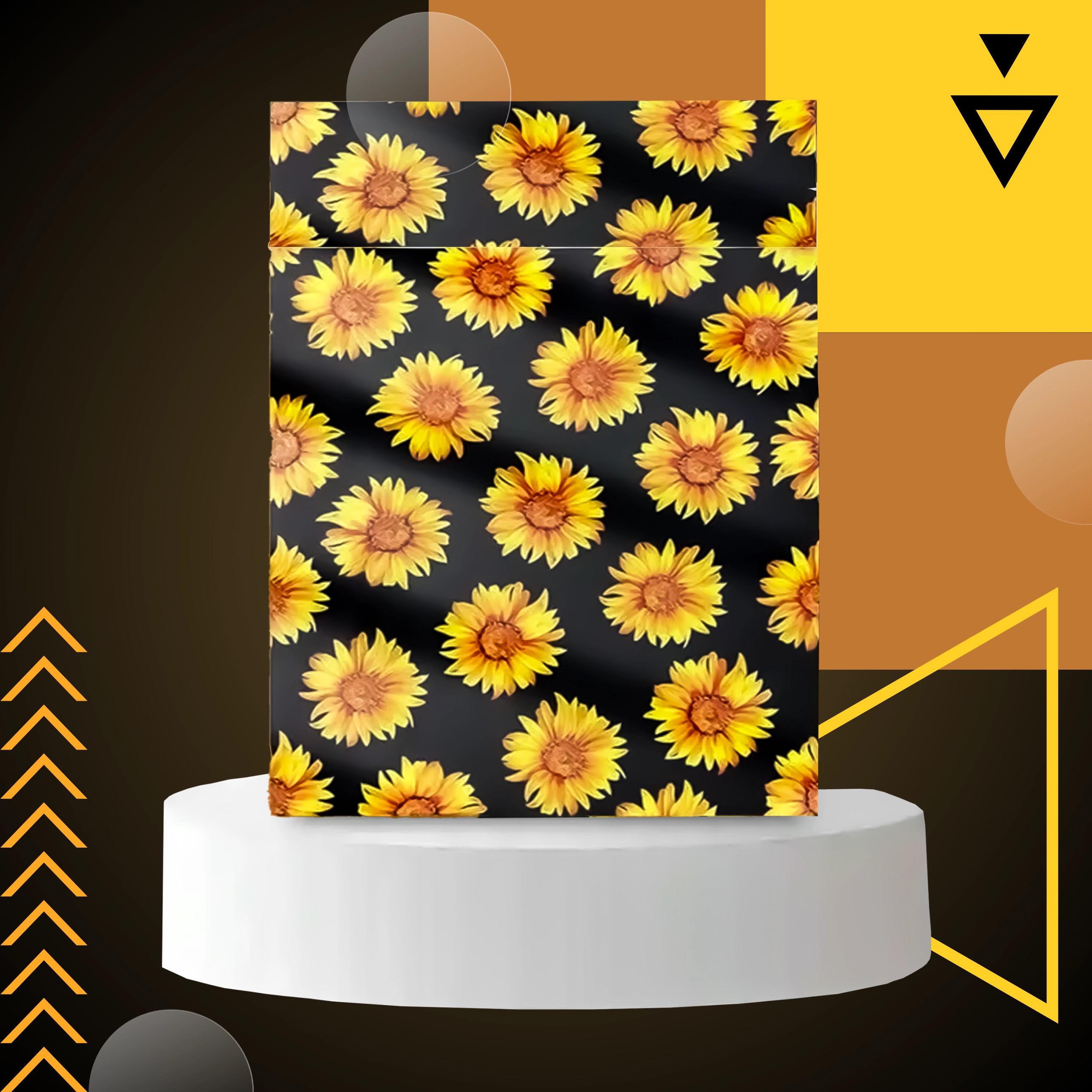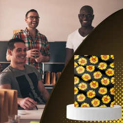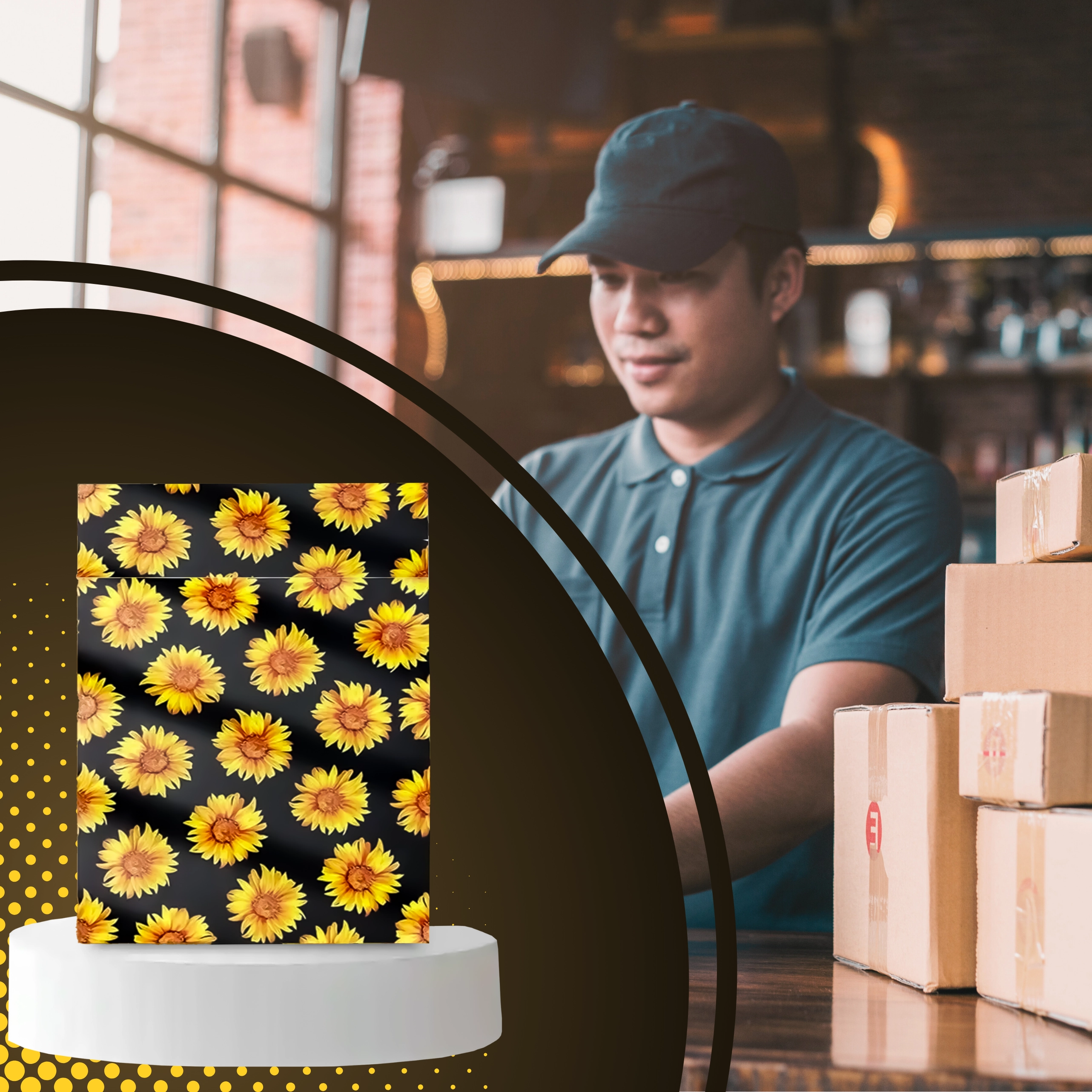 Stylowy nadruk słoneczników na czarnym tle poprawia wrażenia klienta i zamienia każdą przesyłkę w mały prezent.