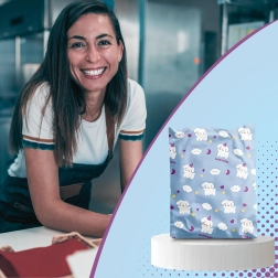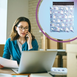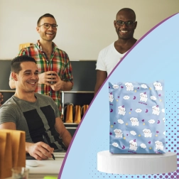 - Stylowy design: niebieski nadruk z psami i chmurkami przyciąga uwagę klientów.
