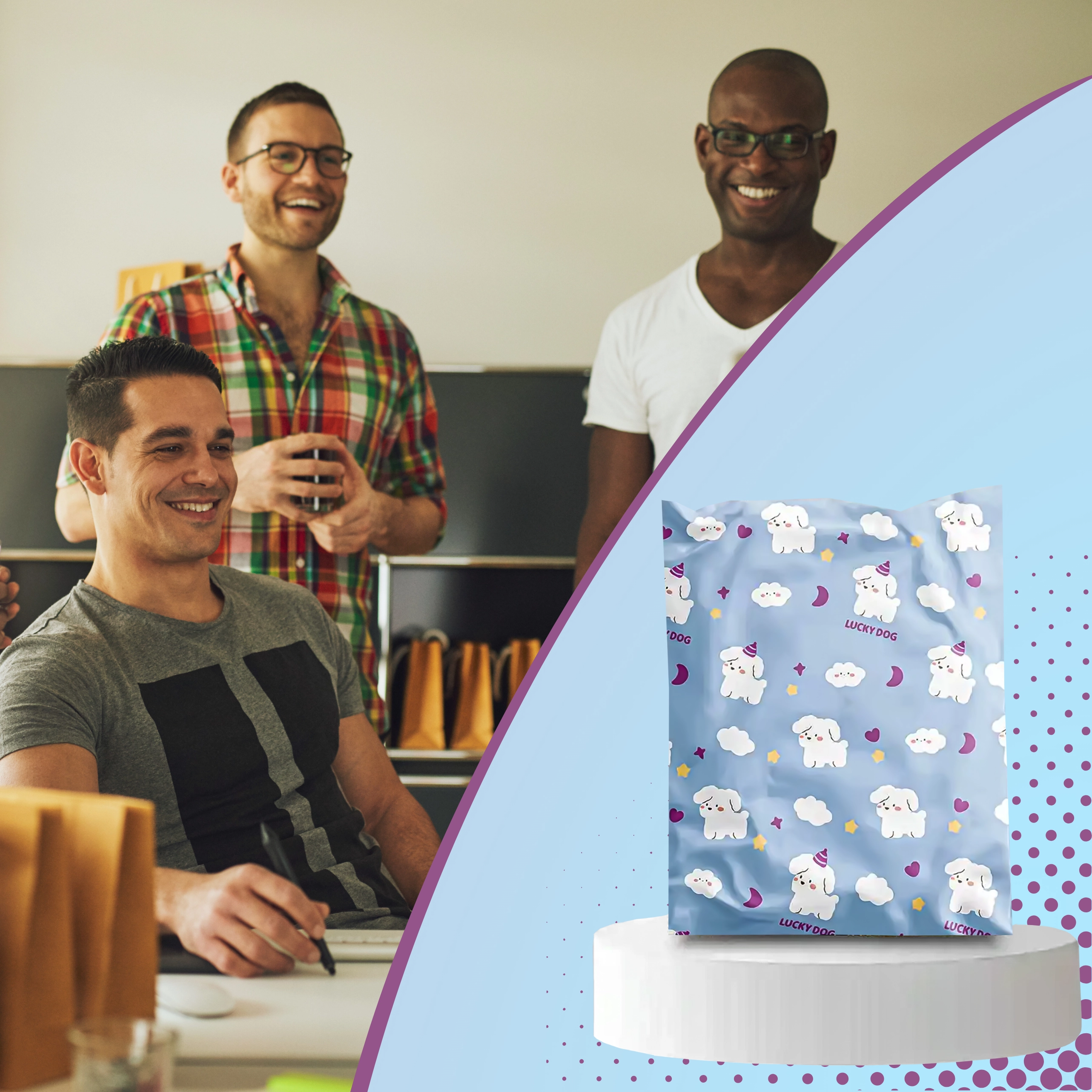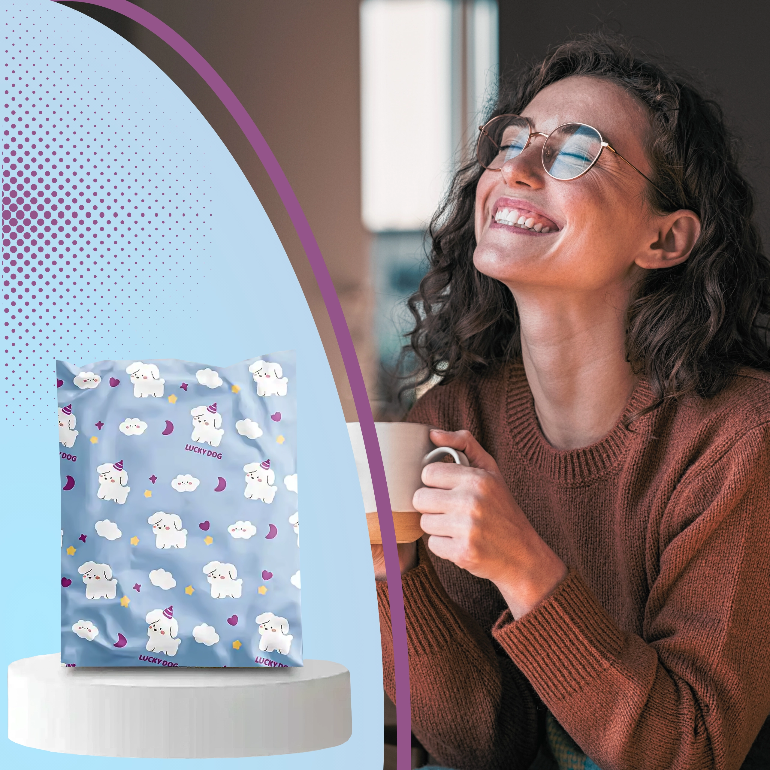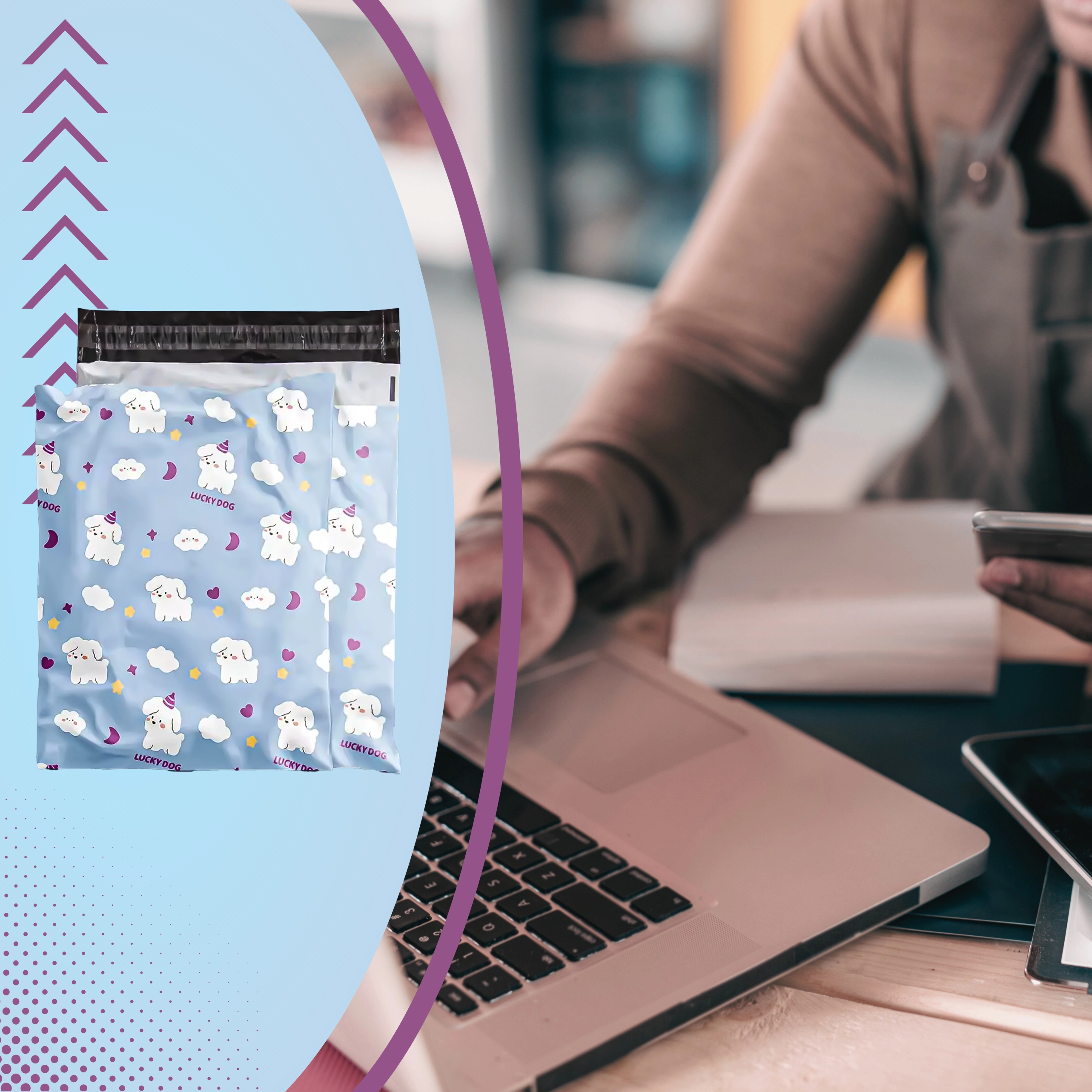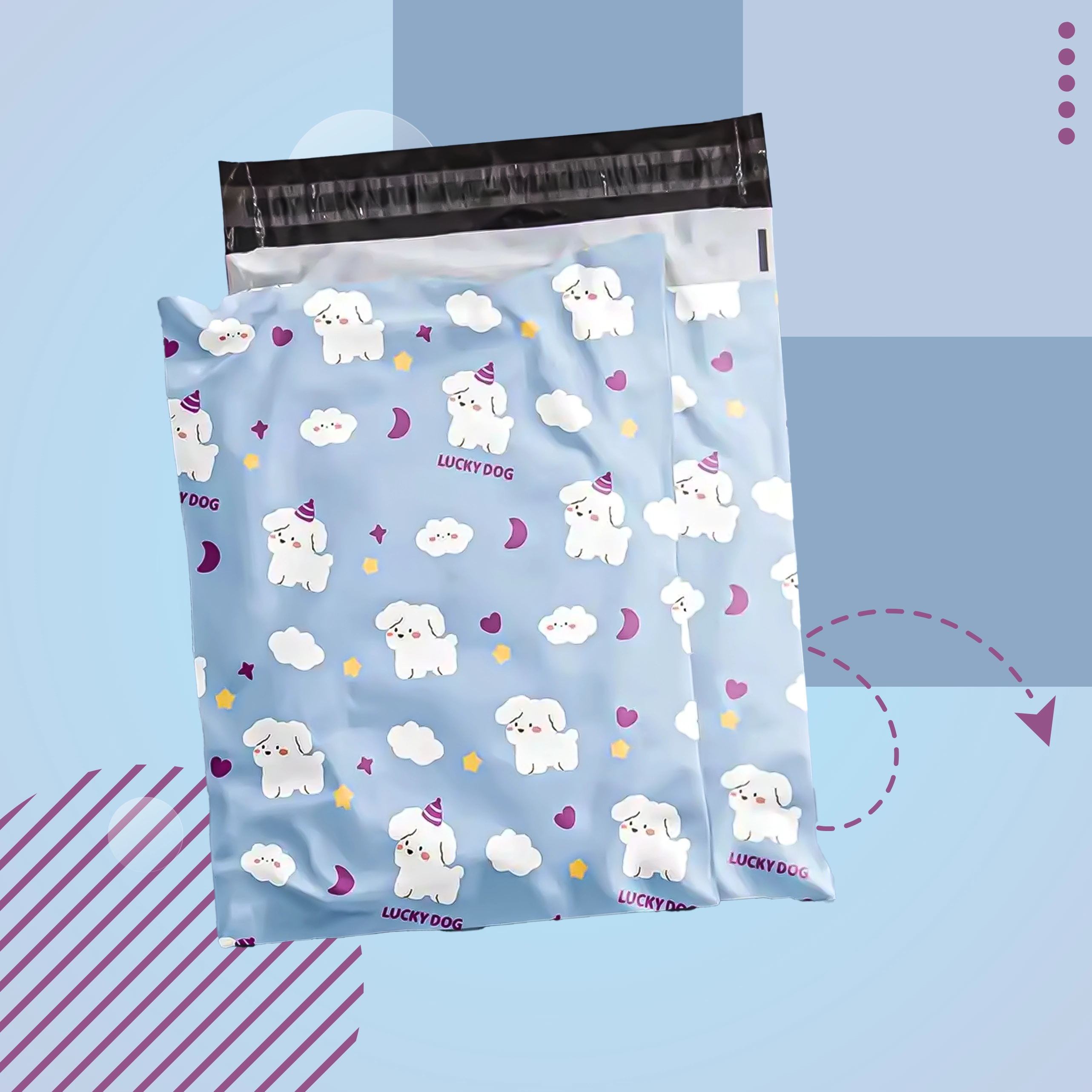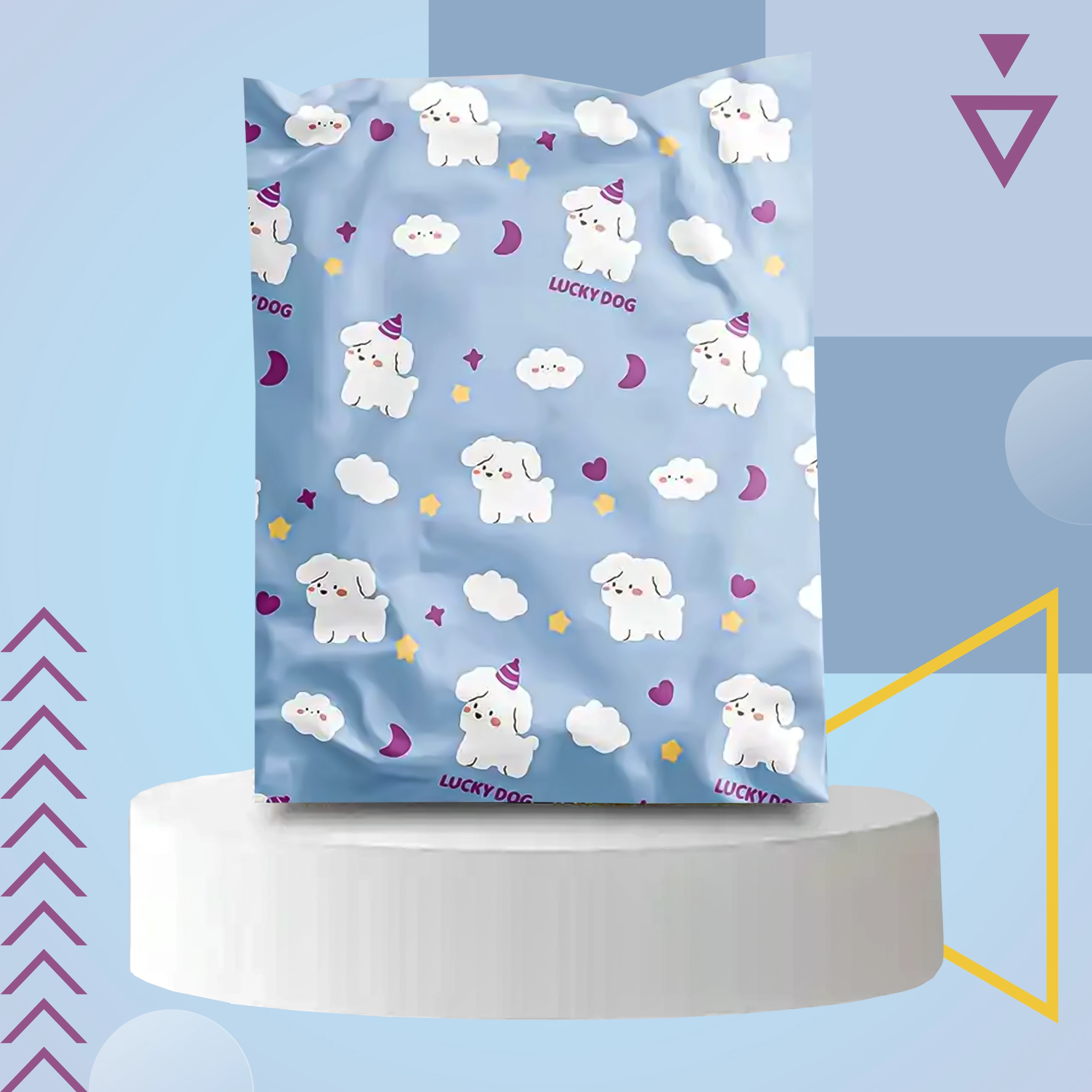 Zabawny niebieski motyw z psami i chmurkami nadaje paczkom charakter i wspiera wizerunek Twojego sklepu.