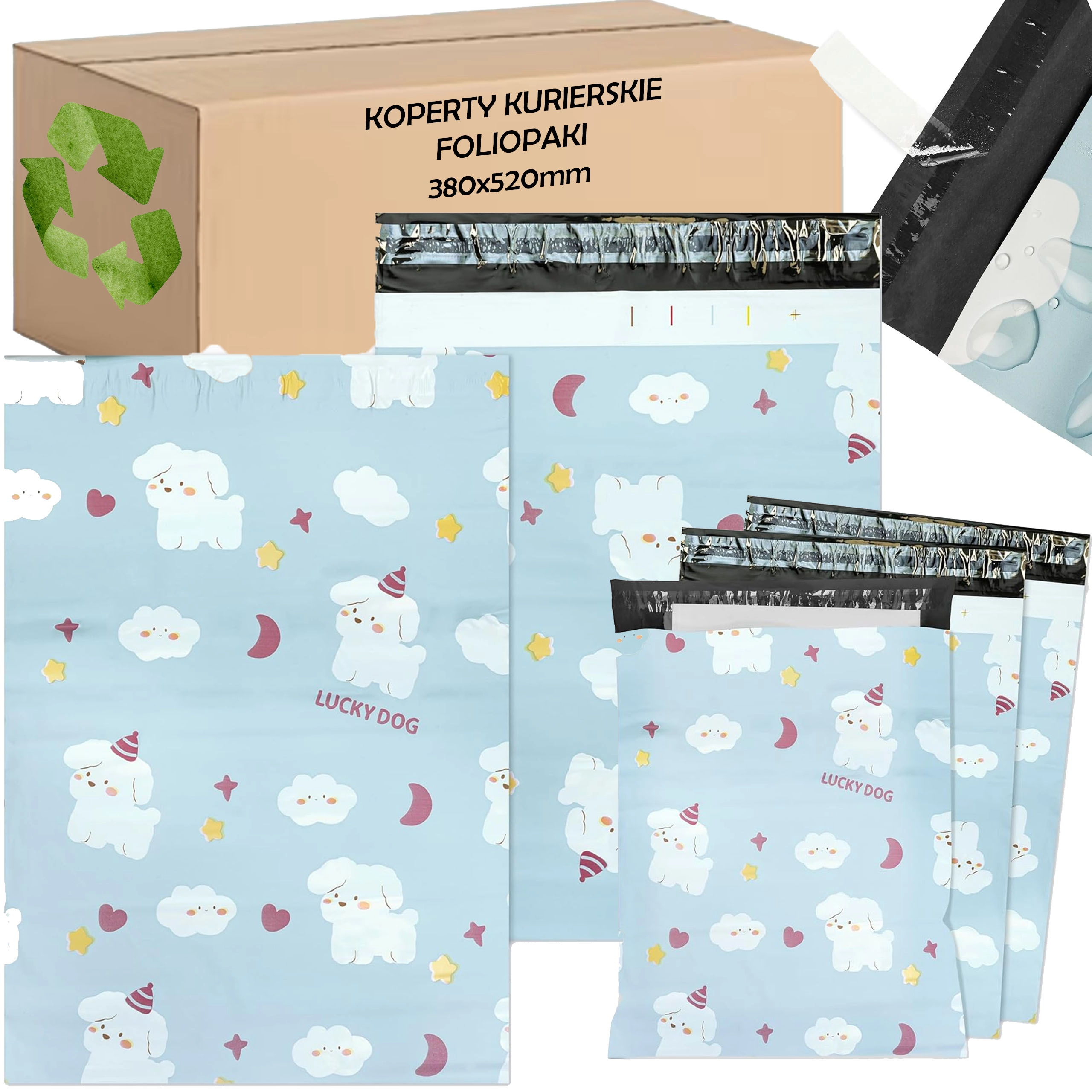 Praktyczne i wytrzymałe koperty kurierskie z folii do bezpiecznego pakowania i szybkiej wysyłki. Format 380 × 520 mm, opakowanie 50 szt., z paskiem samoprzylepnym do szybkiego zamykania i ochroną przed nieuprawnionym otwarciem. Stylowy motyw LUCKY DOG nadaje przesyłkom wyjątkowy wygląd.