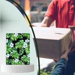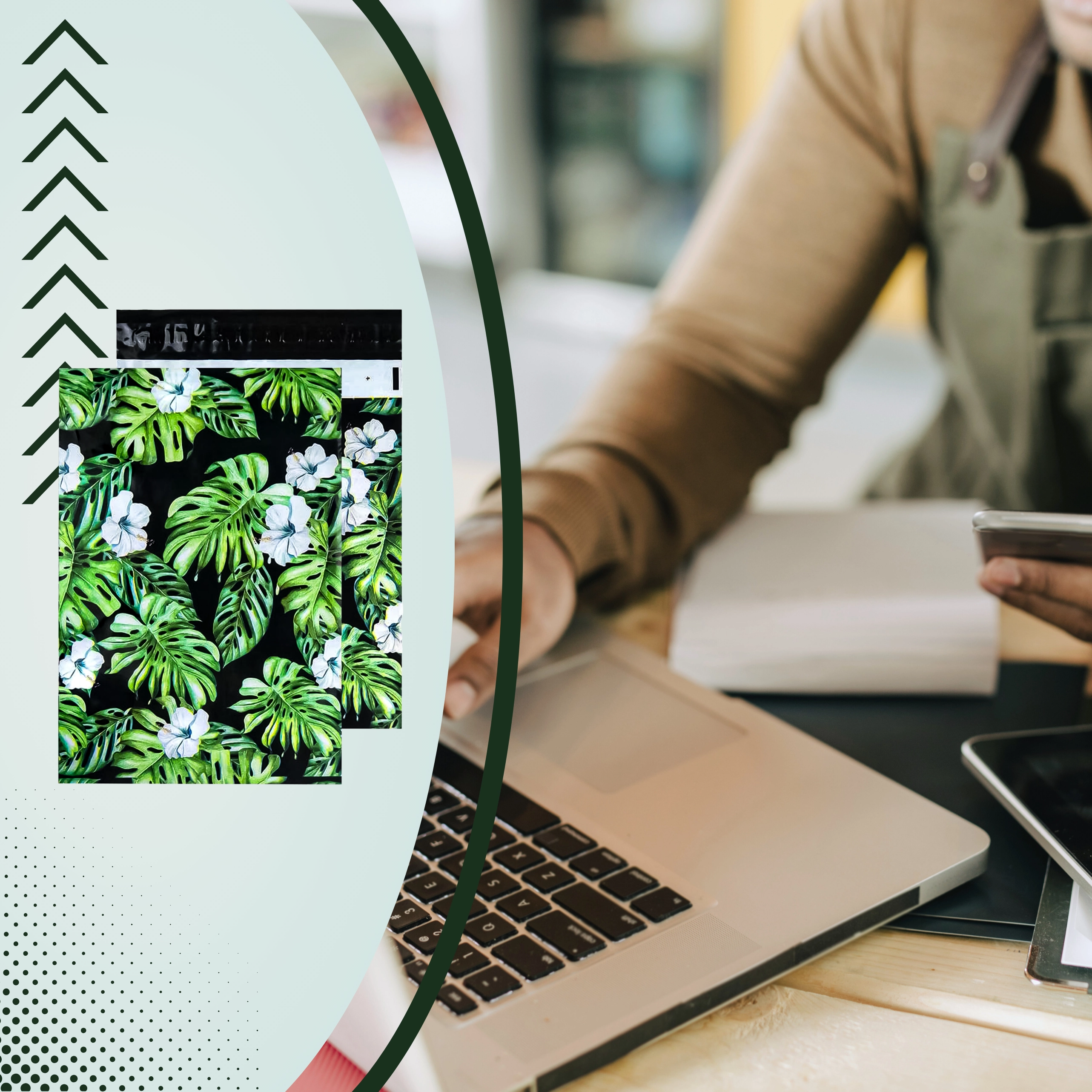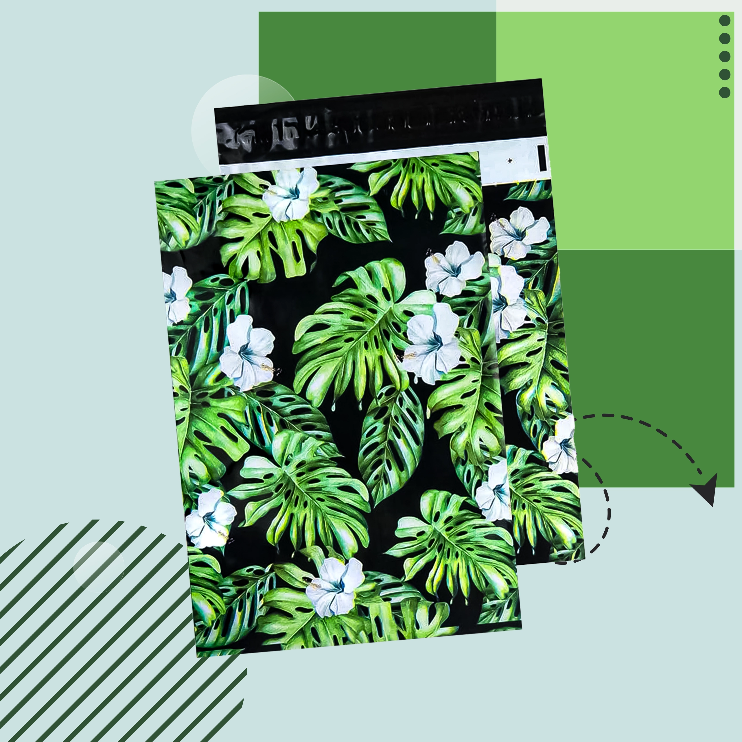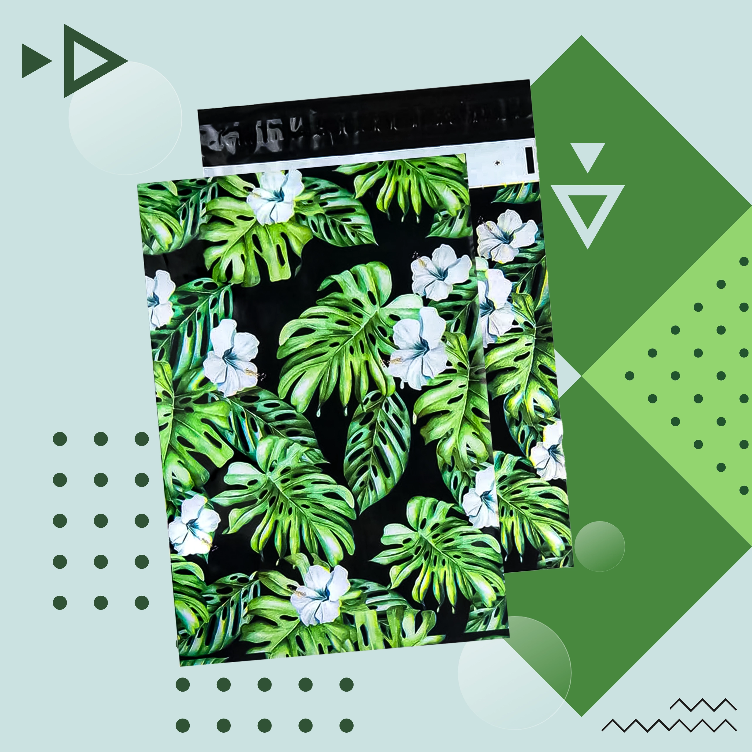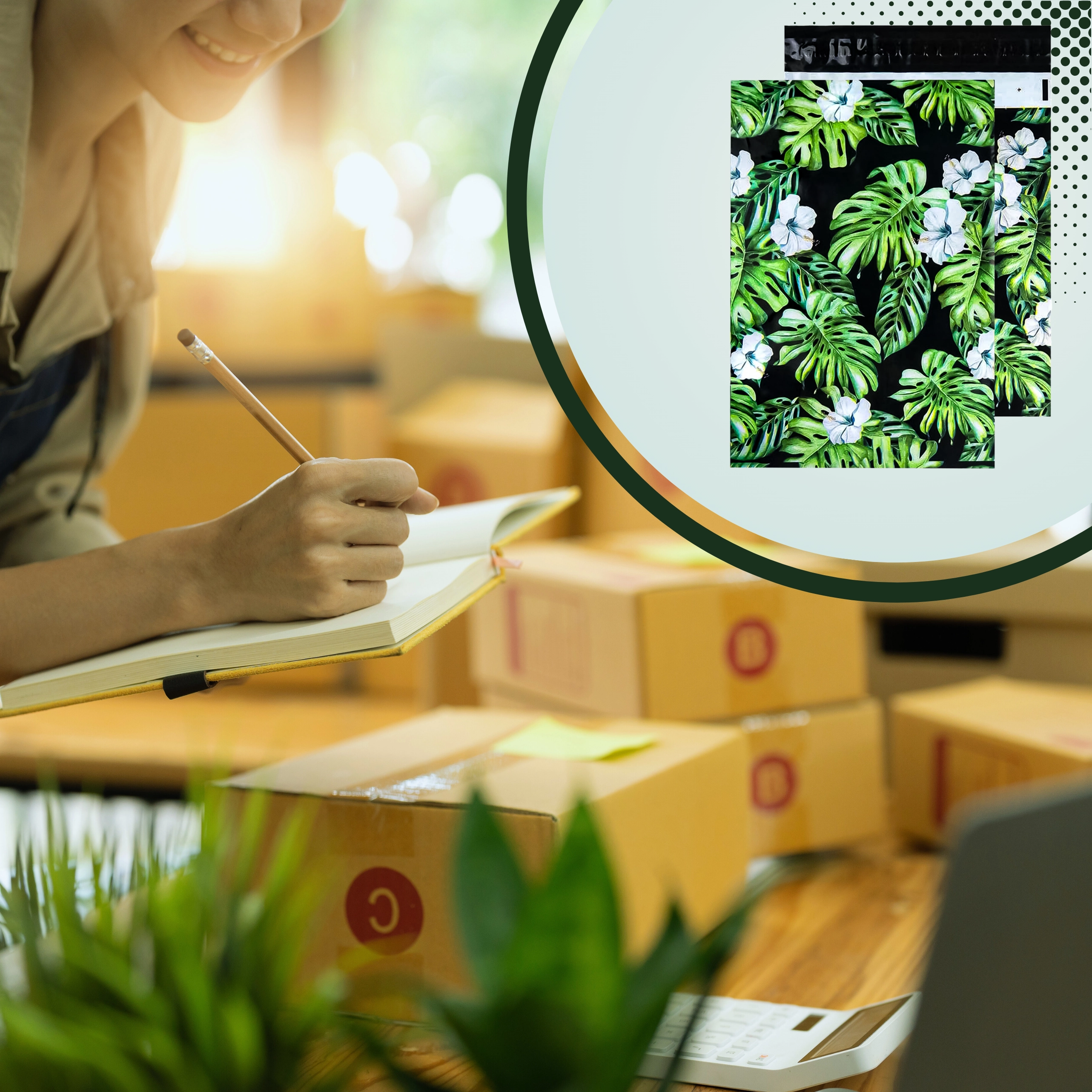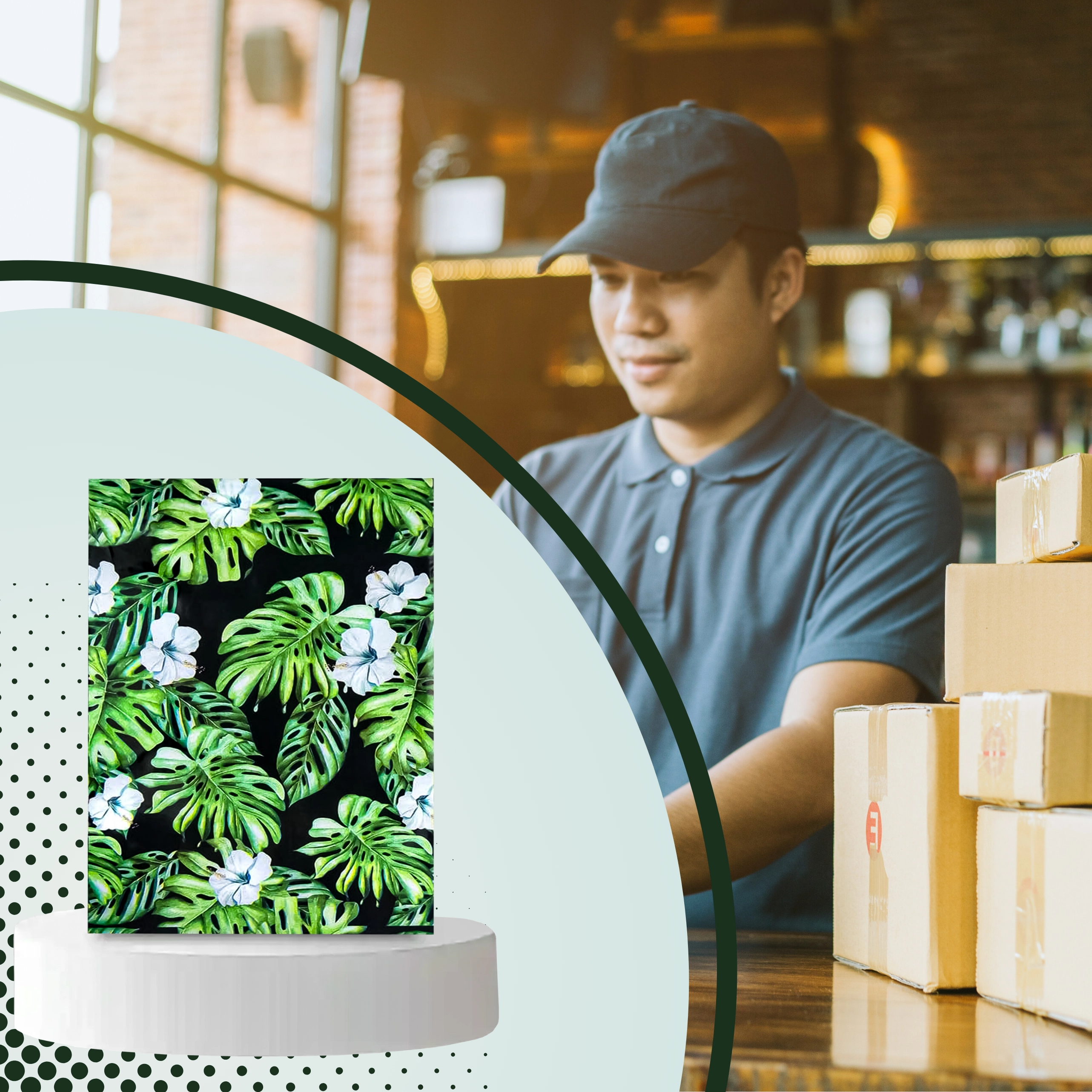 Nadruk z motywem liści i kwiatów na ciemnym tle nadaje Twoim przesyłkom wyrazisty wygląd i wzmacnia branding przy doręczeniu.