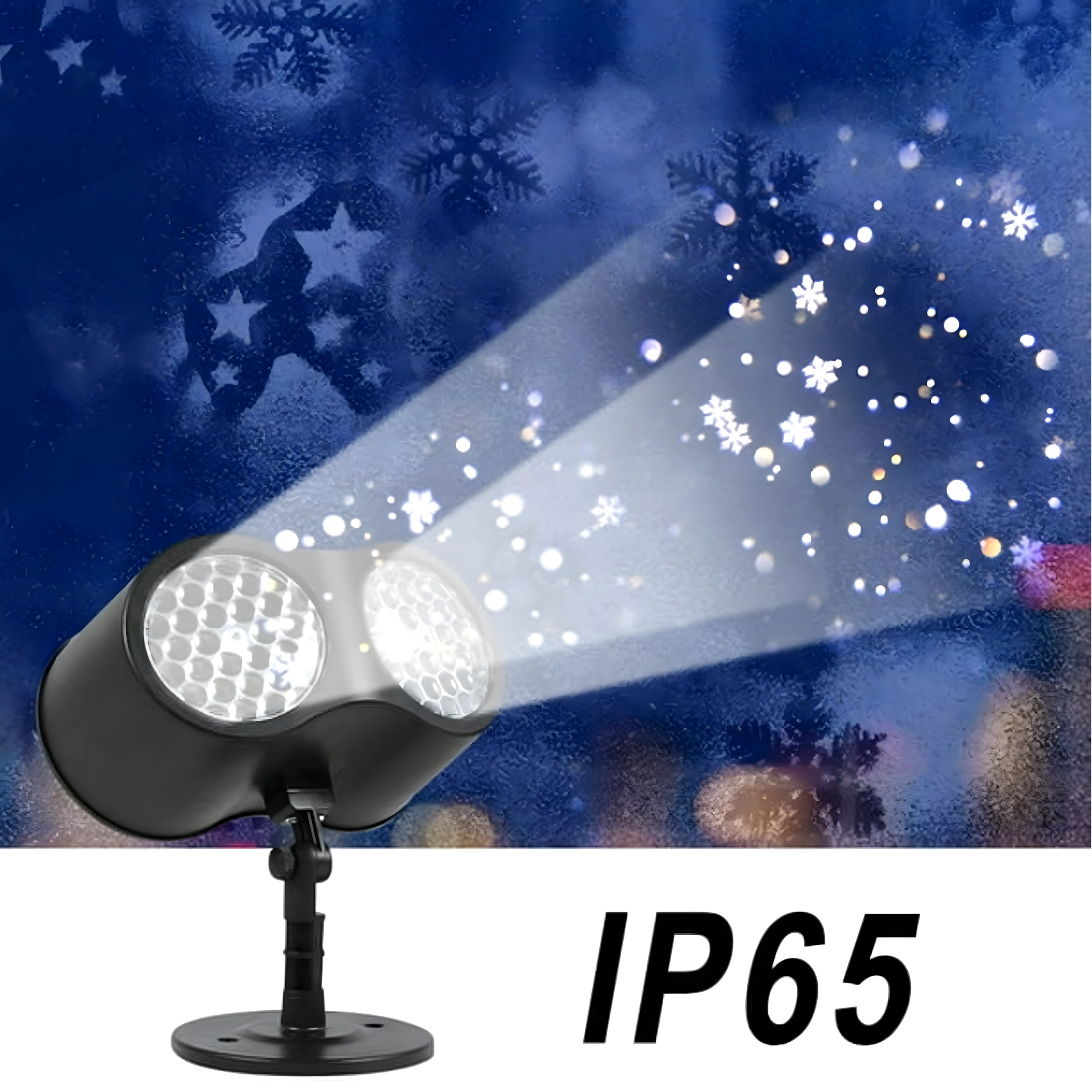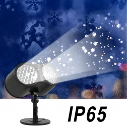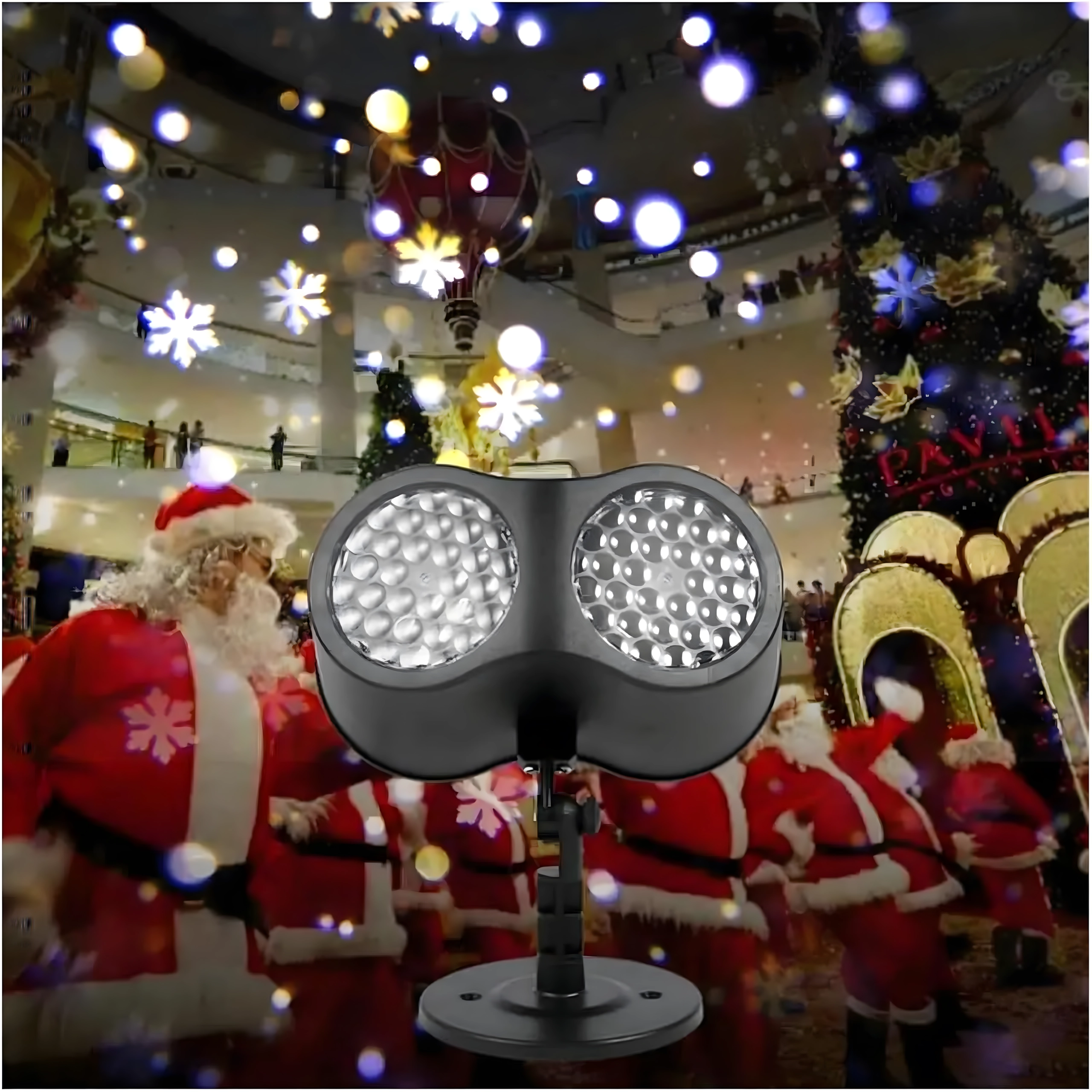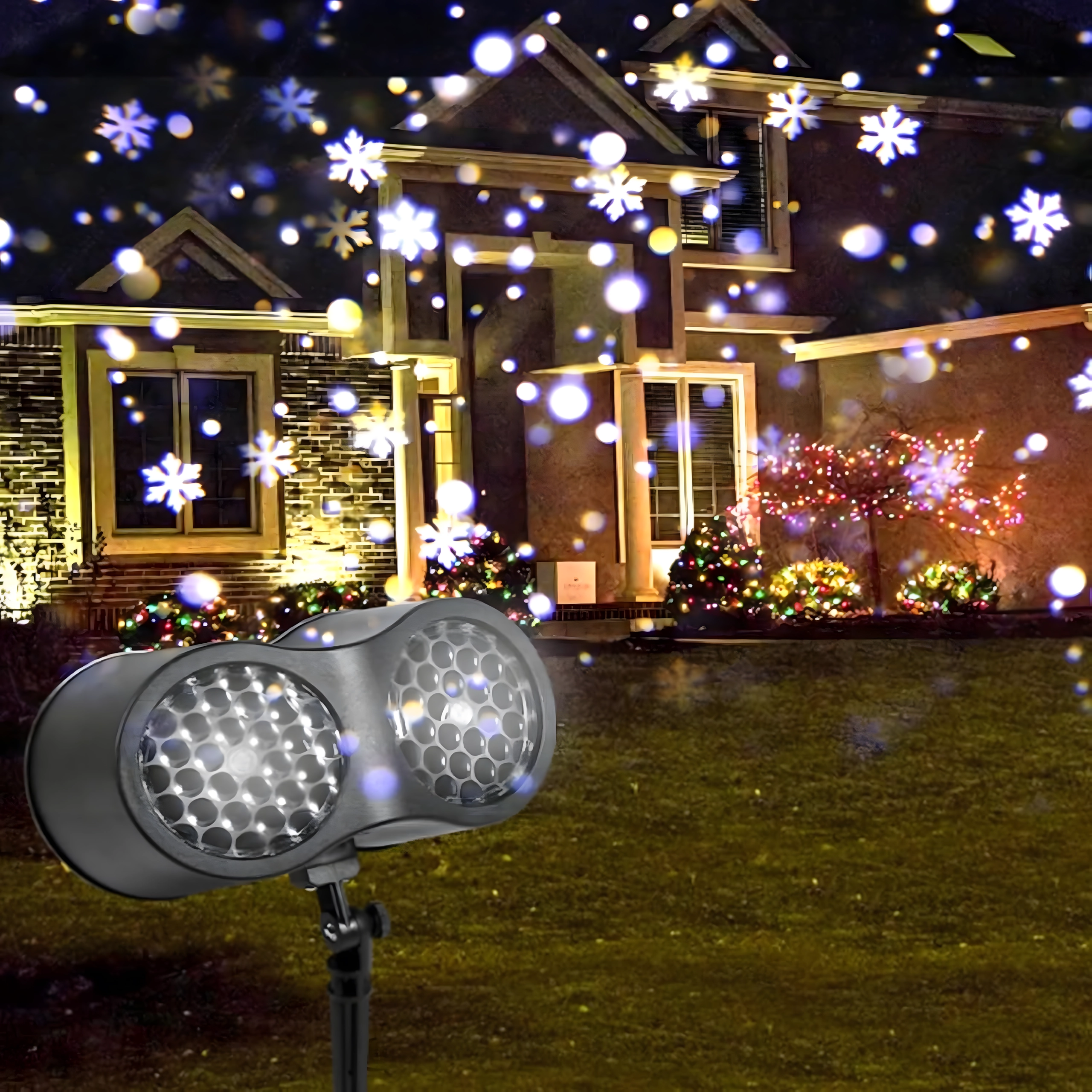 Podwójna optyka LED wyświetla jasne, dynamiczne płatki i kropki na dużych powierzchniach ścian i elewacji – idealne do szybkiej, świątecznej dekoracji bez drabin i łańcuchów.