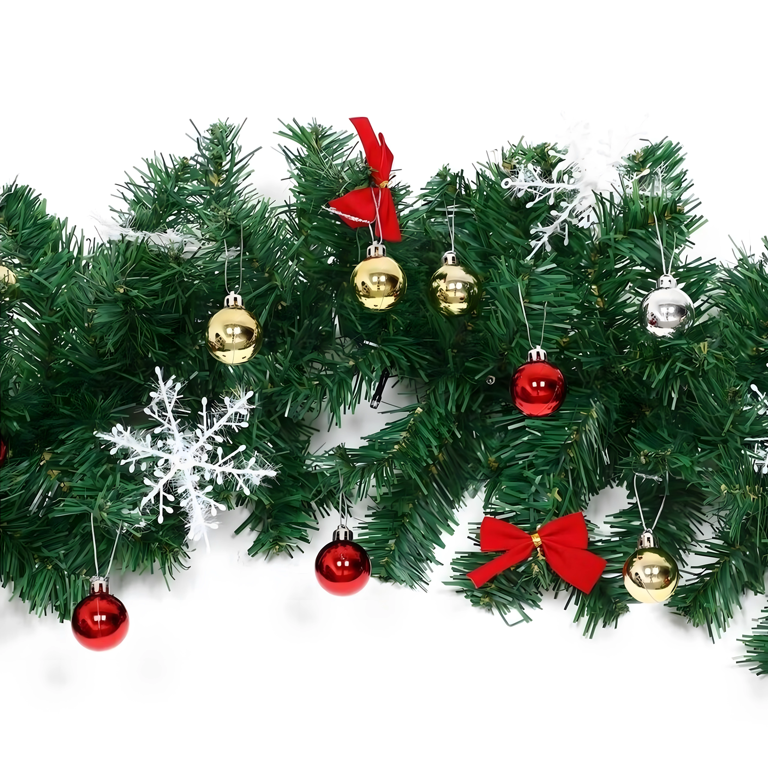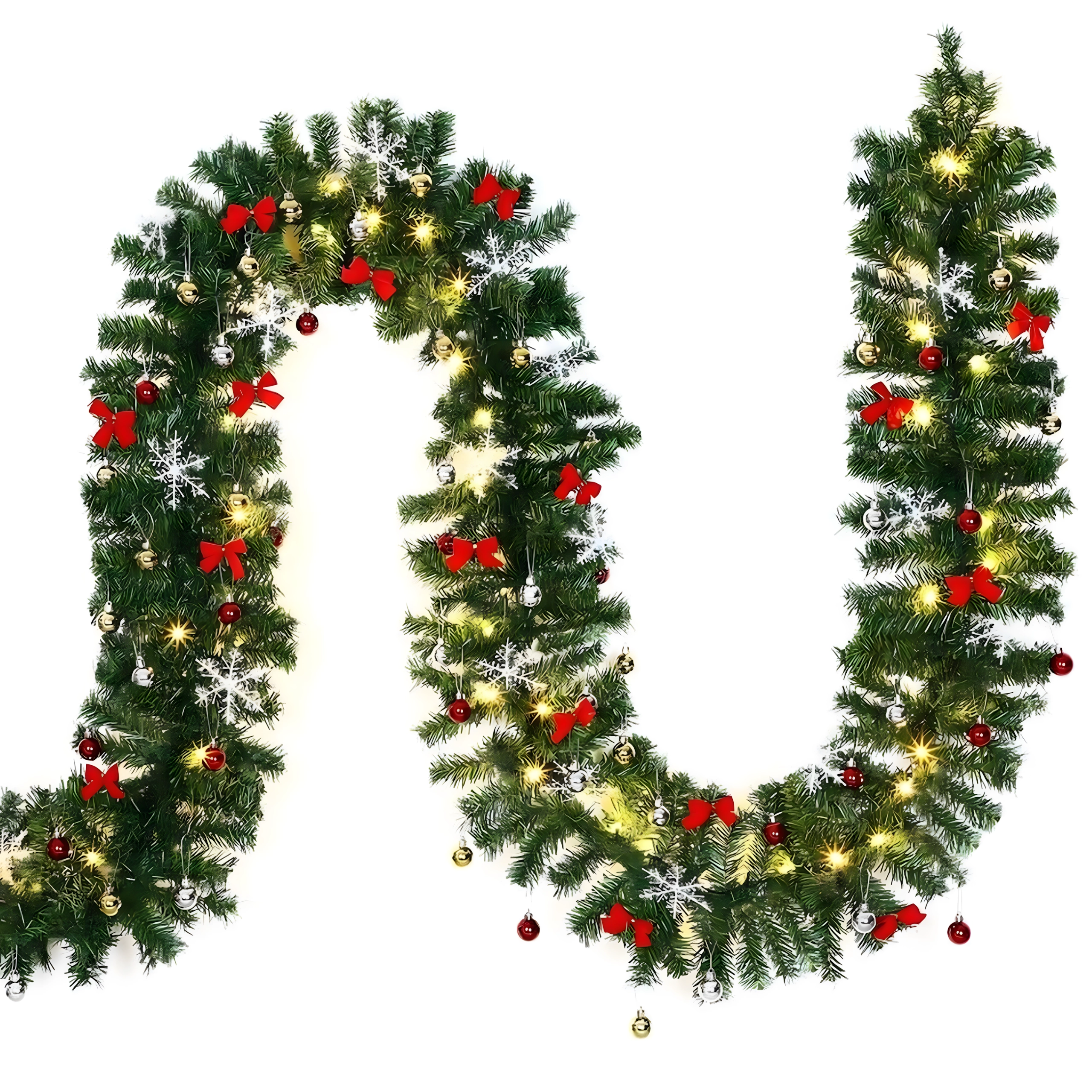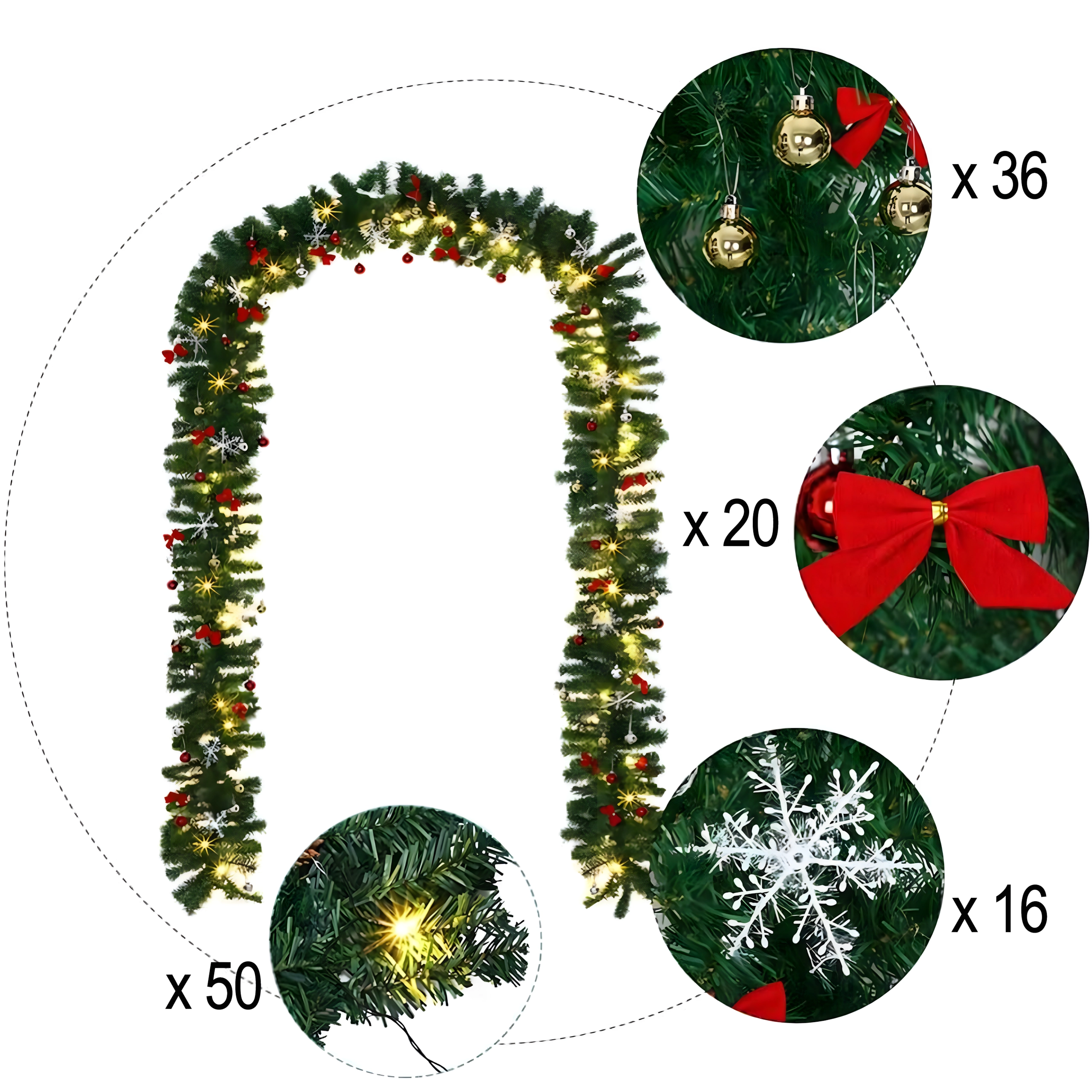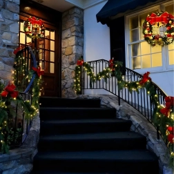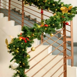 Ta elegancka świąteczna girlanda zamieni każde wejście, balustradę czy półkę kominka w świąteczny, wyrazisty akcent. Wbudowane ciepłe oświetlenie LED zapewnia przyjemną, przytulną iluminację, a ponadczasowe dekoracje w postaci bombek, kokard i śnieżynek gwarantują odświętny wygląd bez wysiłku.
