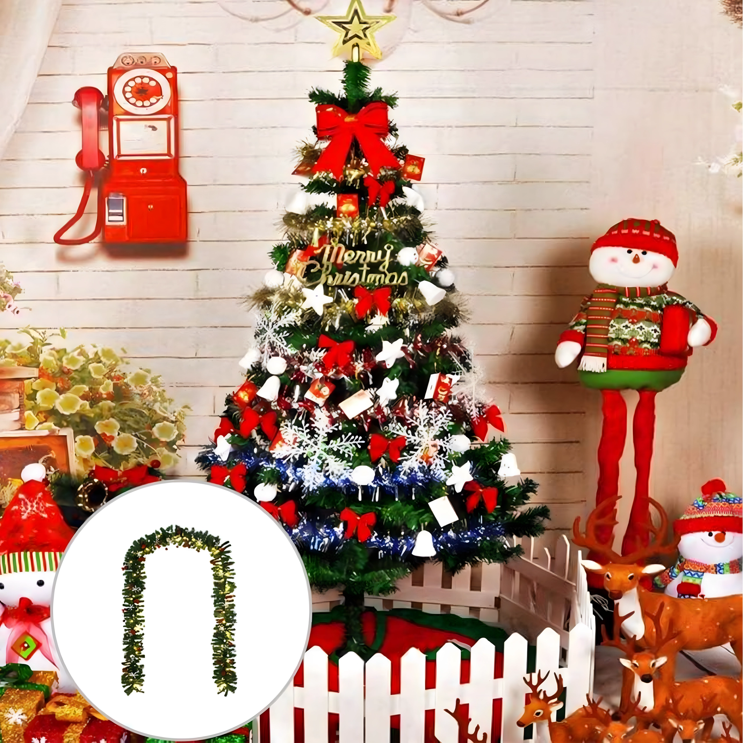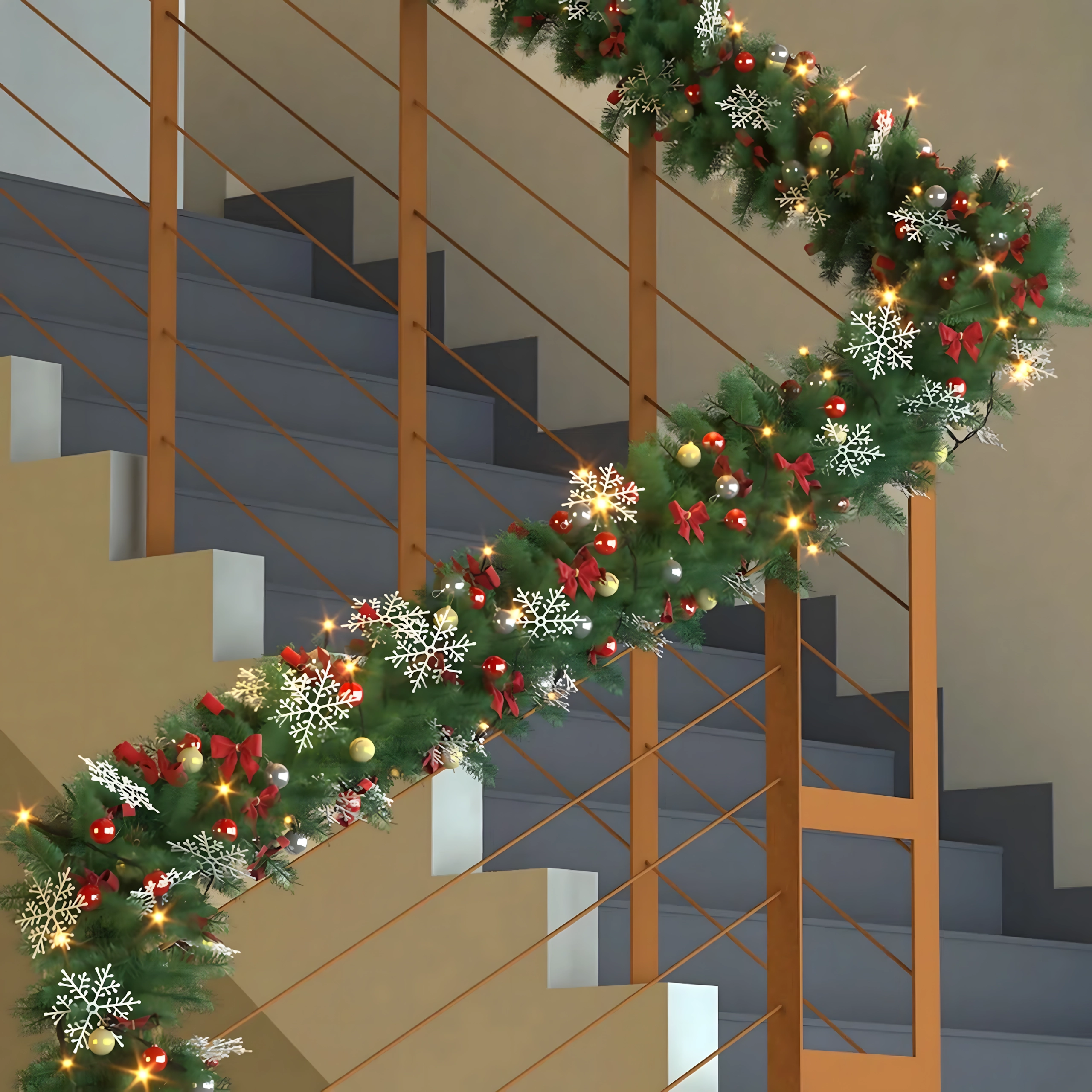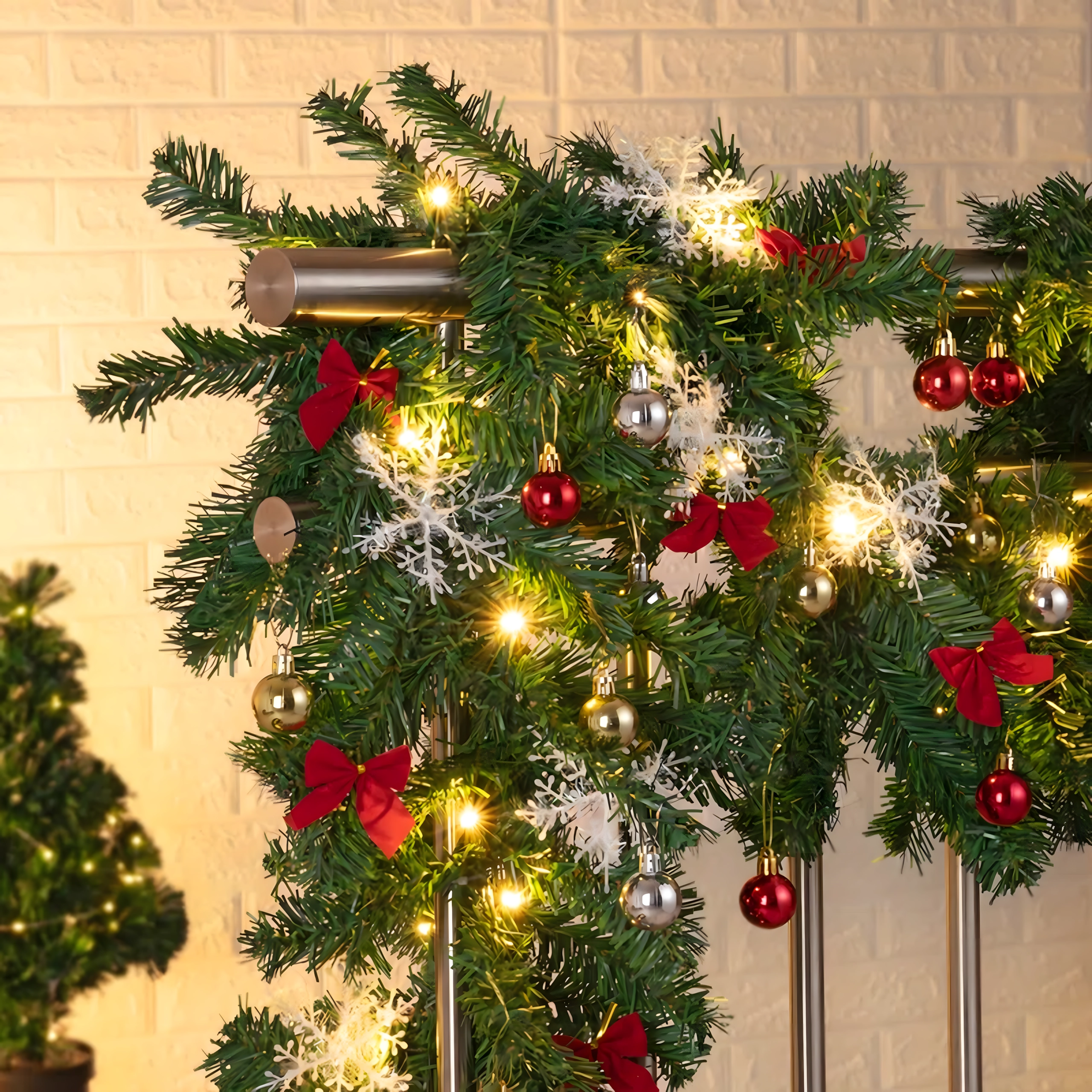 Ta elegancka świąteczna girlanda zamieni każde wejście, balustradę czy półkę kominka w świąteczny, wyrazisty akcent. Wbudowane ciepłe oświetlenie LED zapewnia przyjemną, przytulną iluminację, a ponadczasowe dekoracje w postaci bombek, kokard i śnieżynek gwarantują odświętny wygląd bez wysiłku.