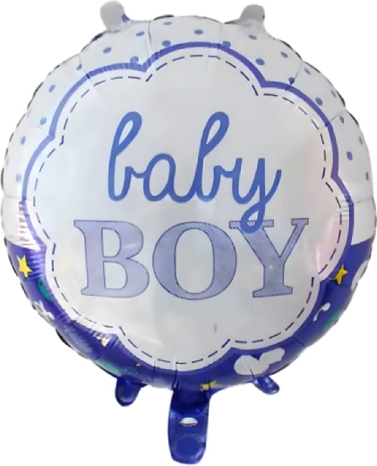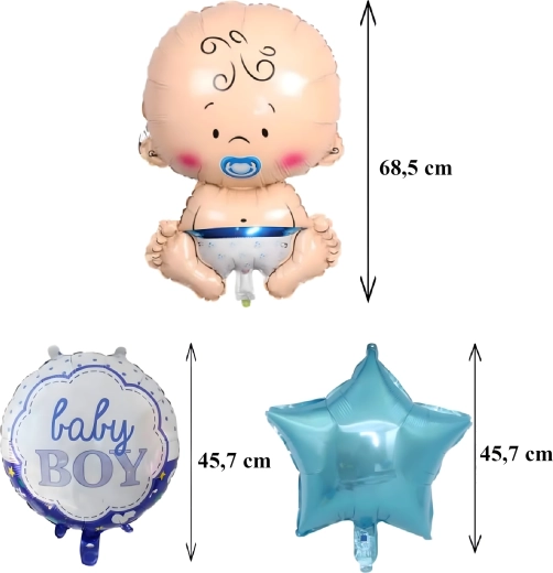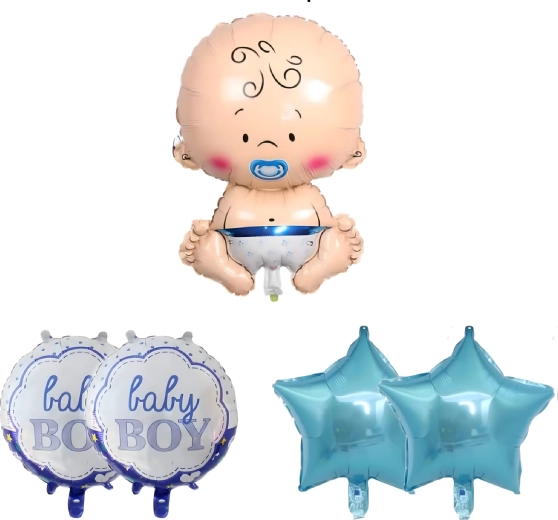 Stylowy zestaw balonów dla chłopca z motywem niemowlęcia, gwiazdek i napisem Baby Boy. Idealna dekoracja na baby shower, powitanie noworodka, sesję zdjęciową oraz ozdobę pokoju dziecięcego.