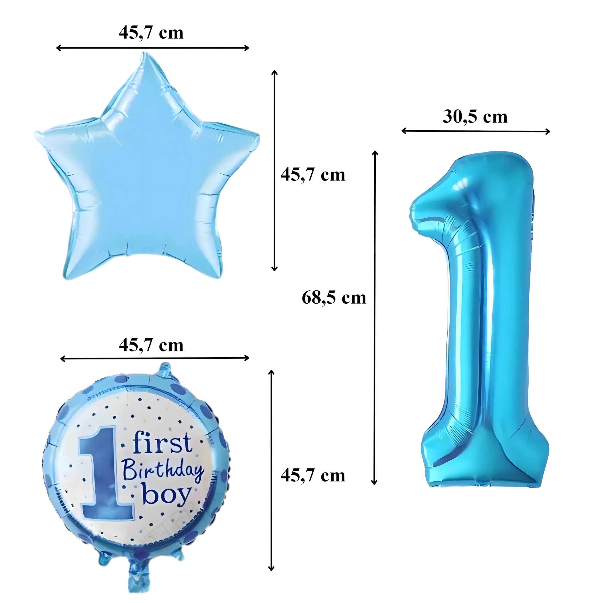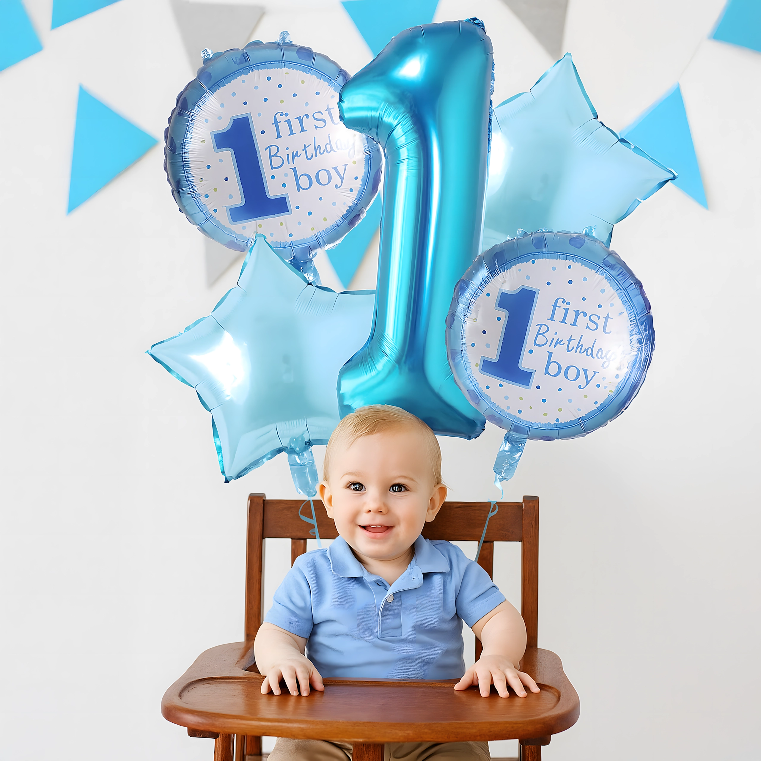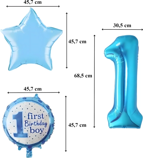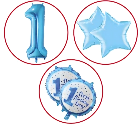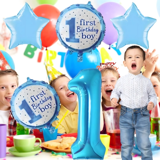 Stwórz magiczną atmosferę pierwszej uroczystości! Ten zestaw balonów dla chłopca łączy motyw cyfry 1, gwiazdki oraz napis First Birthday Boy, dzięki czemu doskonale sprawdzi się na urodzinowym przyjęciu, w fotokąciku i jako ozdoba pokoju dziecięcego.
