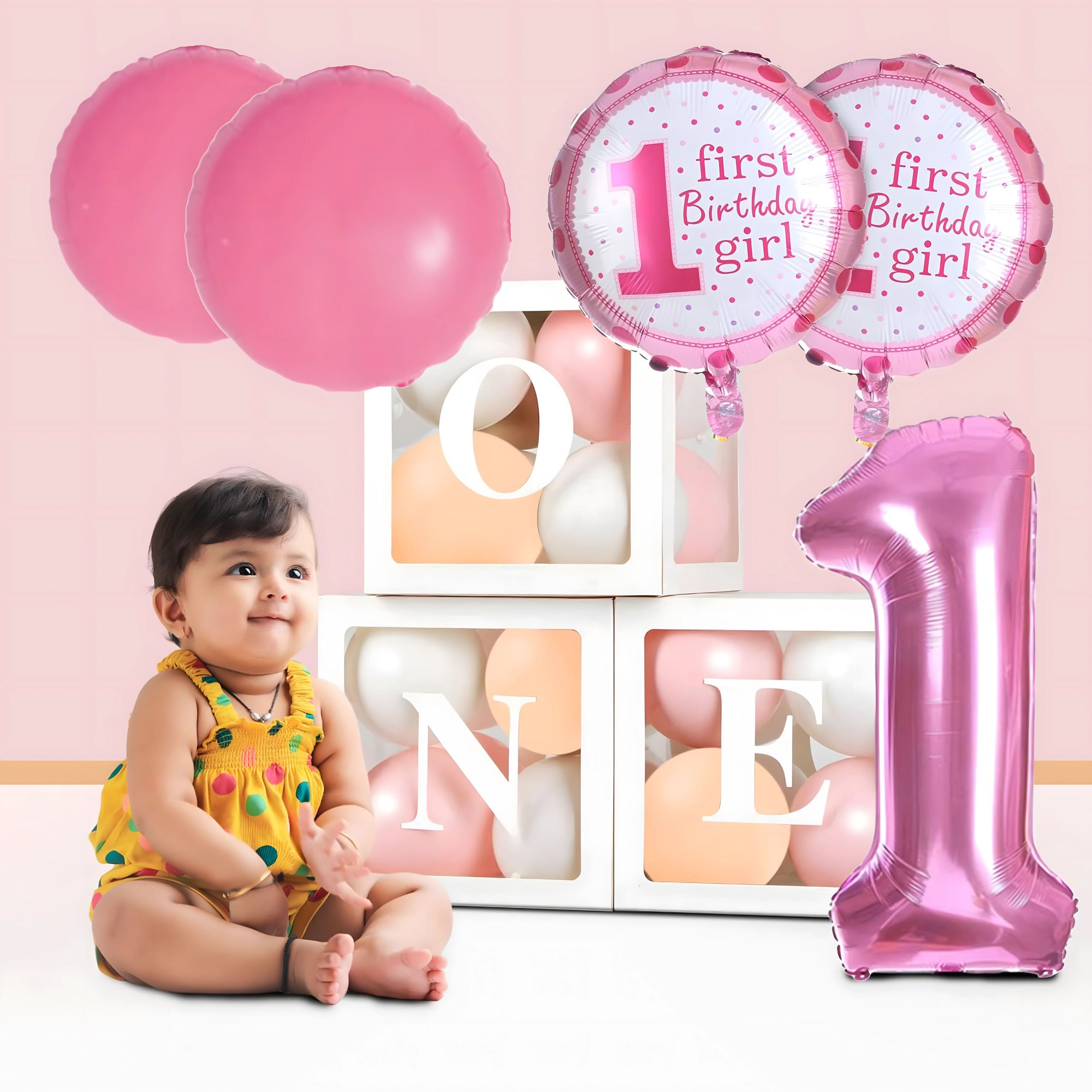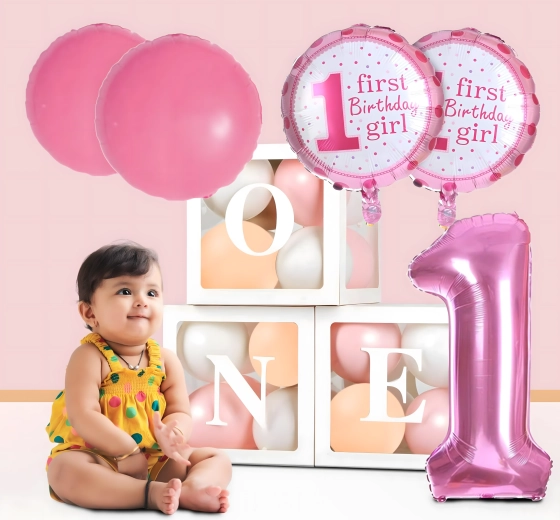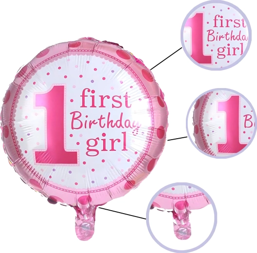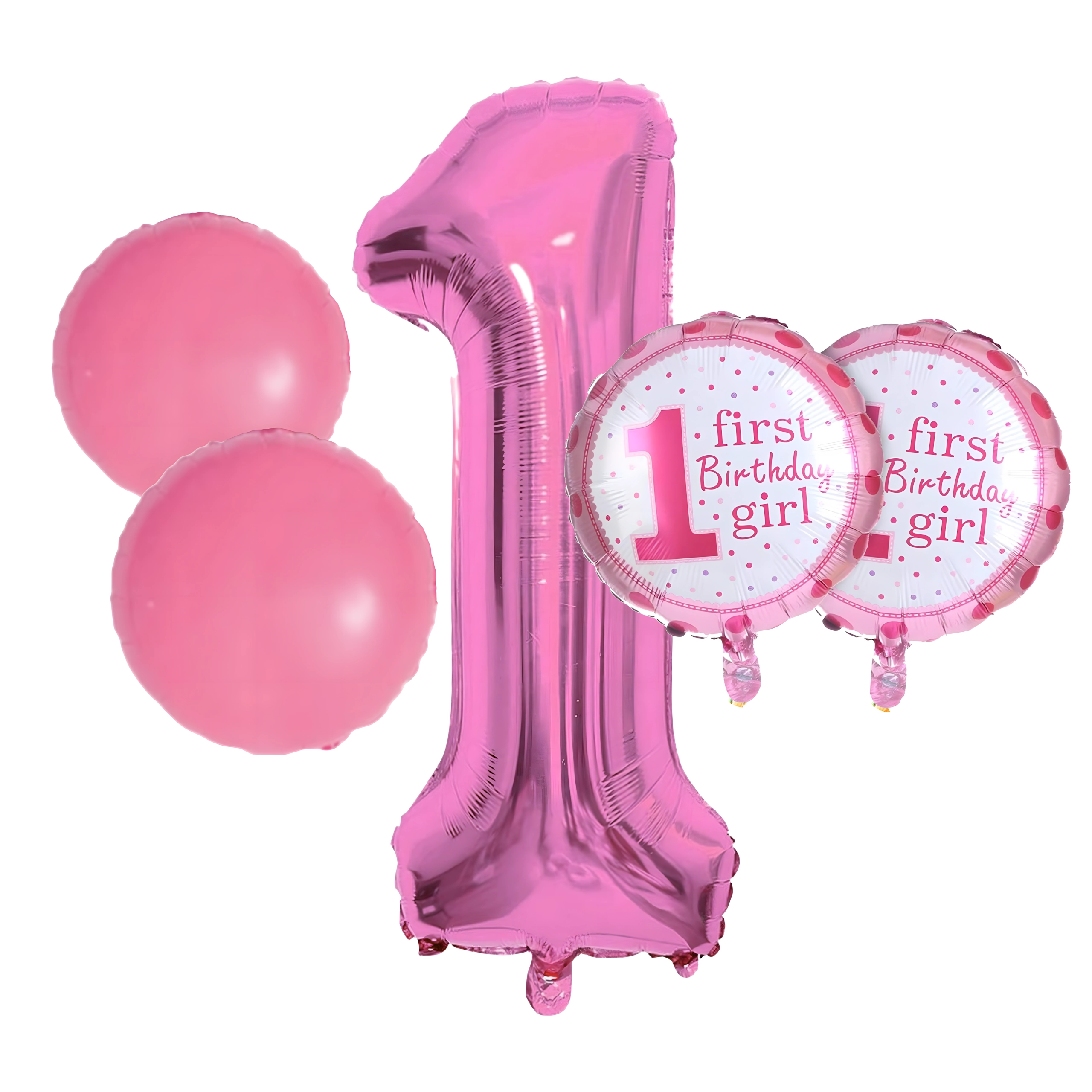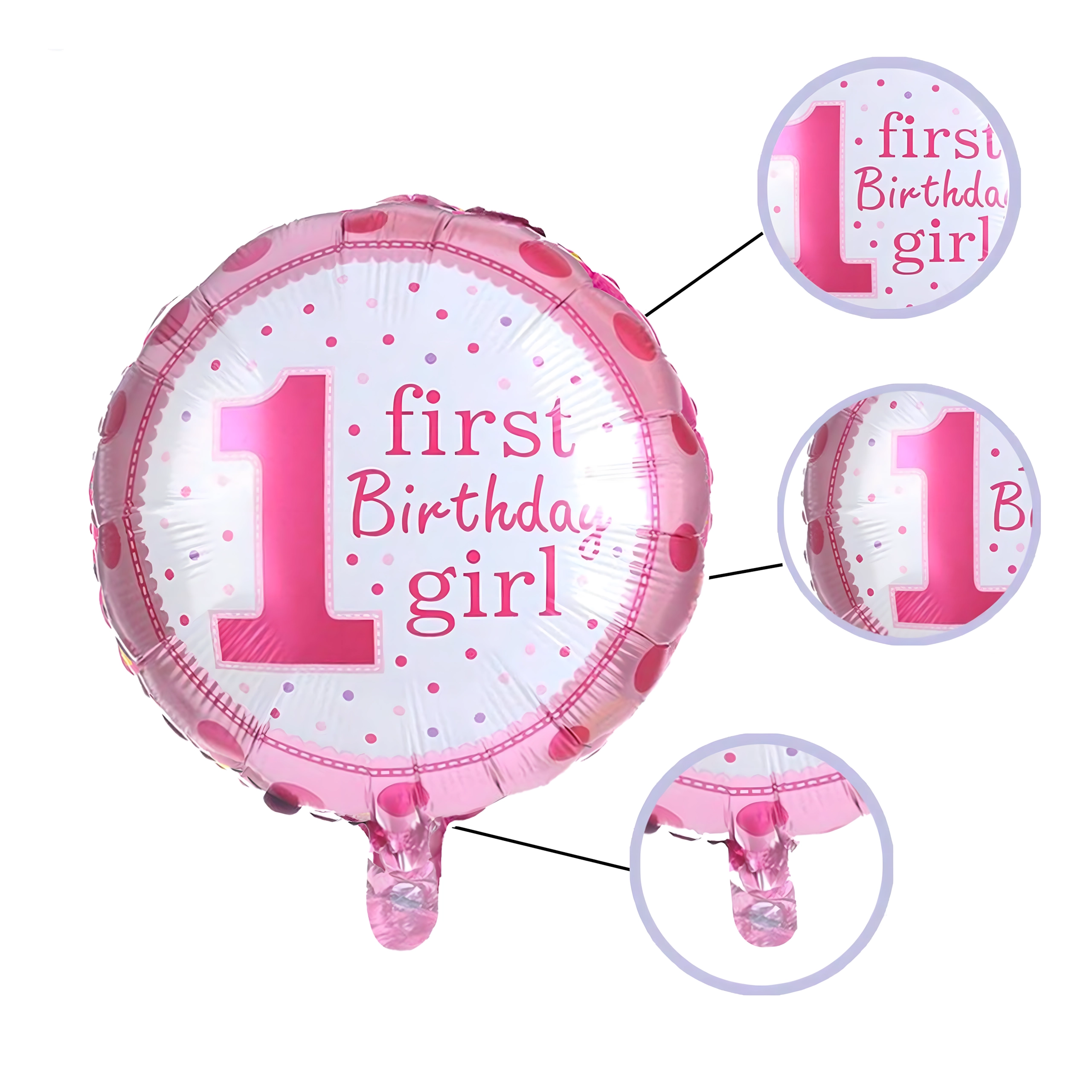 Stylowy zestaw balonów na pierwsze urodziny dziewczynki. Zawiera motyw cyfry 1, gwiazdki oraz napisy „First Birthday Girl” do uroczych zdjęć, dekoracji przyjęcia i ozdoby pokoju dziecięcego. Łatwe pompowanie i pięknie dobrane kolory tworzą czarującą atmosferę pierwszej uroczystości.
