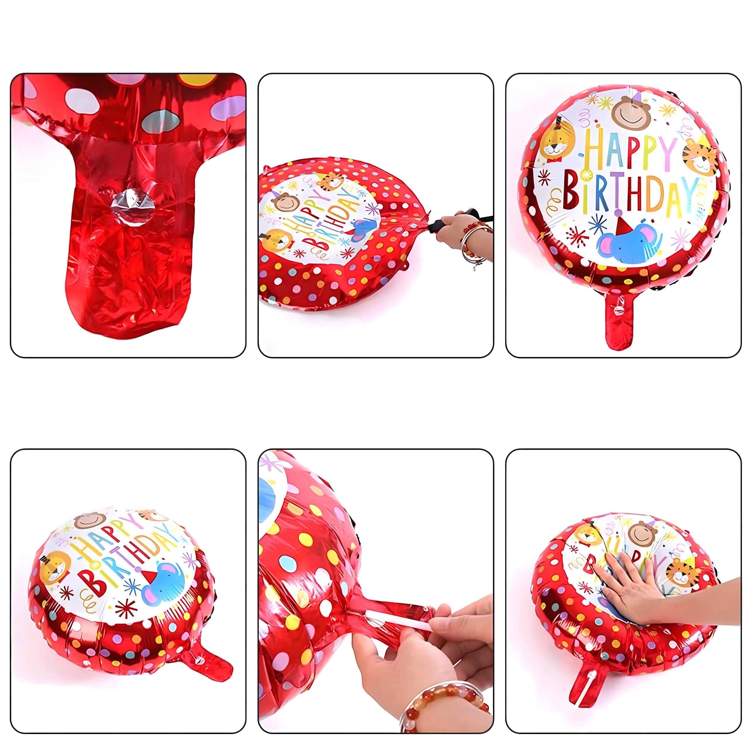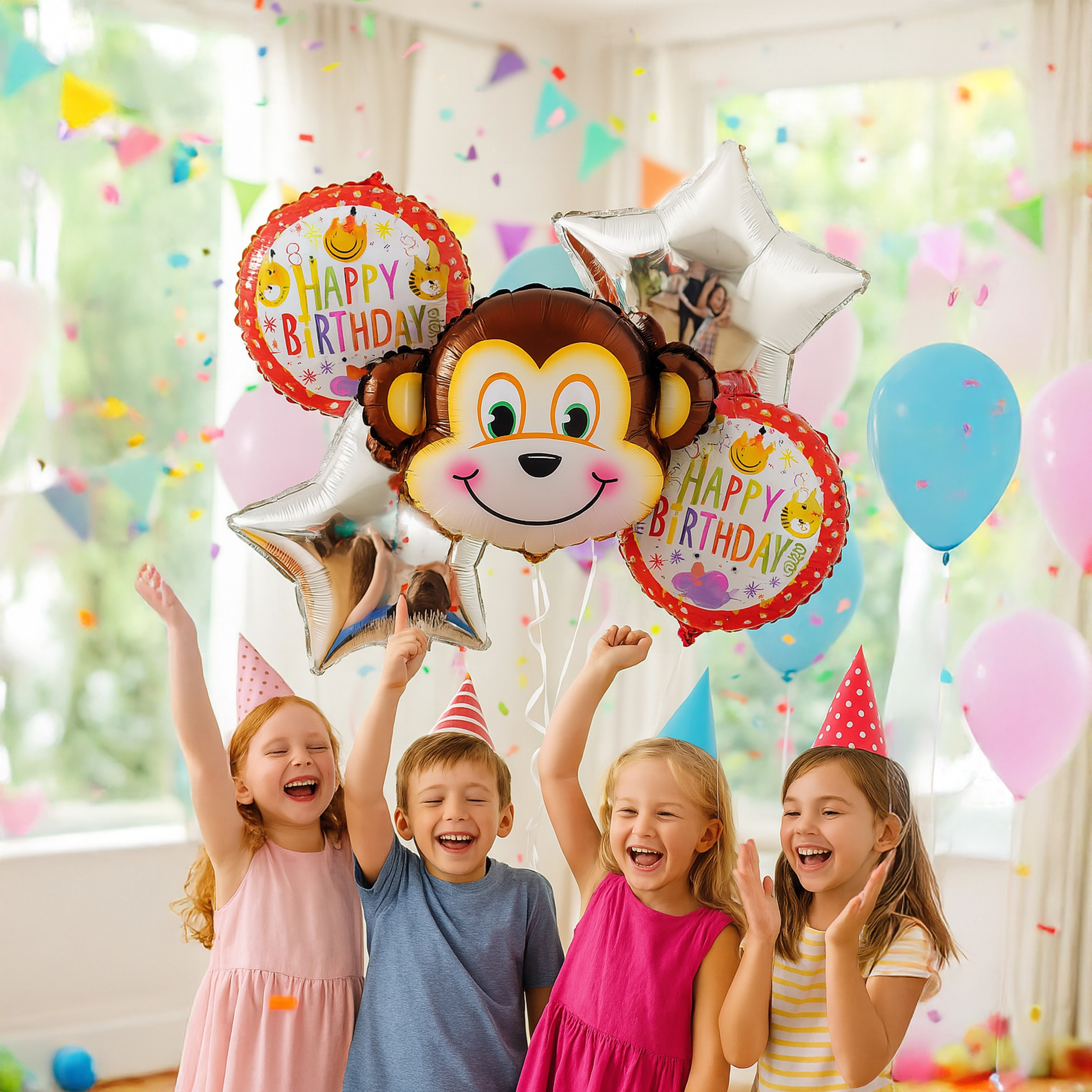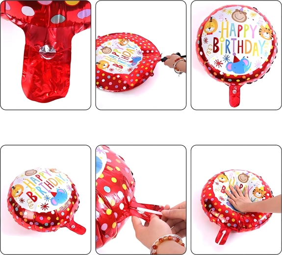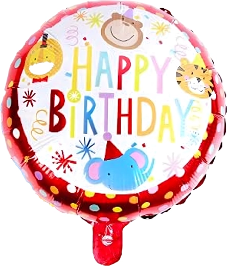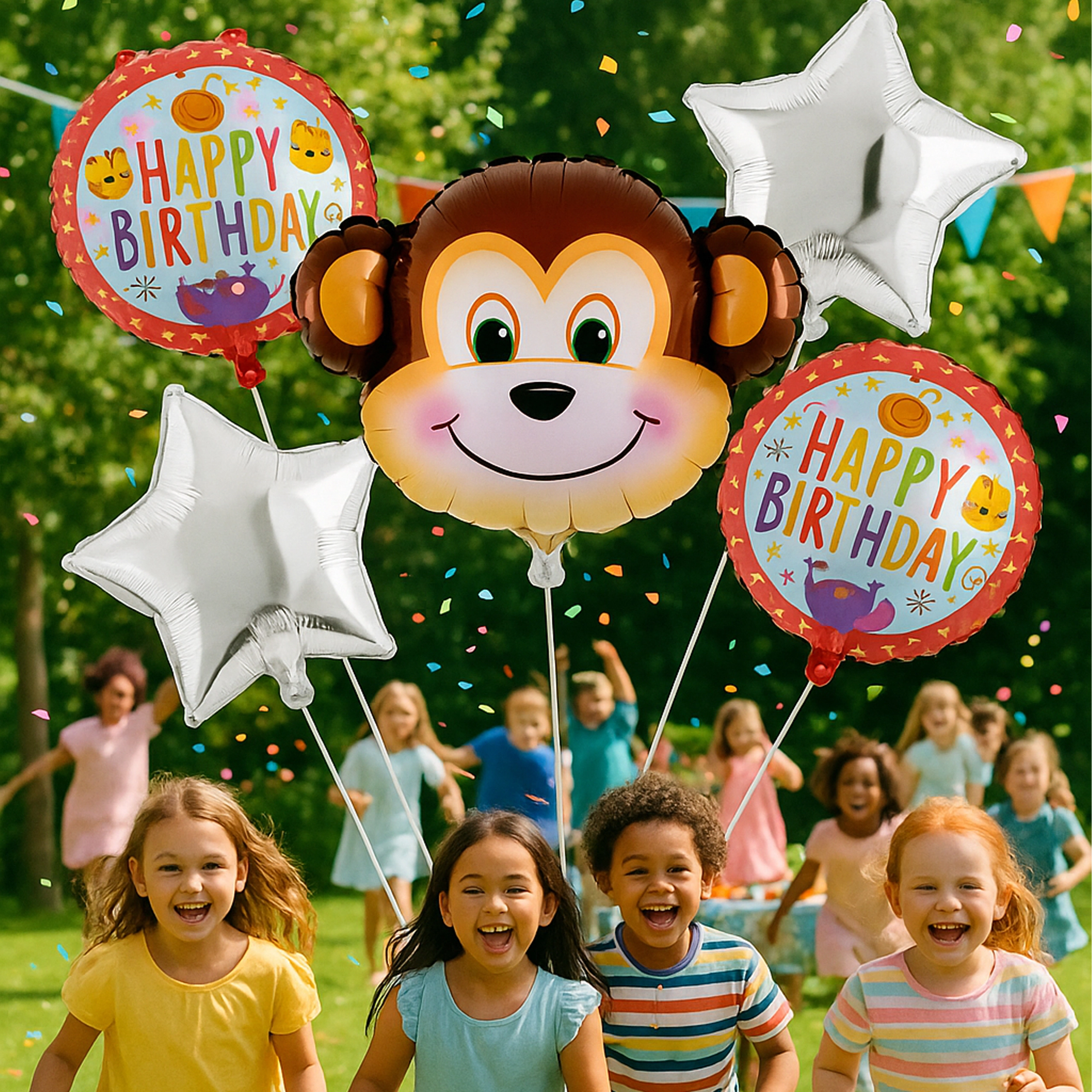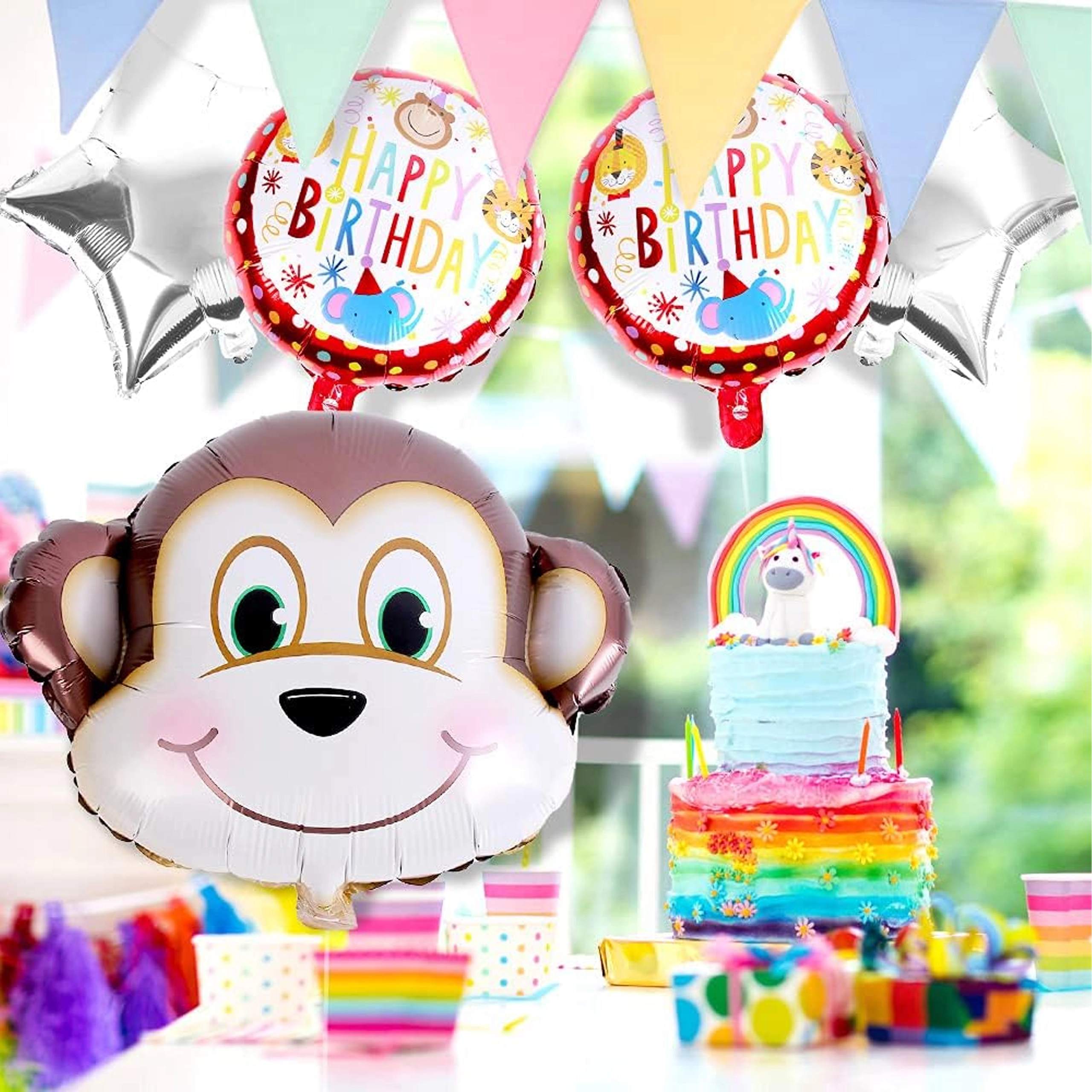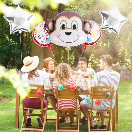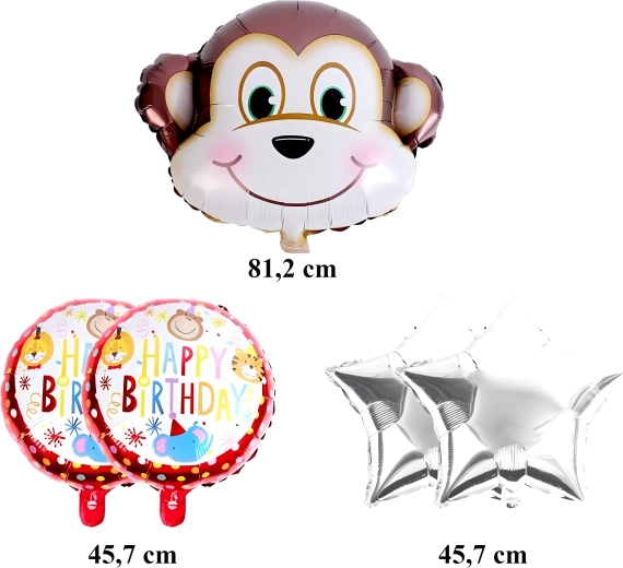 5 szt. (1× balon małpka, 2× balon z napisem HAPPY BIRTHDAY, 2× srebrna gwiazda)