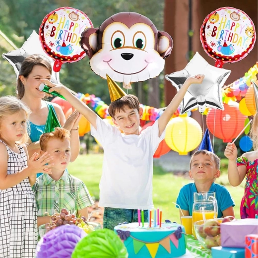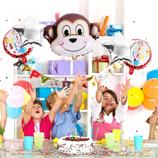 Ten pełen zabawy zestaw balonów stworzy na przyjęciu czarującą atmosferę pełną radości. Motyw małpki i srebrne gwiazdy świetnie pasują do kolorowych dekoracji i przyciągną uwagę małych i dużych gości.
