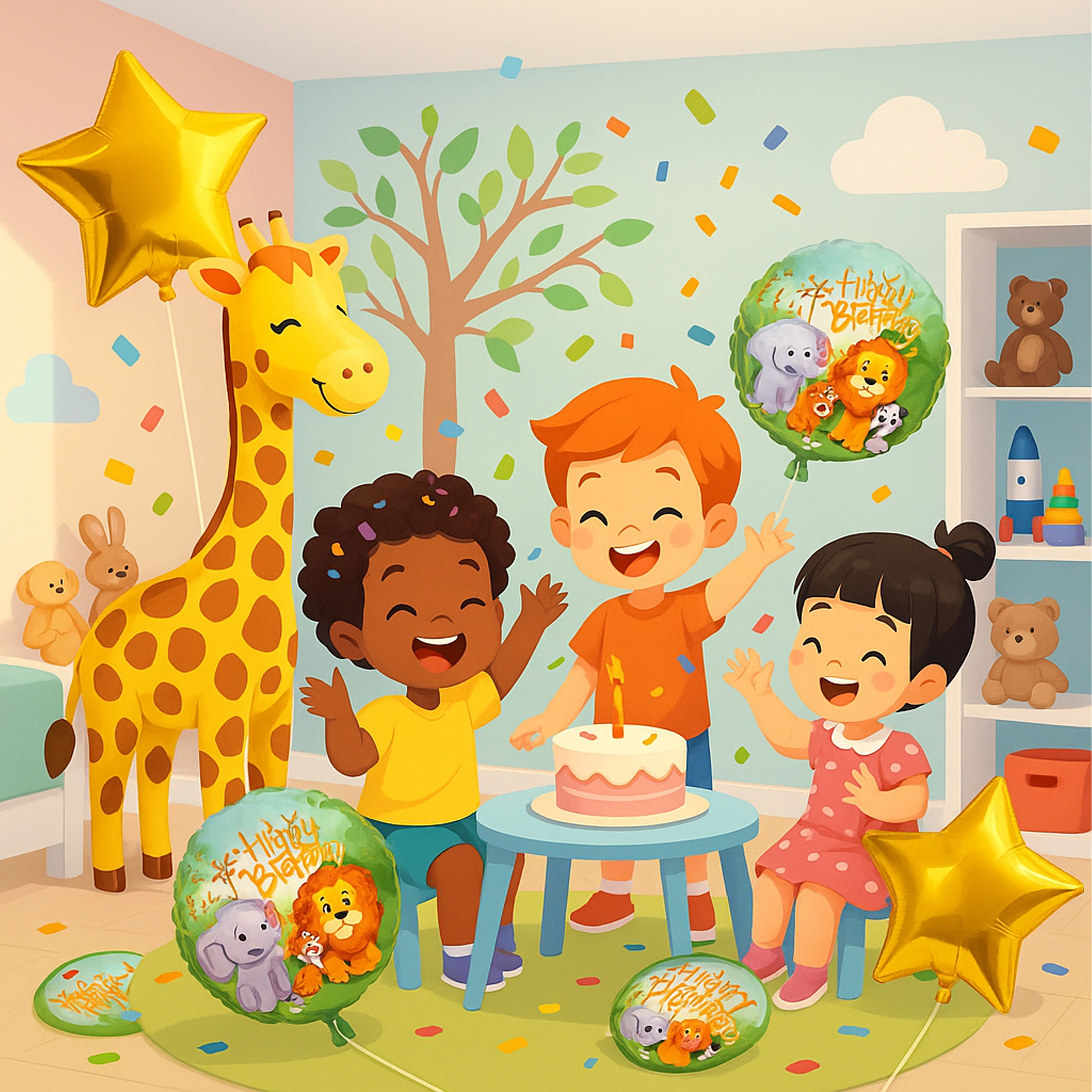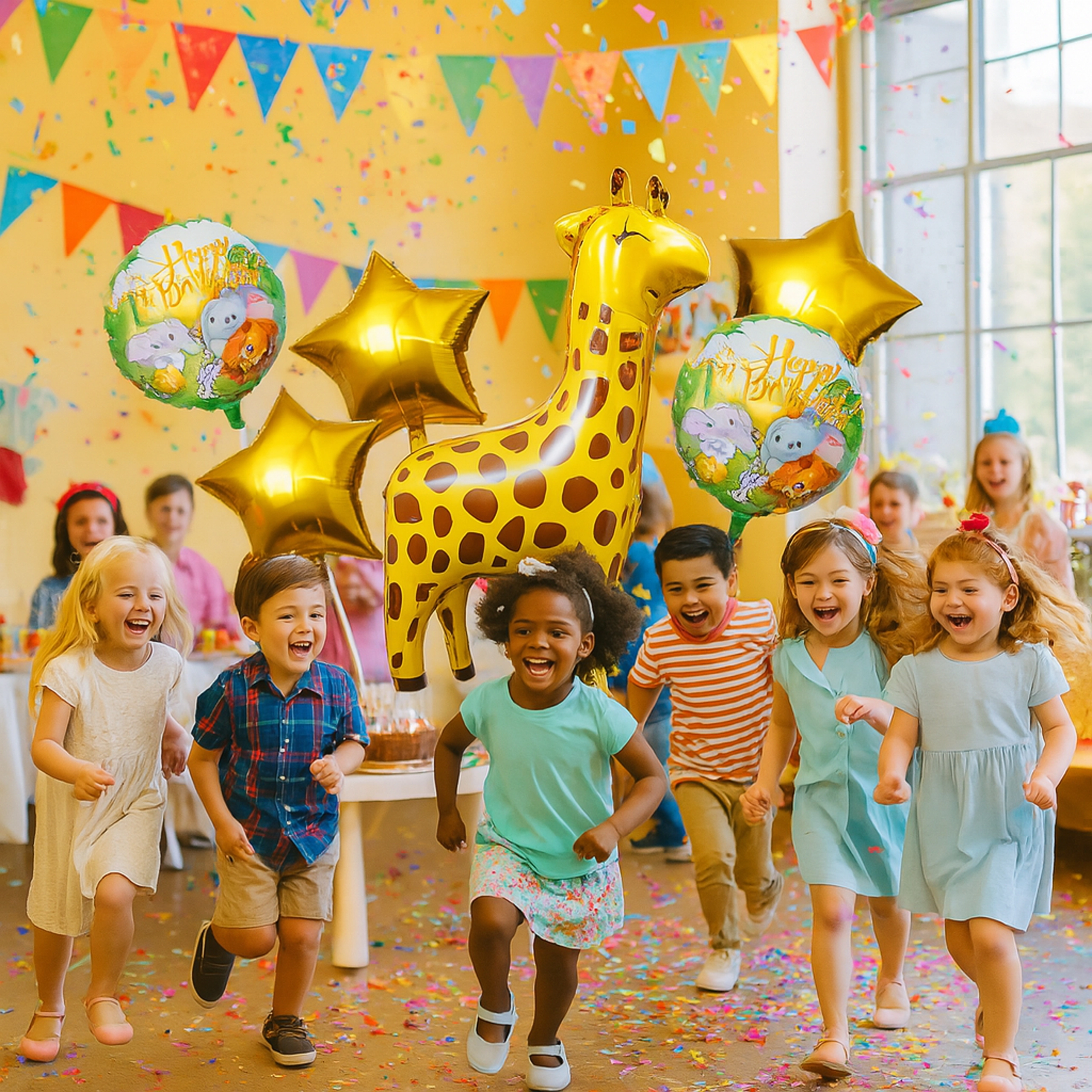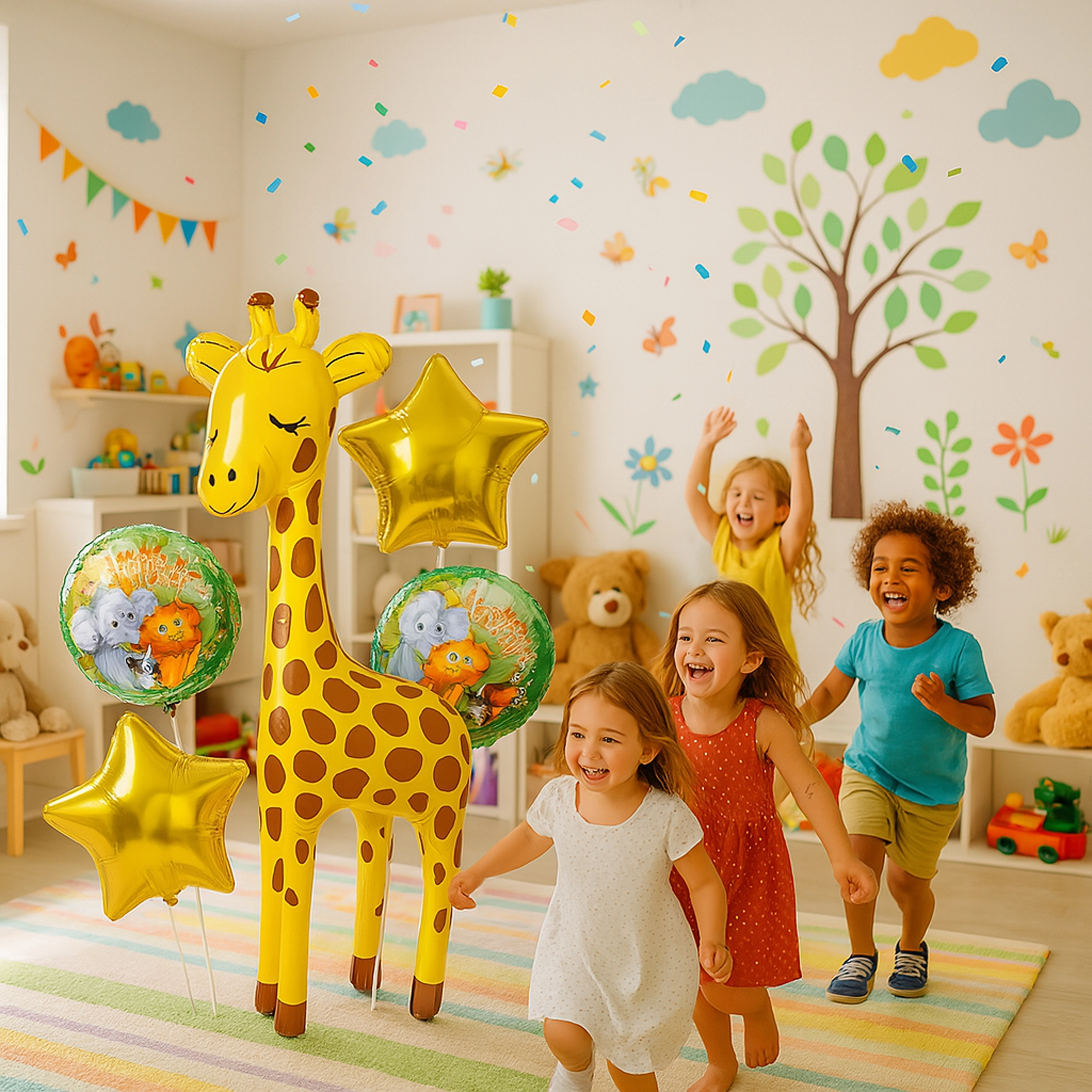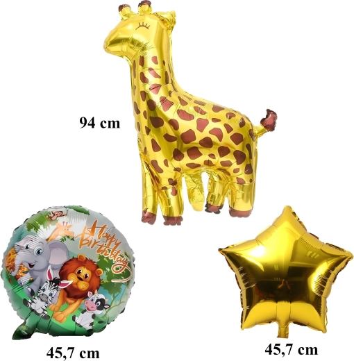 Wesoły zestaw baloników z motywem żyrafy i zwierzątek zamieni każdą imprezę w małe safari. W opakowaniu znajdziesz 1 balon foliowy żyrafa, 2 balony z napisem HAPPY BIRTHDAY oraz 2 złote gwiazdki – idealna dekoracja na dziecięce urodziny i tematyczne przyjęcie zoo/safari.