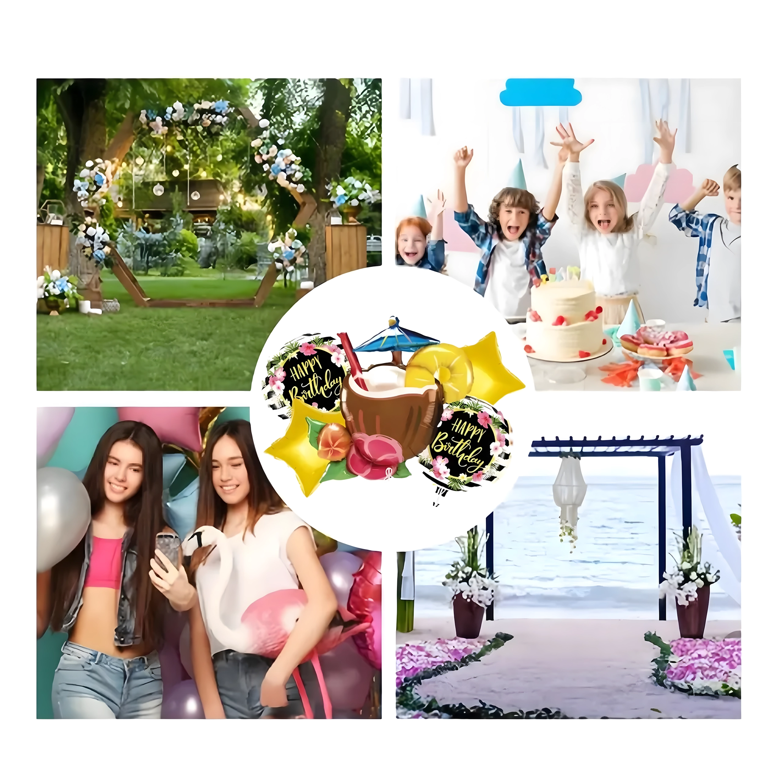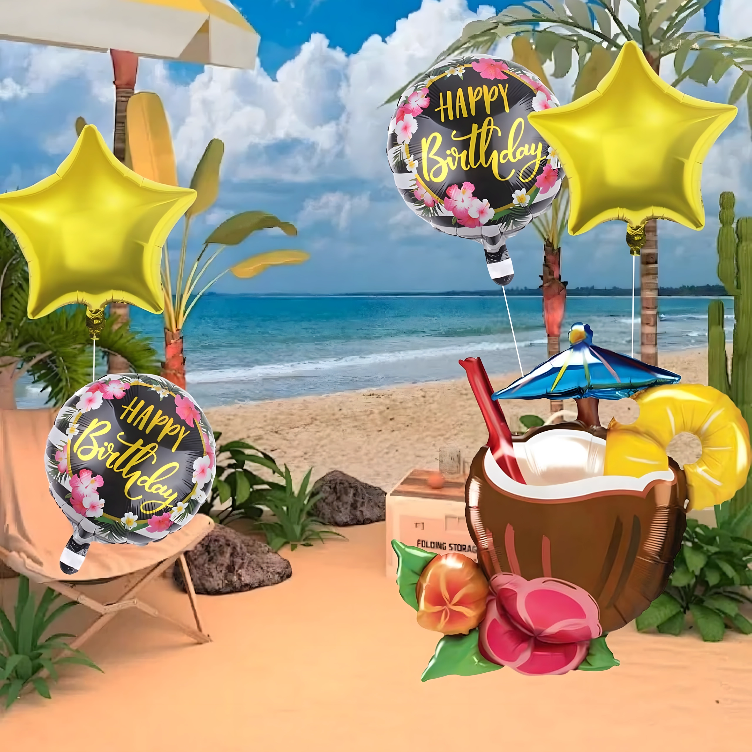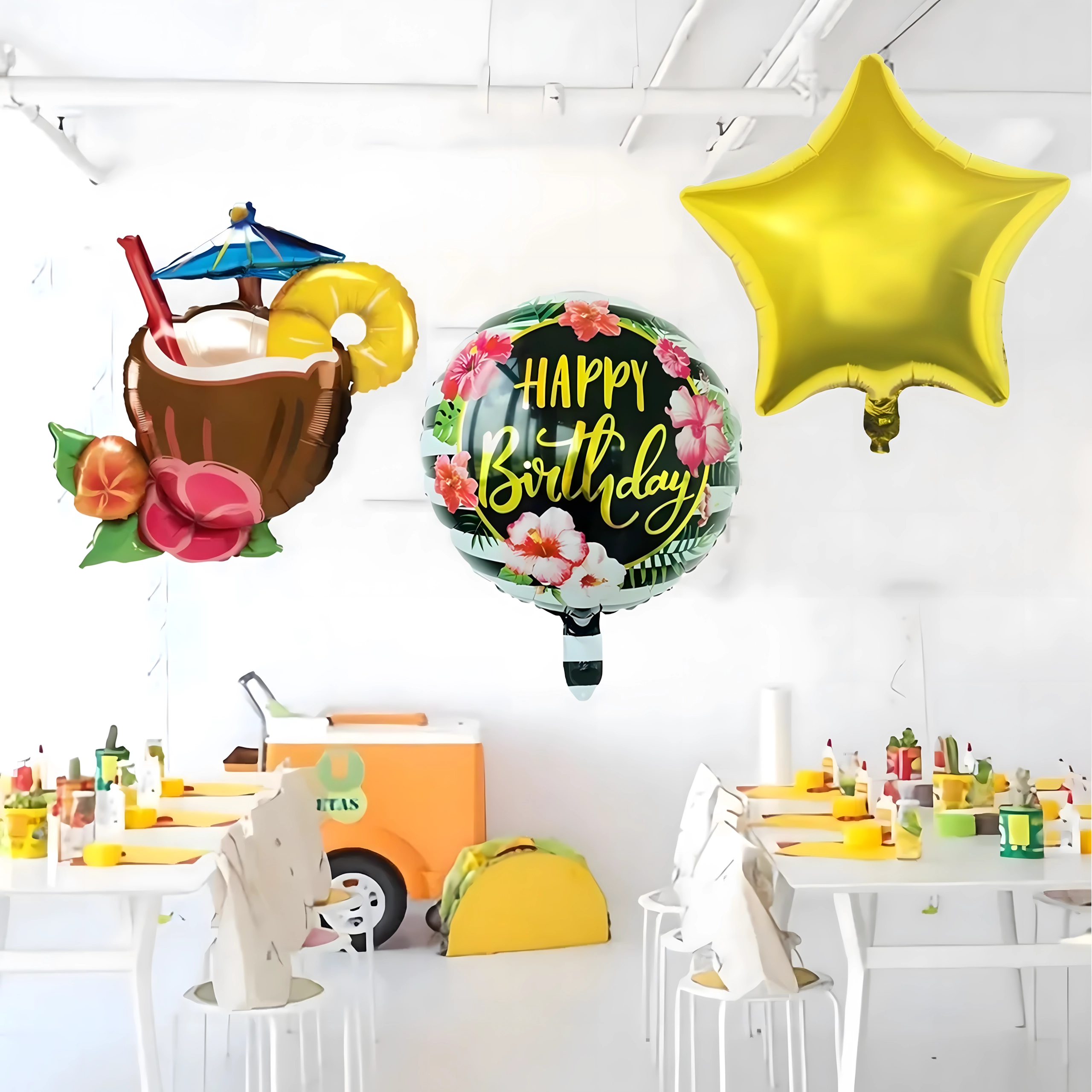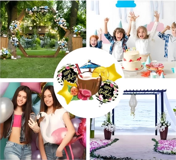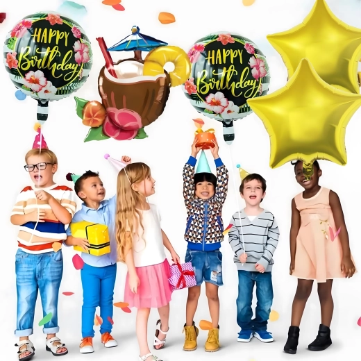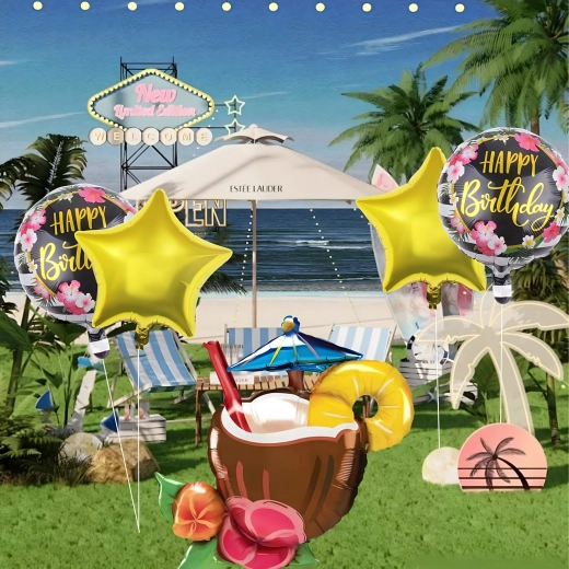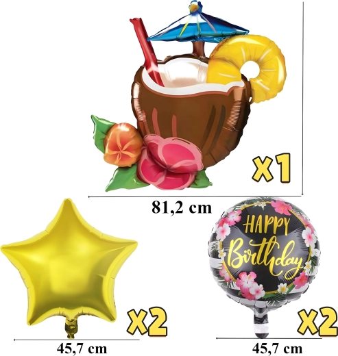 Rozjaśnij swoje przyjęcie żywymi kolorami i tropikalnym klimatem. Ten zestaw balonów Aloha oferuje radosne połączenie motywów, które świetnie sprawdzą się na urodzinach, garden party czy letnim grillu. Dominantą jest wyrazisty balon w kształcie orzeźwiającego drinka, który uzupełniają klasyczne okrągłe balony z napisem Happy Birthday oraz eleganckie złote gwiazdy.
