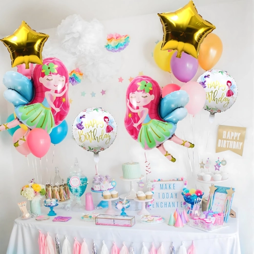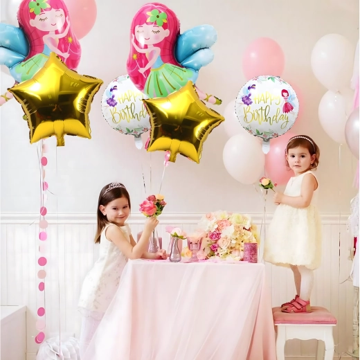 Ten bajkowy zestaw balonów z wróżką stworzy niepowtarzalny klimat na każdej uroczystości. Połączenie dużego balonu w kształcie wróżki z dodatkowymi okrągłymi i gwieździstymi balonami zapewni efektowną dekorację bez wysiłku.