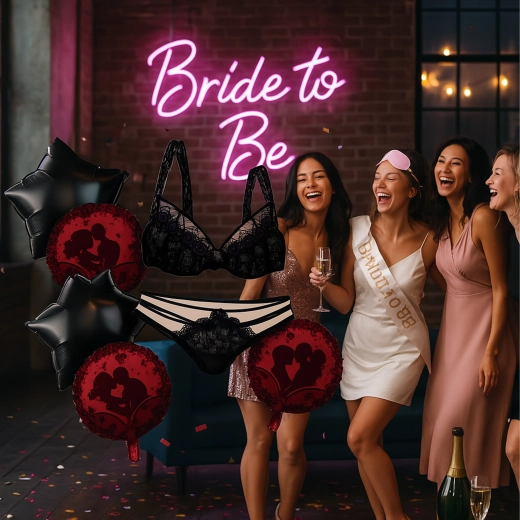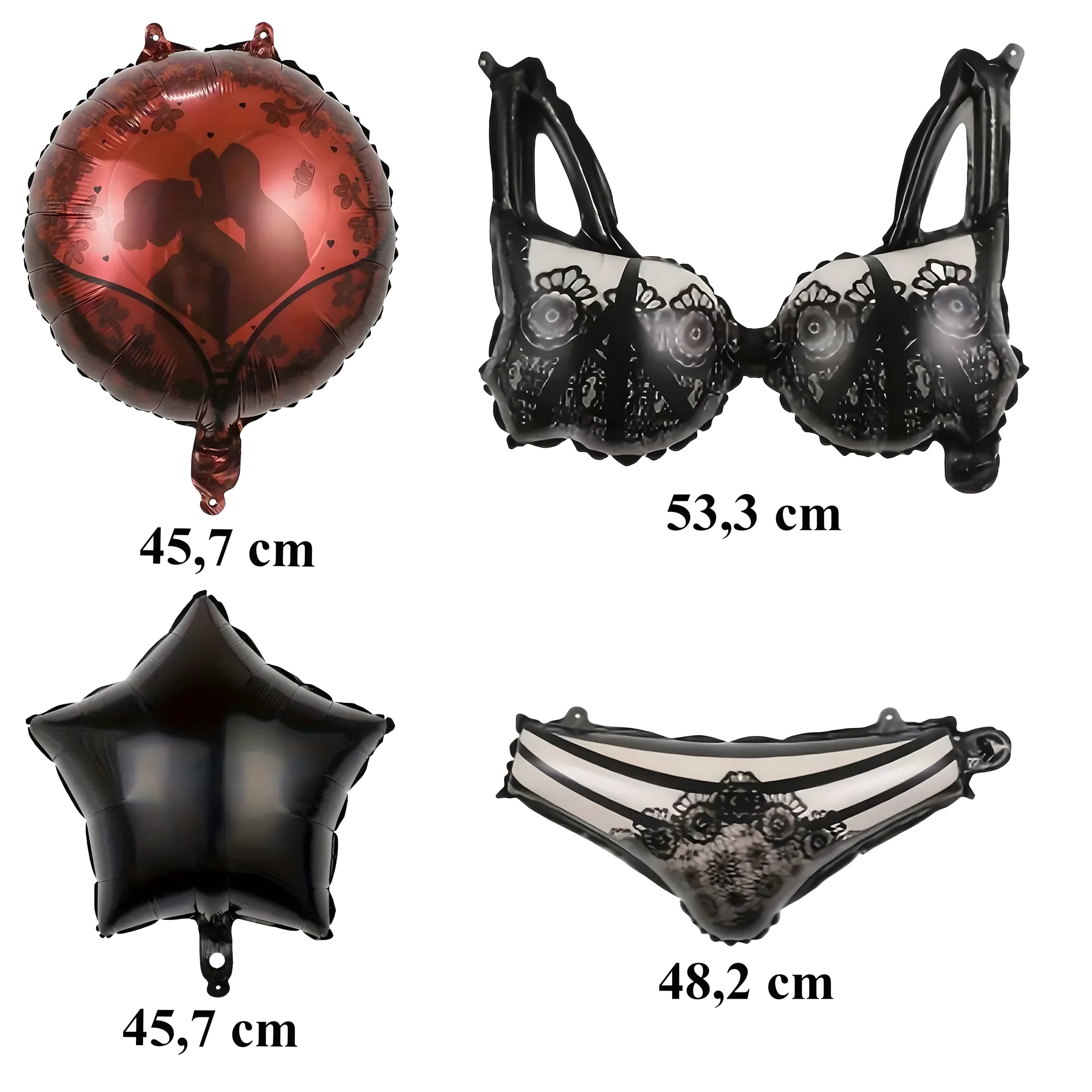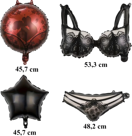 Wesoły zestaw balonów na wieczór panieński w motywie damskiej bielizny rozświetli każdą imprezę. Zawiera balon w kształcie biustonosza (53,3 cm), balon w kształcie majtek (48,2 cm), 2 okrągłe balony oraz 2 balony z nadrukiem. Idealny jako dekoracja do fotobudki i na imprezę Bride‑to‑Be.