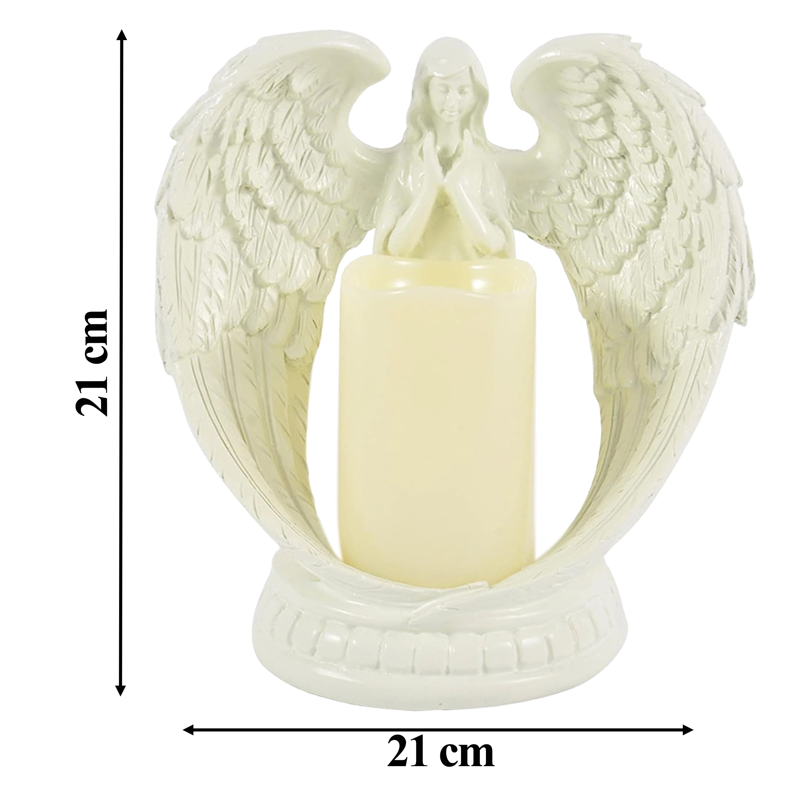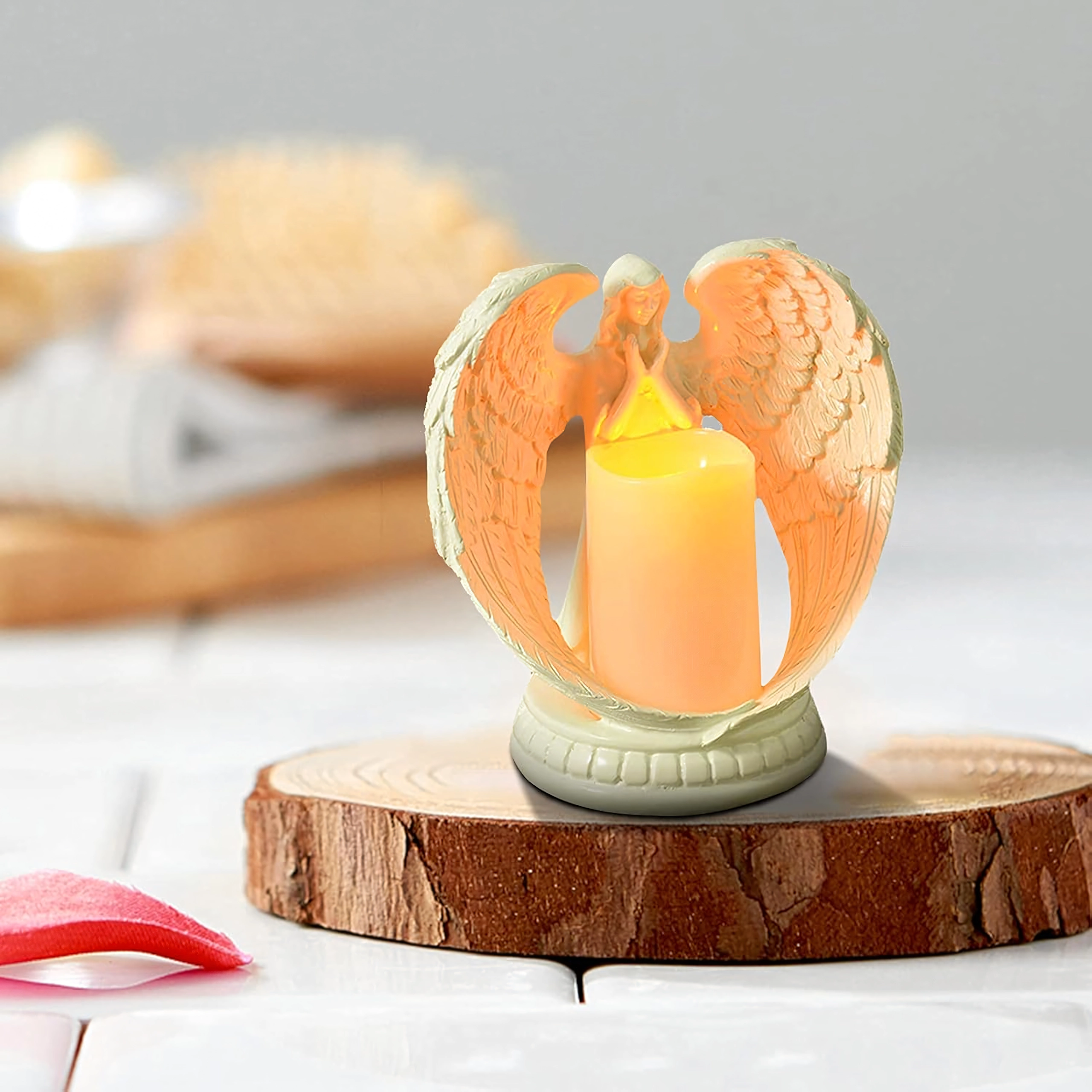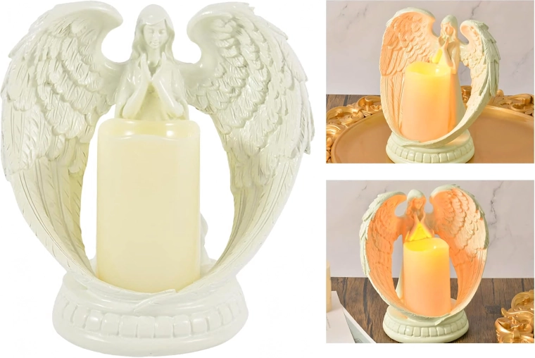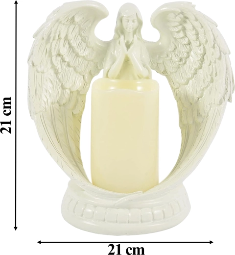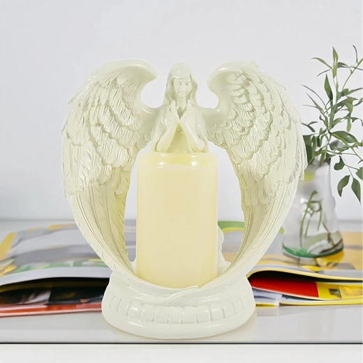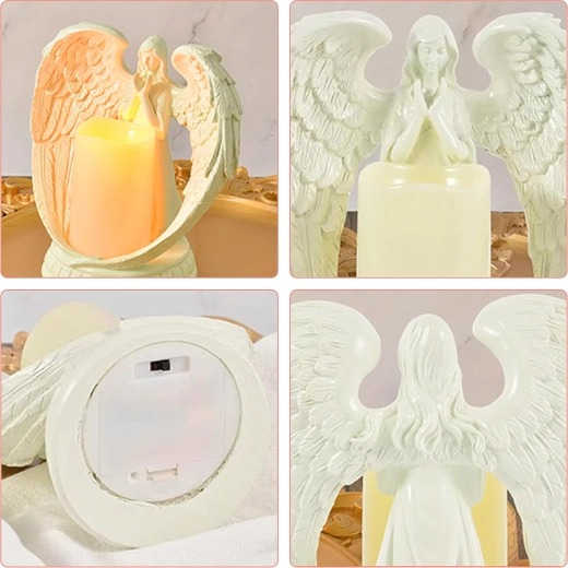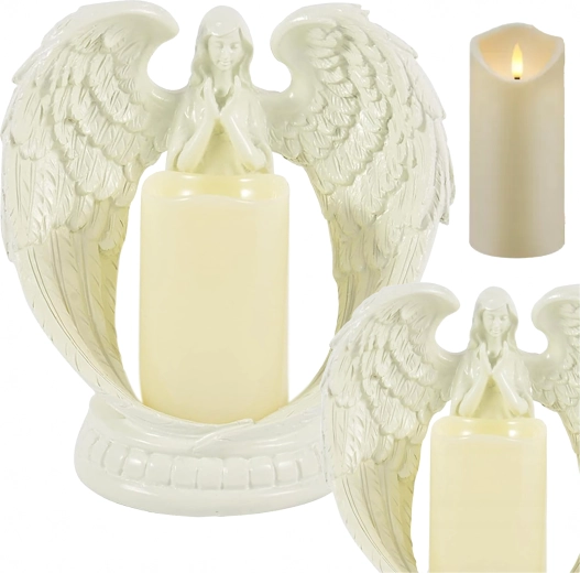 Elegancki dekoracyjny anioł ze świecą z realistycznym światłem LED. Wykonany z polerowanej żywicy, symbolizuje spokój, pamięć i błogosławieństwo. Idealny do wnętrz, na obrzędy religijne, na grób oraz jako wyjątkowy prezent.