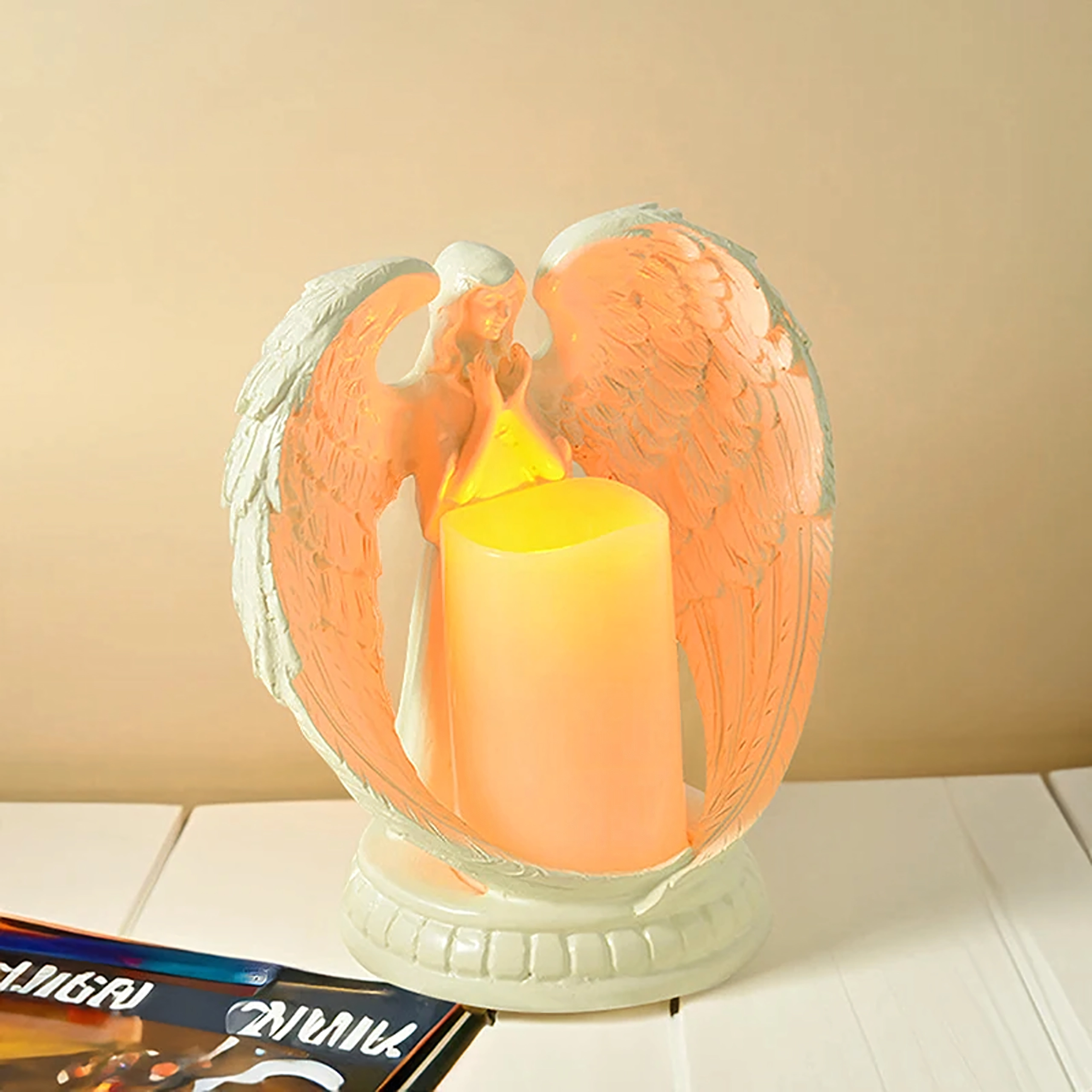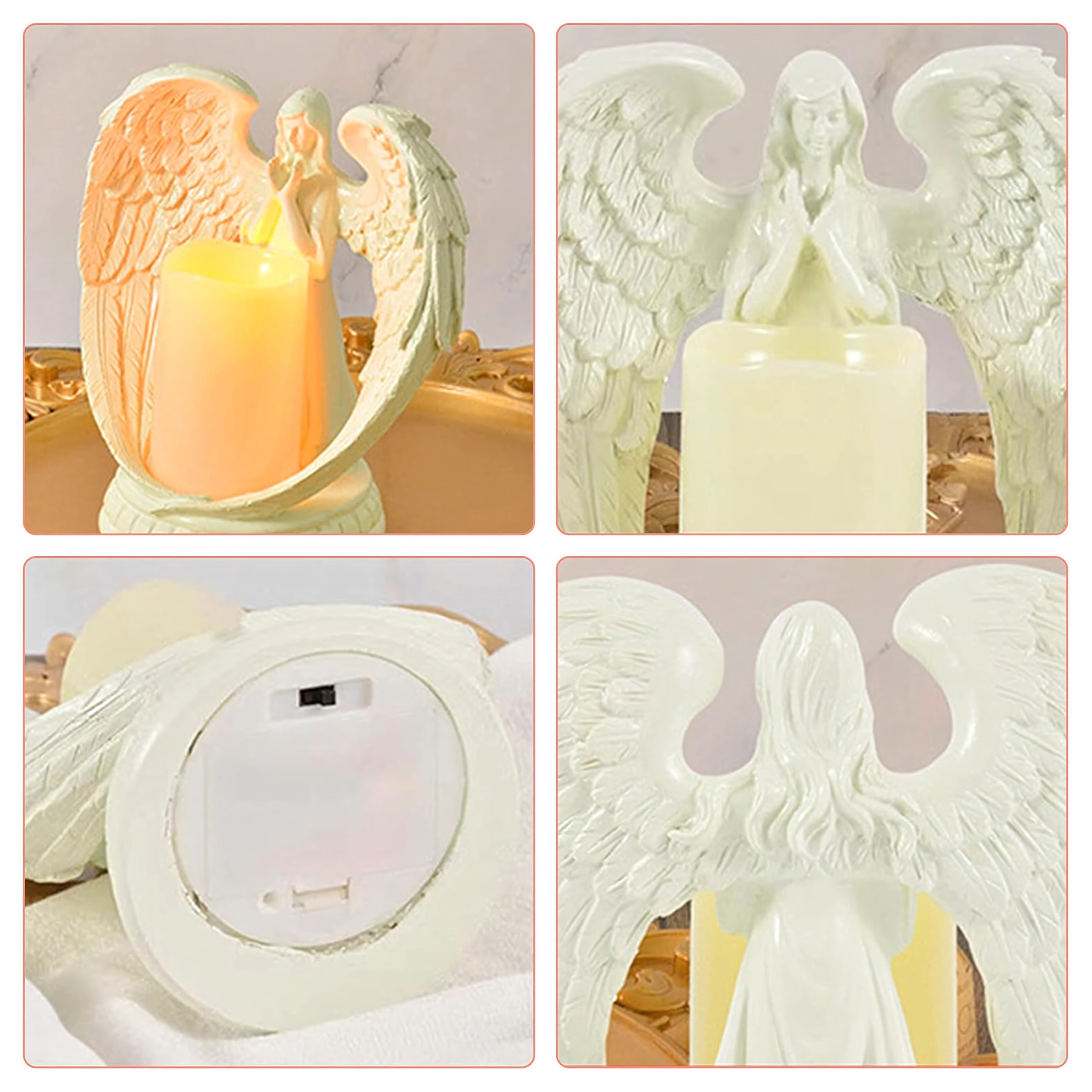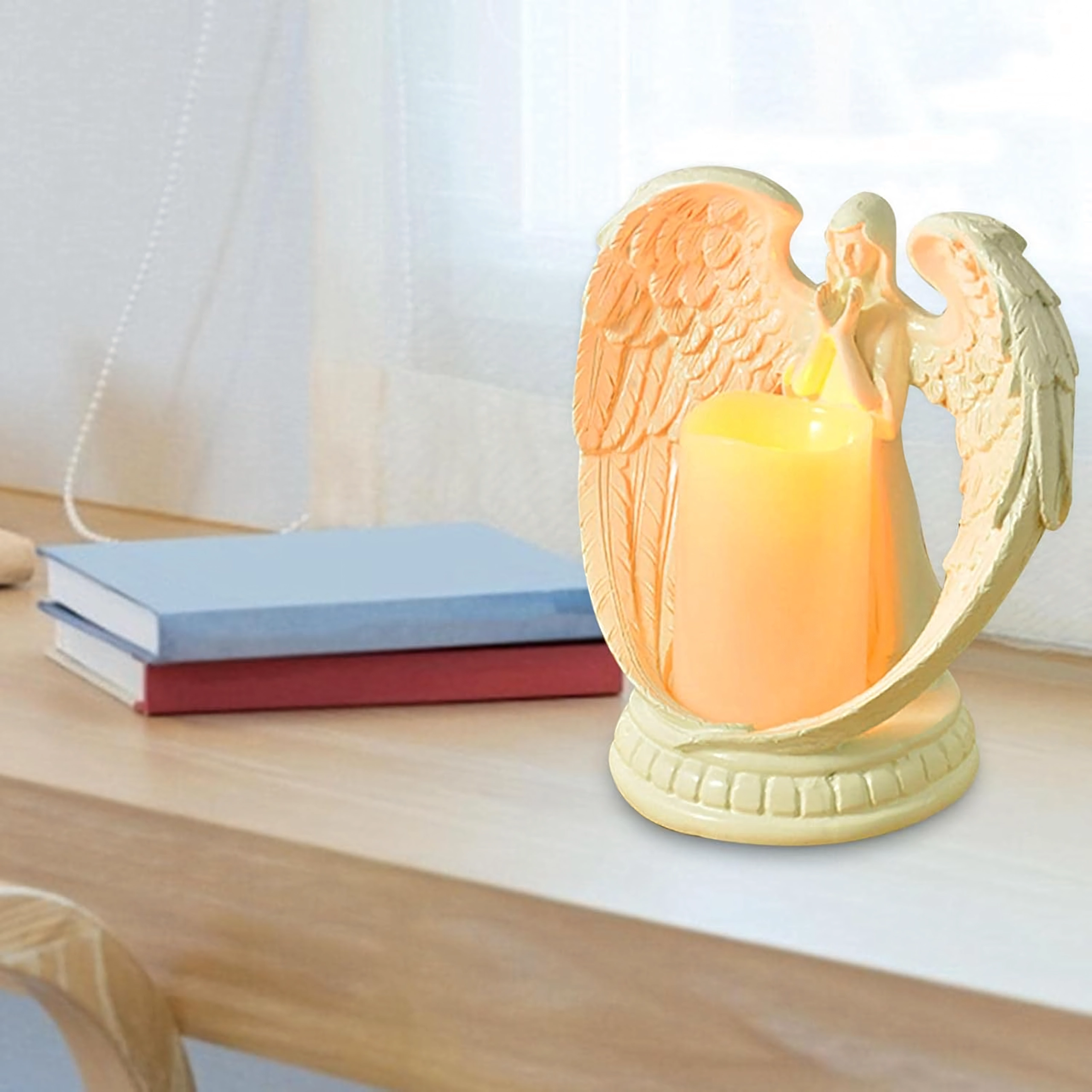 Elegancki dekoracyjny anioł ze świecą z realistycznym światłem LED. Wykonany z polerowanej żywicy, symbolizuje spokój, pamięć i błogosławieństwo. Idealny do wnętrz, na obrzędy religijne, na grób oraz jako wyjątkowy prezent.
