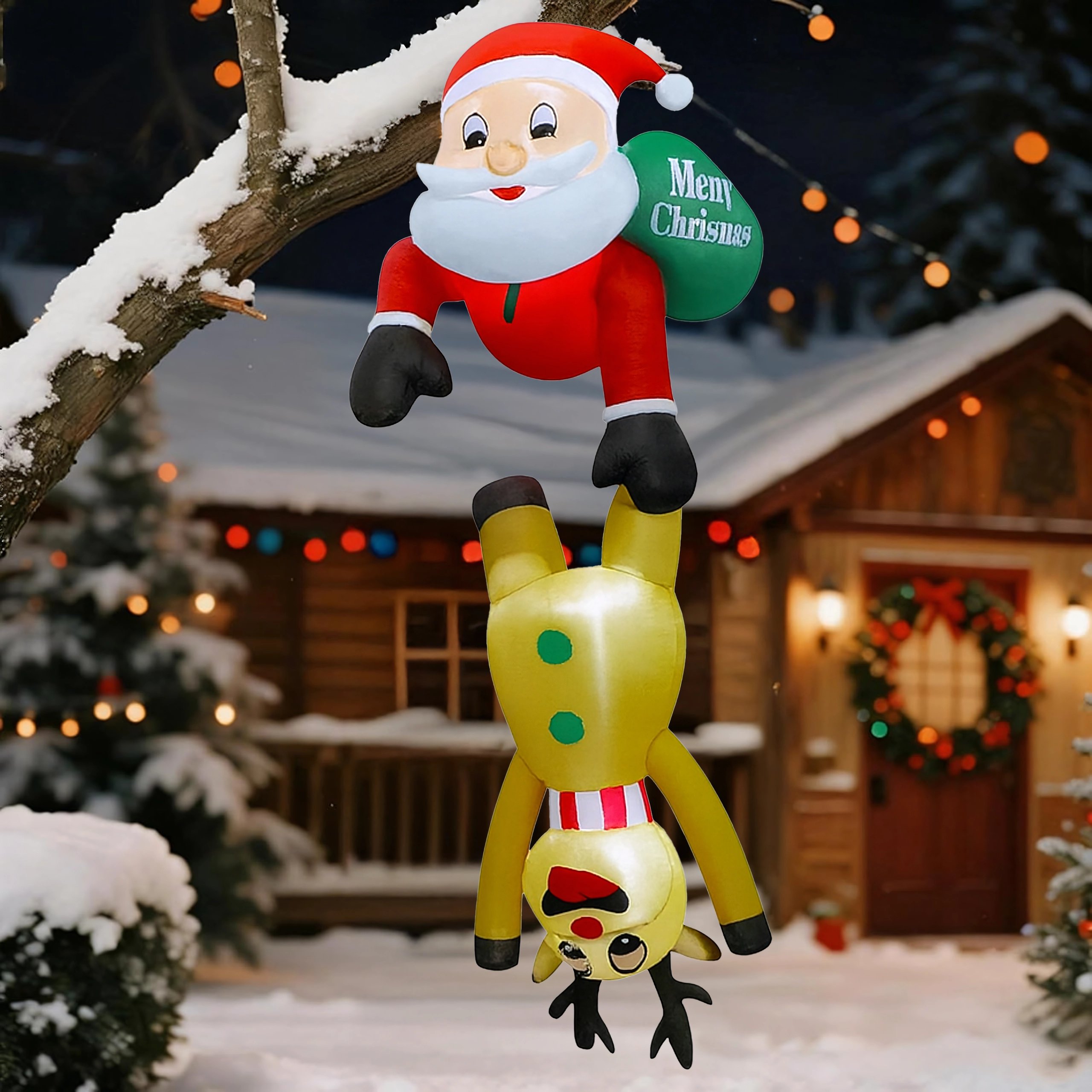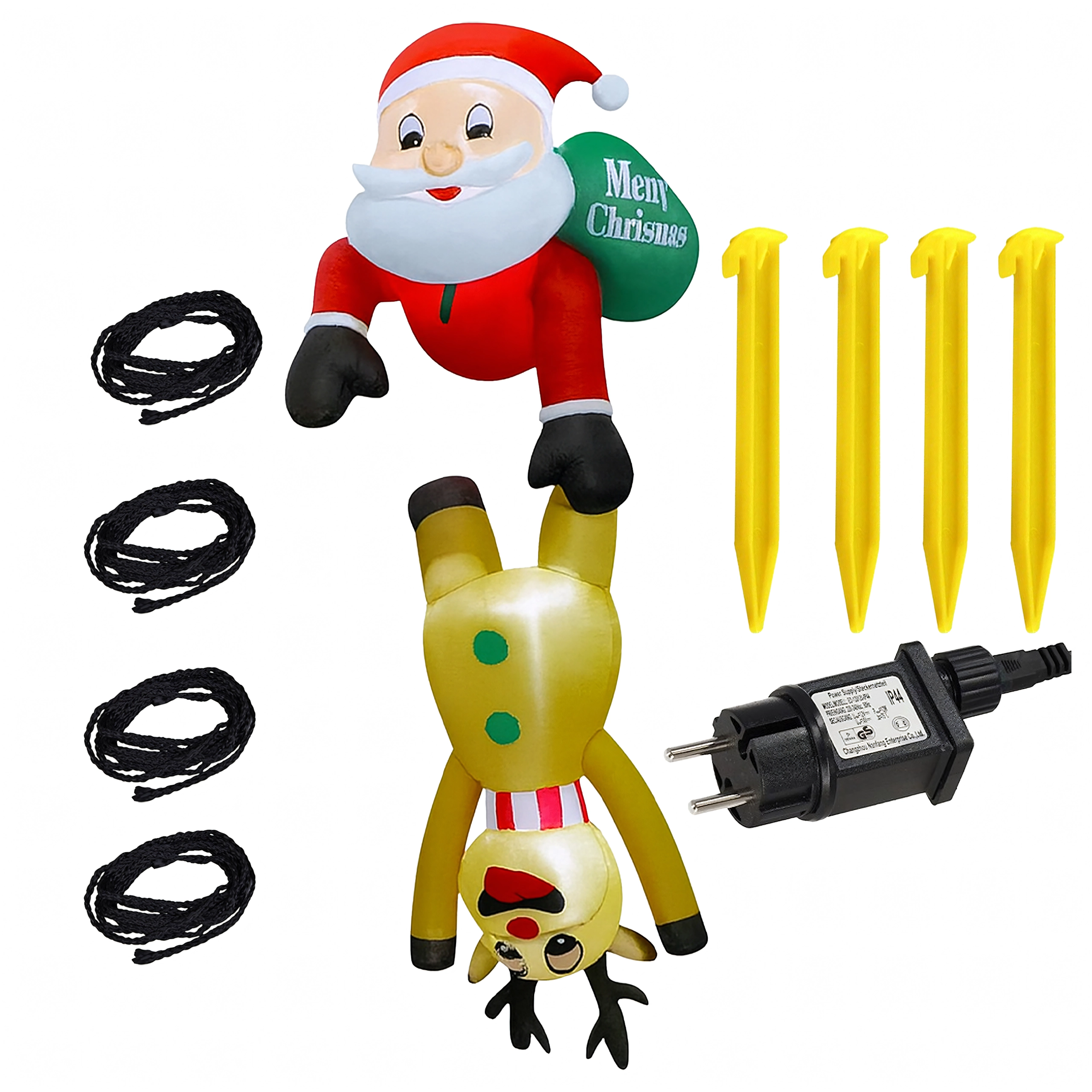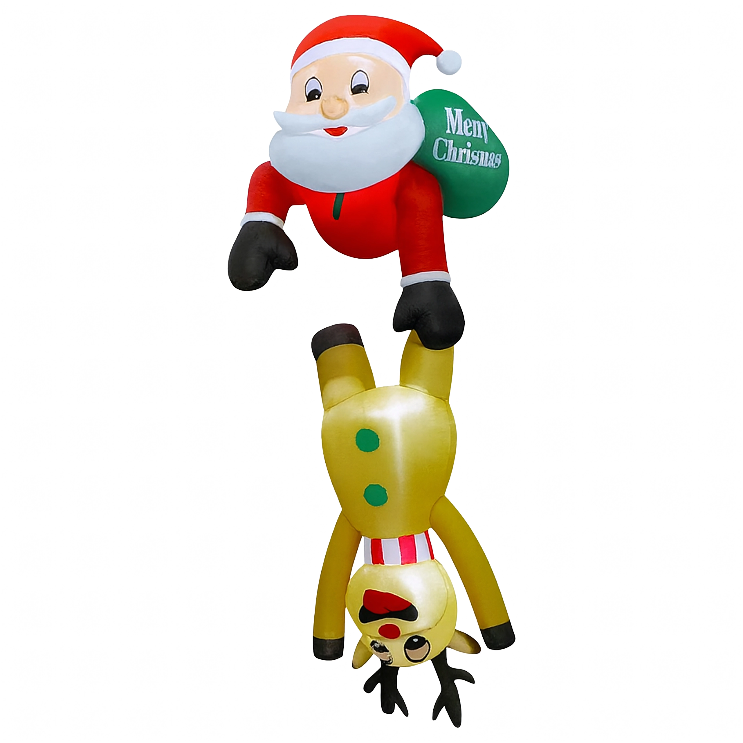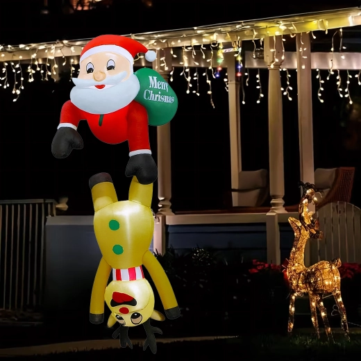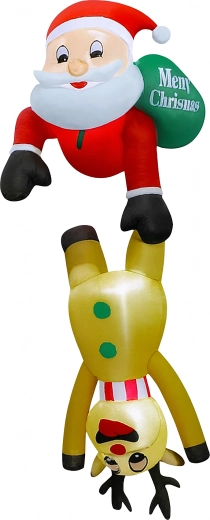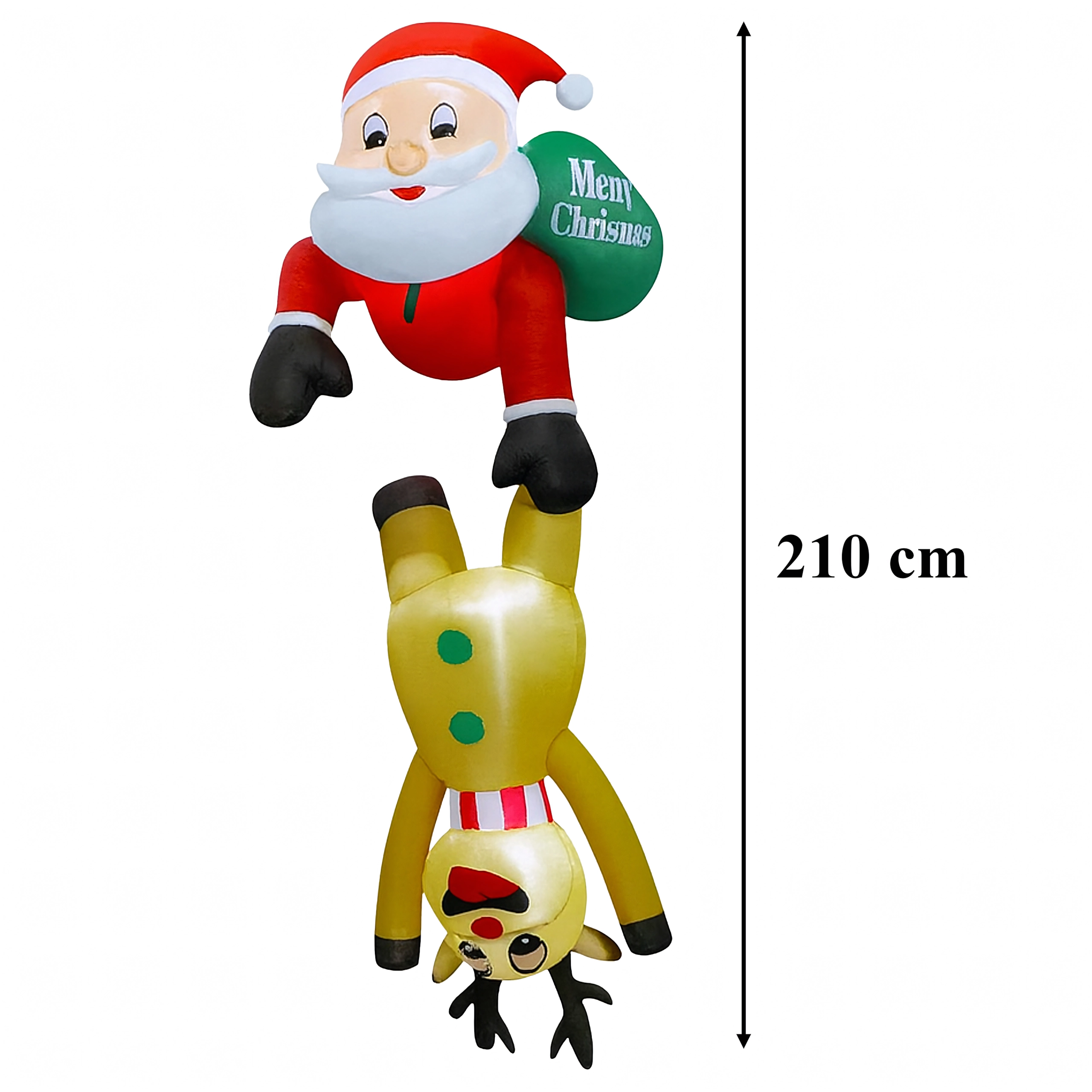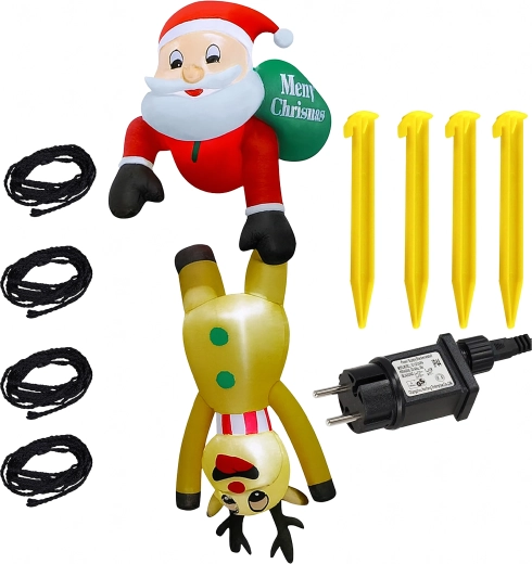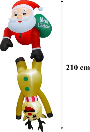 Wesoła nadmuchiwana dekoracja święty Mikołaj z reniferem o wysokości 2,1 m zamieni dom i ogród w magiczną zimową scenerię. Dzięki zintegrowanemu podświetleniu LED doskonale prezentuje się po zmroku, a swoim kreatywnym designem wywoła uśmiech u dzieci i dorosłych. Wykonana z trwałej tkaniny poliestrowej, odpowiednia do użytku wewnątrz i na zewnątrz.