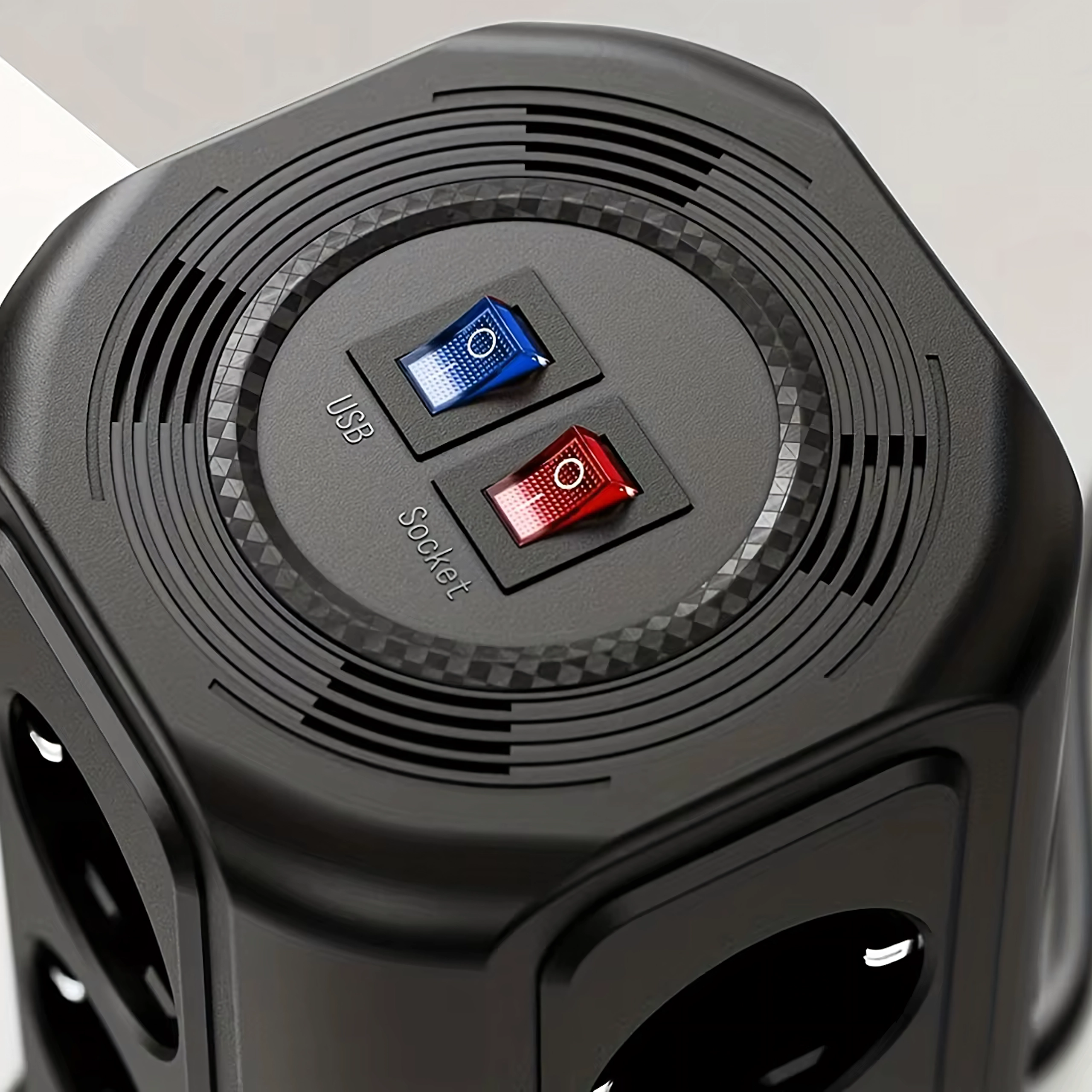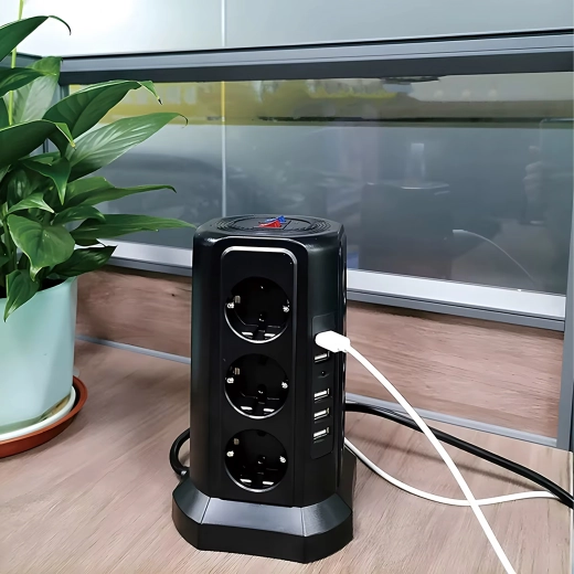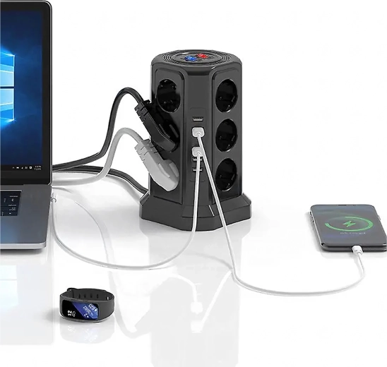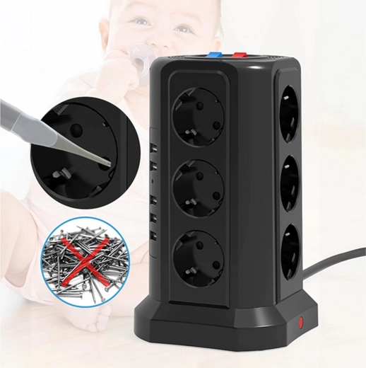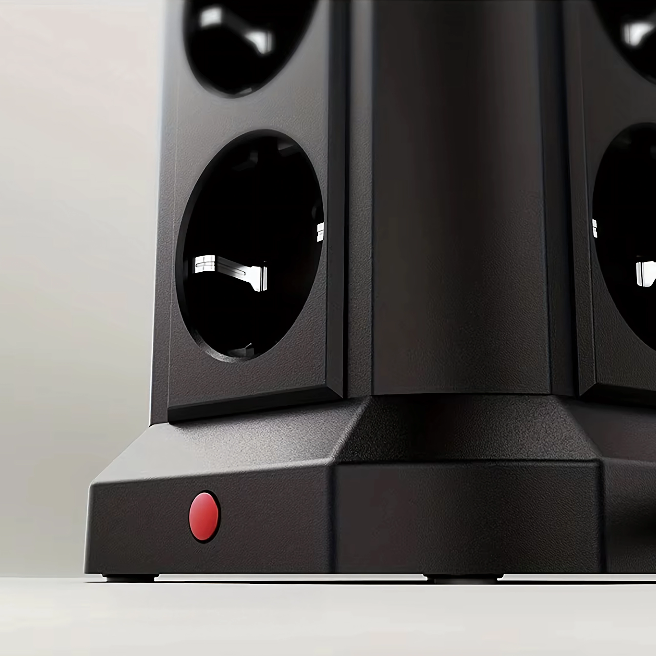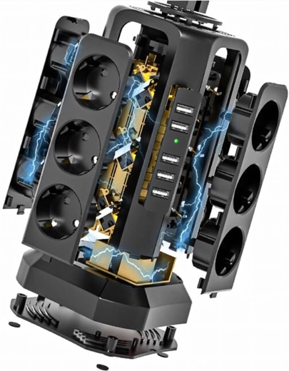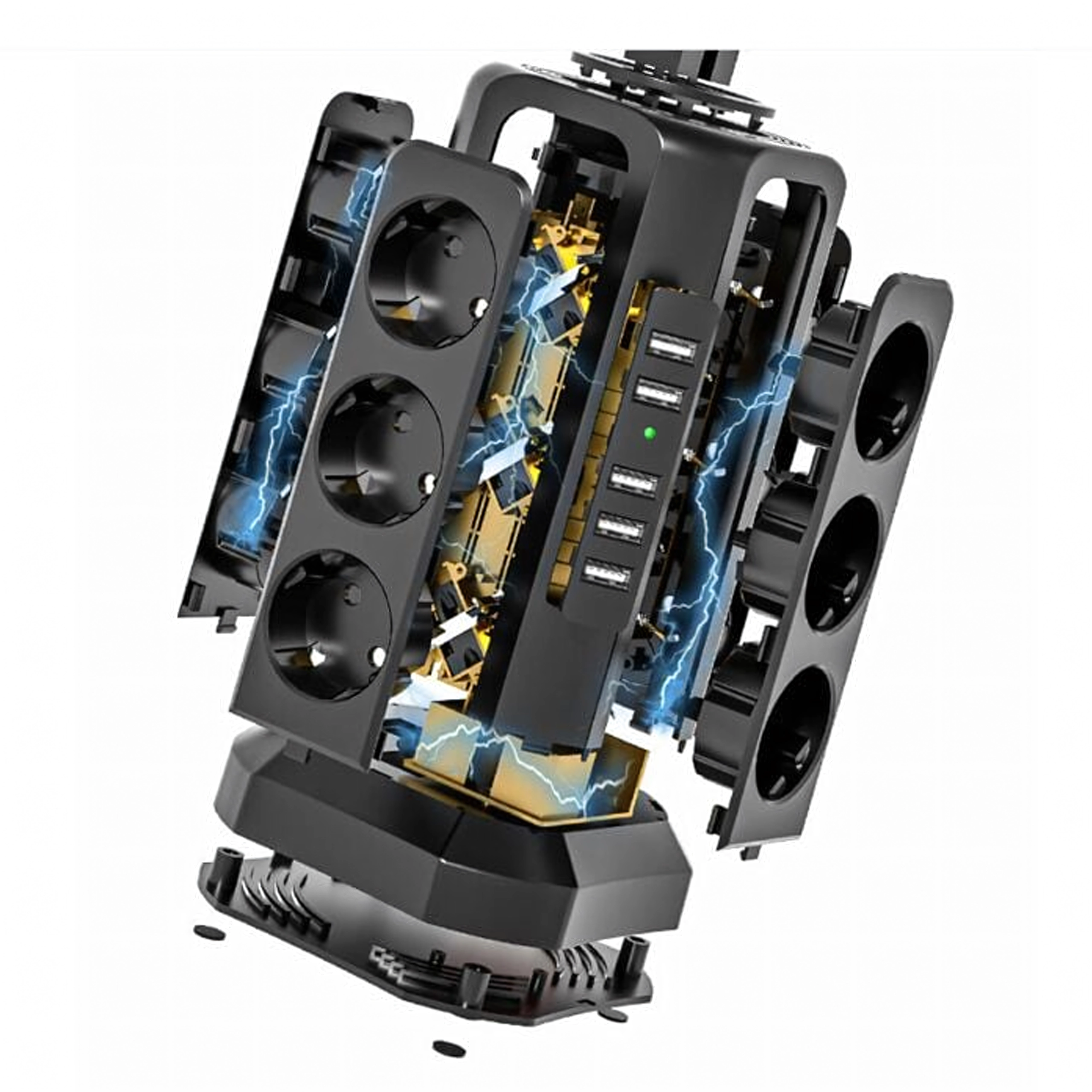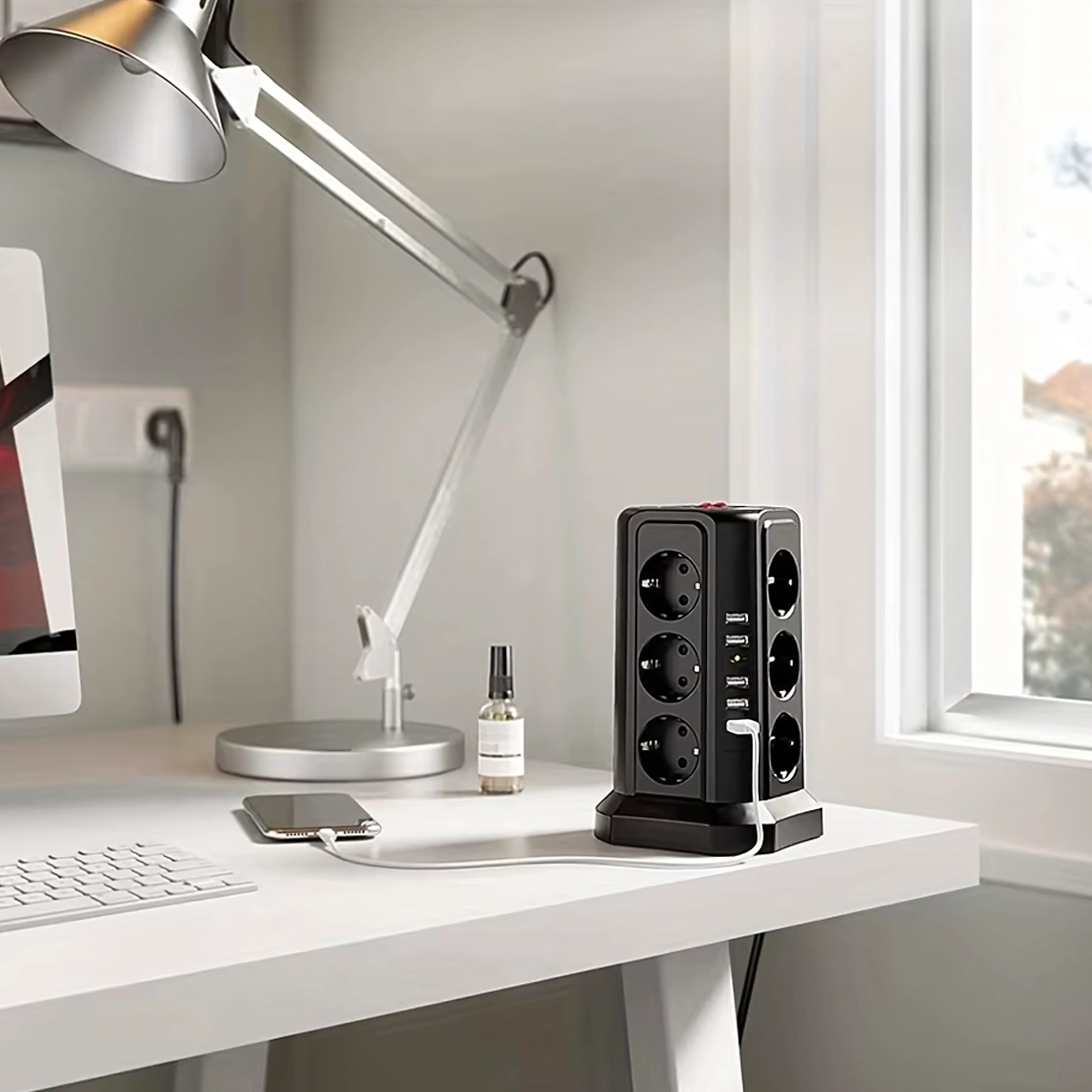 Nowoczesny pionowy przedłużacz z 12 gniazdami i 5 portami USB zapewnia przejrzyste zasilanie bez chaosu kabli. Dzięki zabezpieczeniu przeciwprzepięciowemu i praktycznej funkcji reset idealnie sprawdzi się w domu i biurze, umożliwiając bezpieczne i wygodne ładowanie wielu urządzeń jednocześnie.