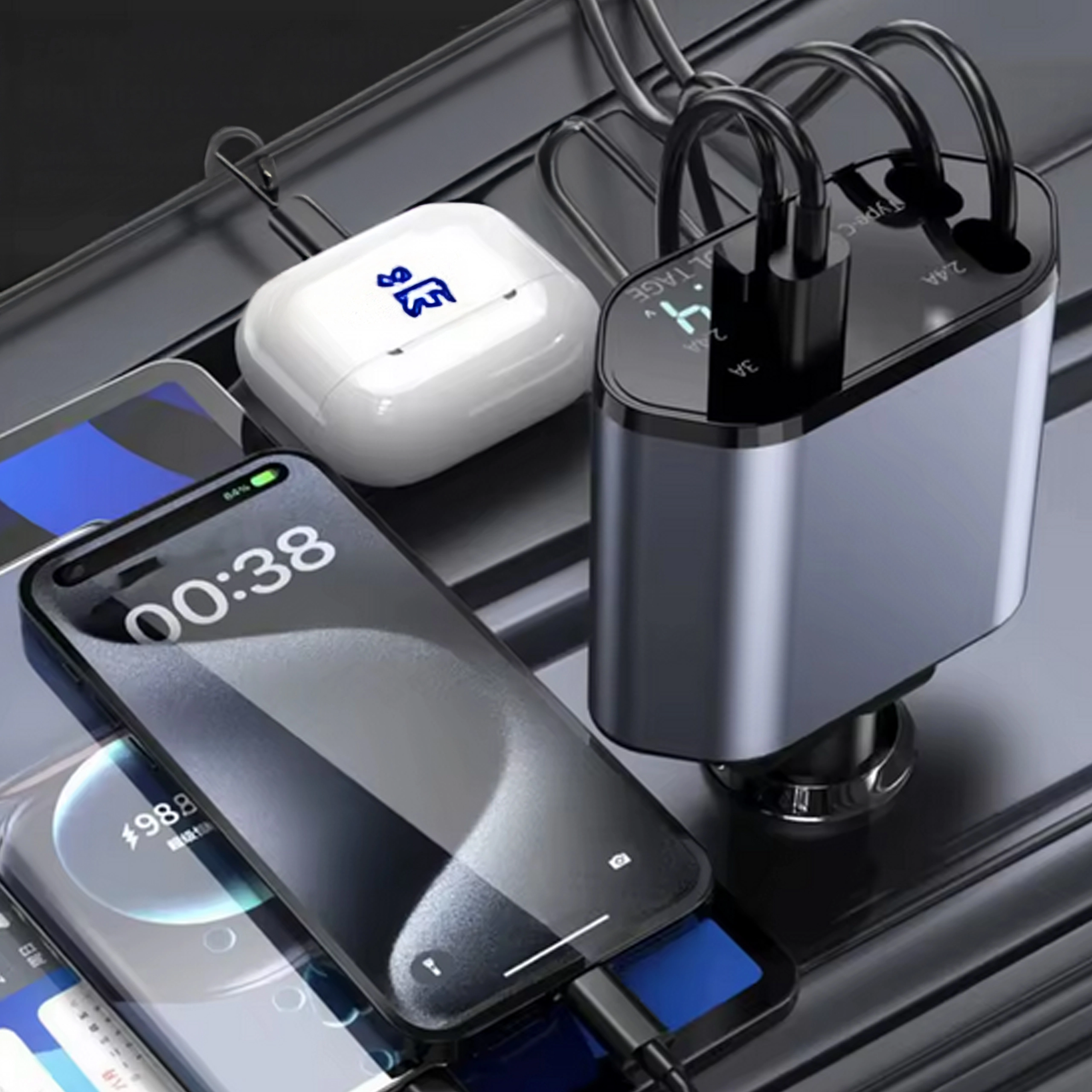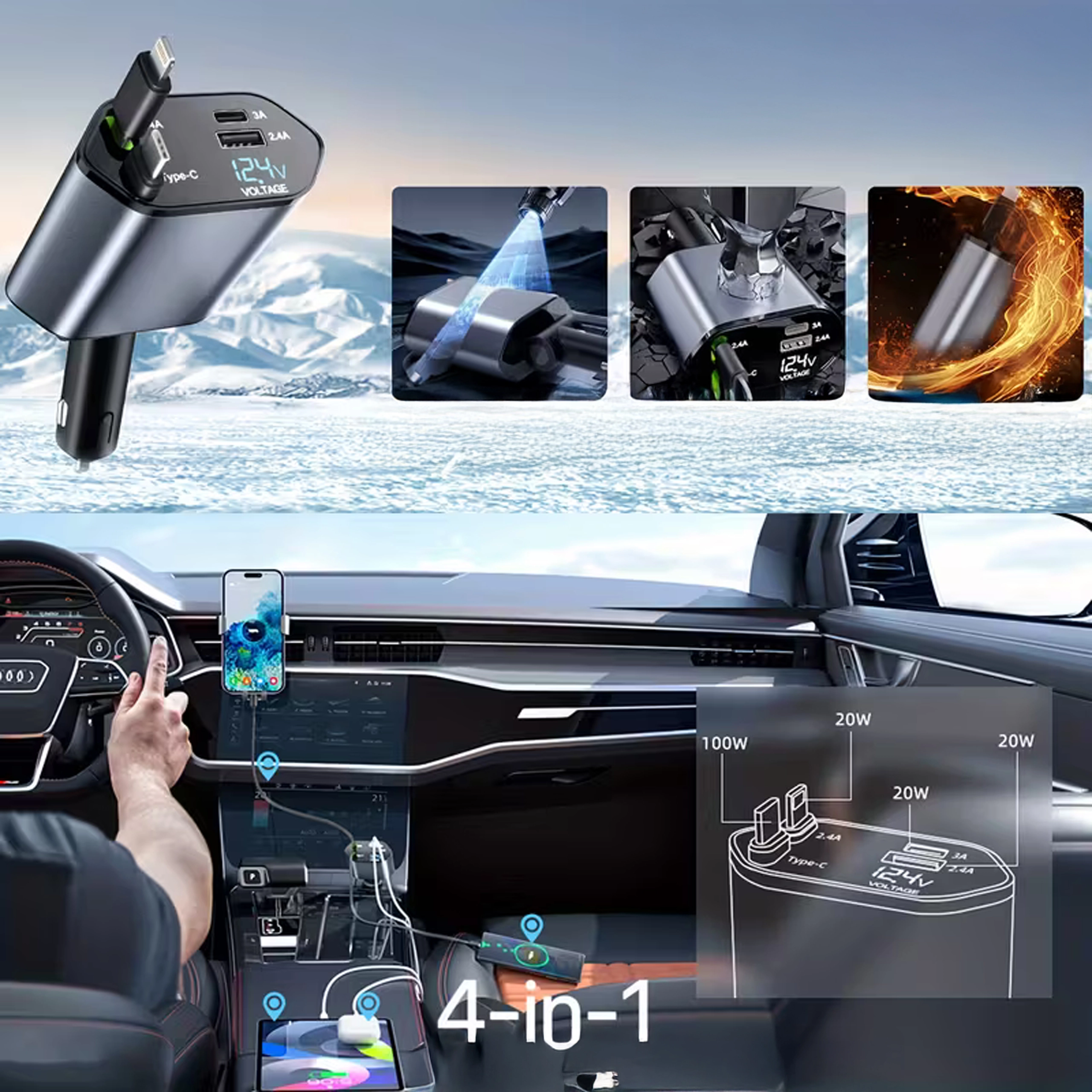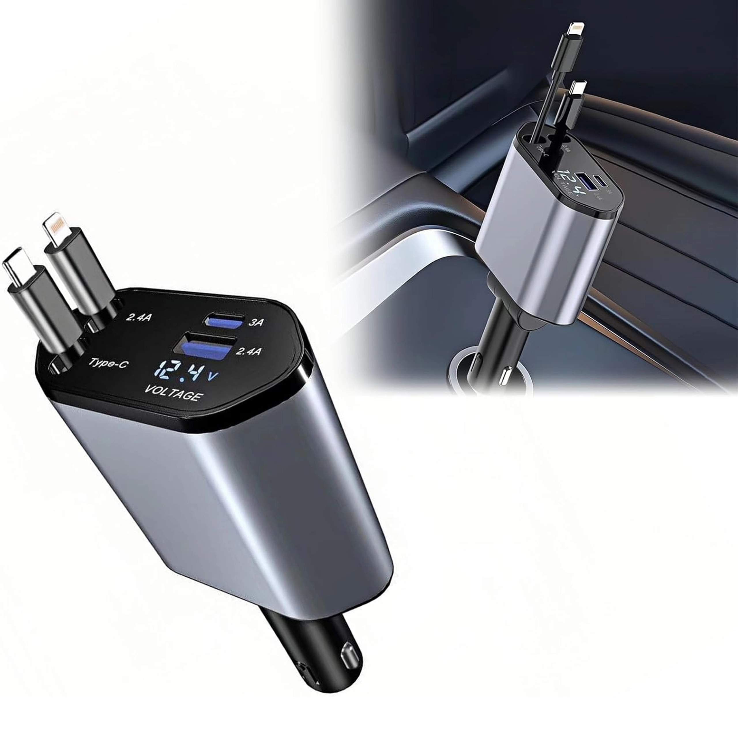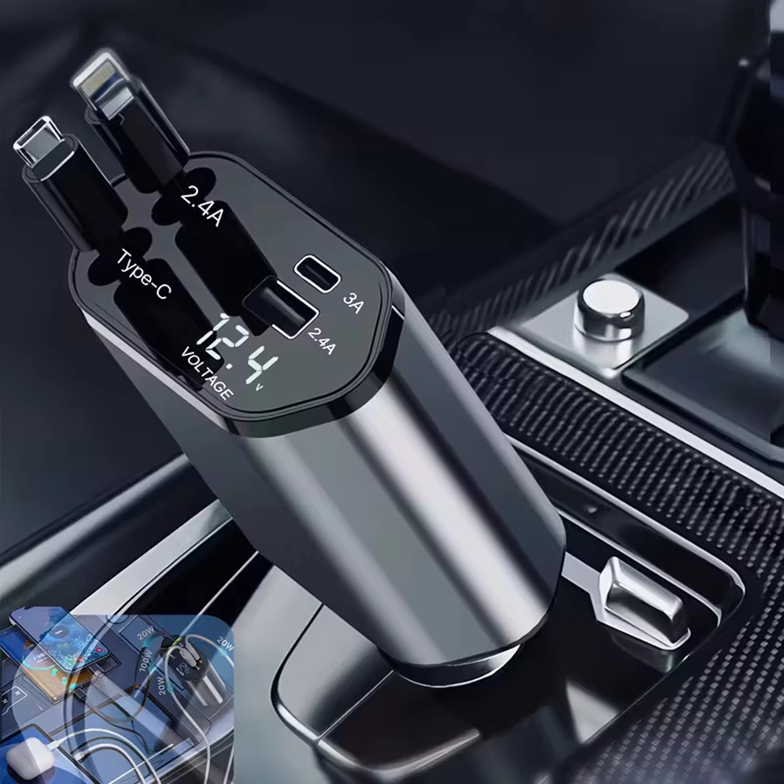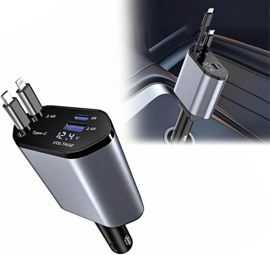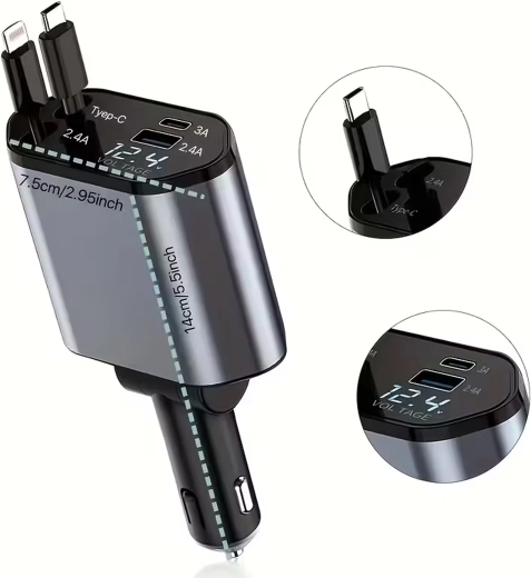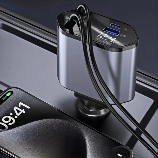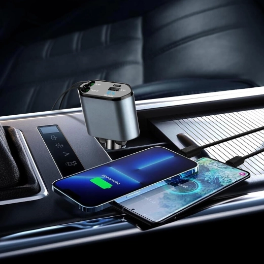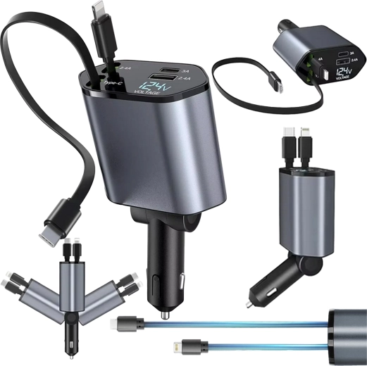 Ta nowoczesna ładowarka samochodowa 4w1 łączy wysoką wydajność z praktycznością. Szybkie ładowanie 100 W zapewnia energię nawet dla bardziej wymagających urządzeń, a inteligentny układ chroni przed przepięciem, przegrzaniem i zwarciem. Dzięki zwijanym kablom utrzymasz porządek we wnętrzu auta, a przewody zawsze będą w idealnej długości.