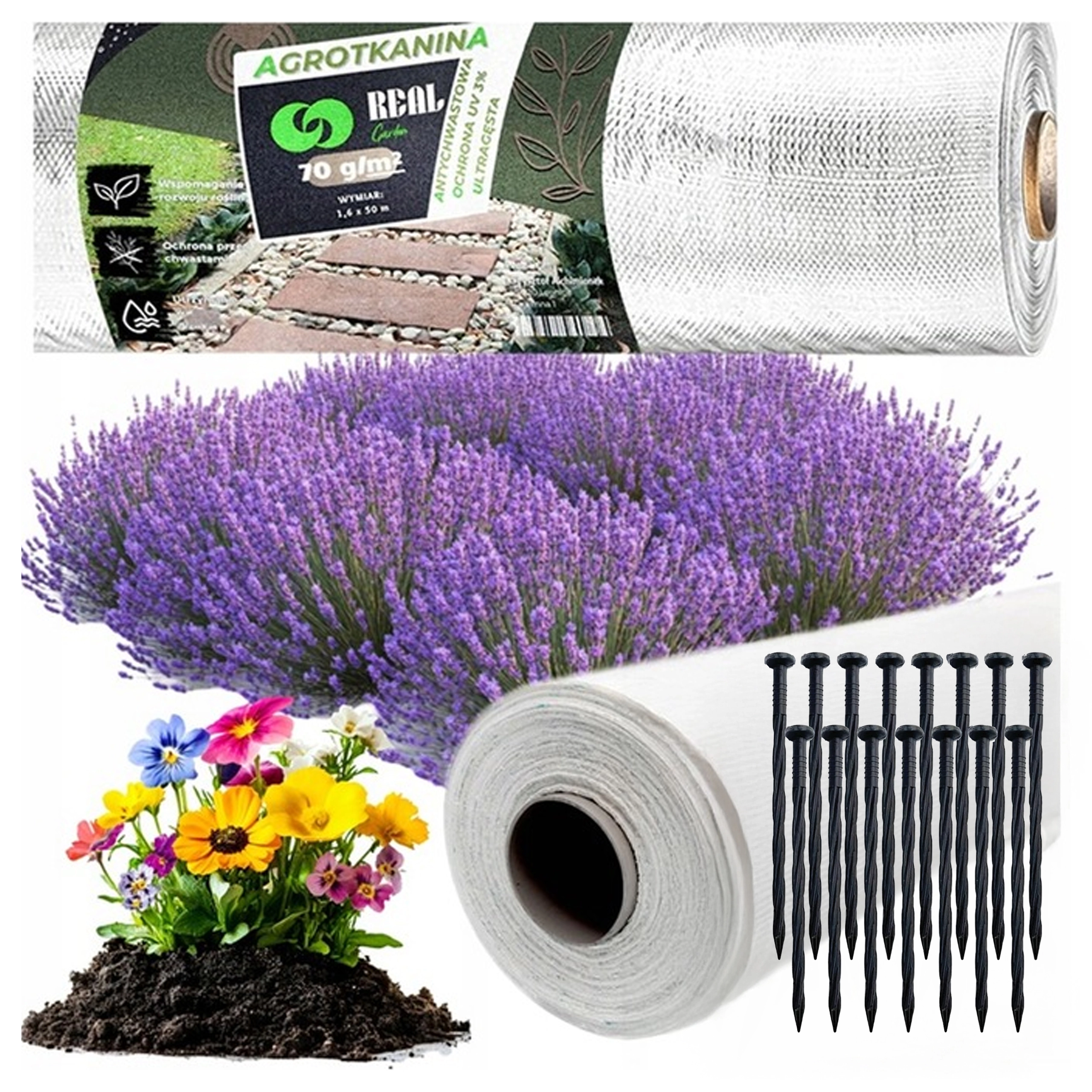 Wskazówka dotycząca użycia: Przed ułożeniem odchwaść powierzchnię, wyrównaj teren, rozwiń tkaninę, przymocuj kotwami i natnij krzyżowe otwory pod nasadzenia. Na koniec przykryj dekoracyjną korą lub żwirem.