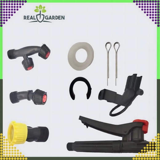 - Wymienne dysze do różnych typów oprysku (mgła, strumień, rozproszenie).