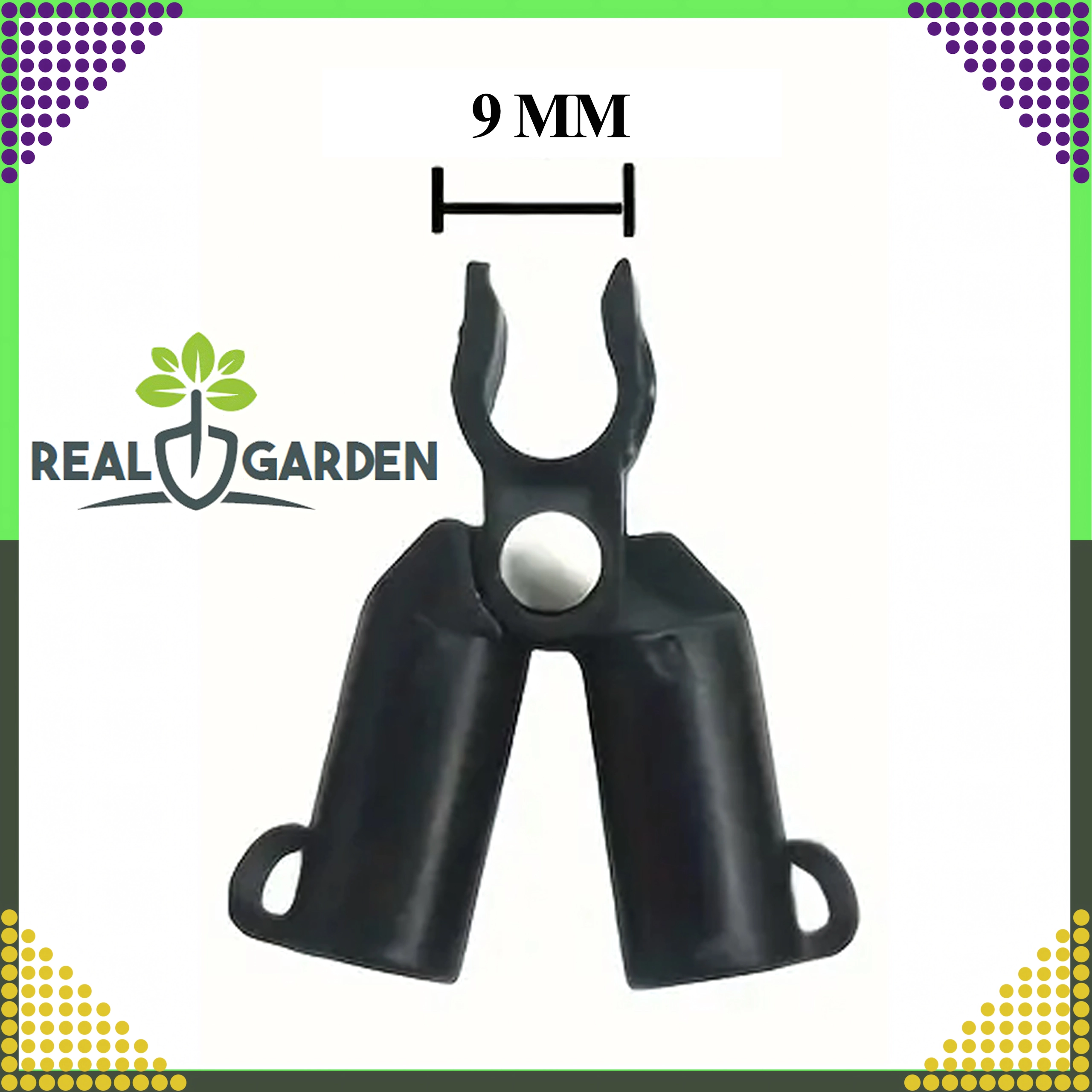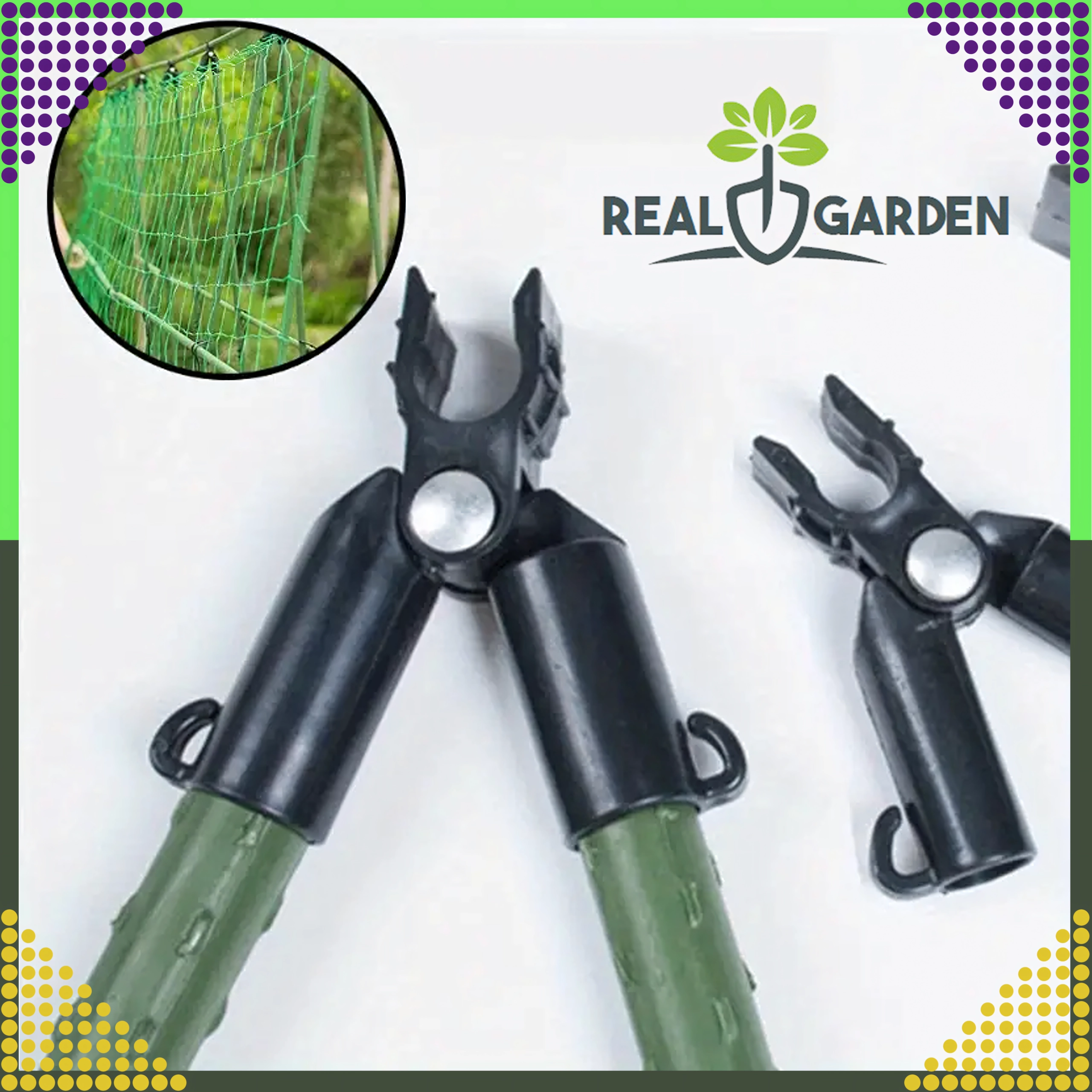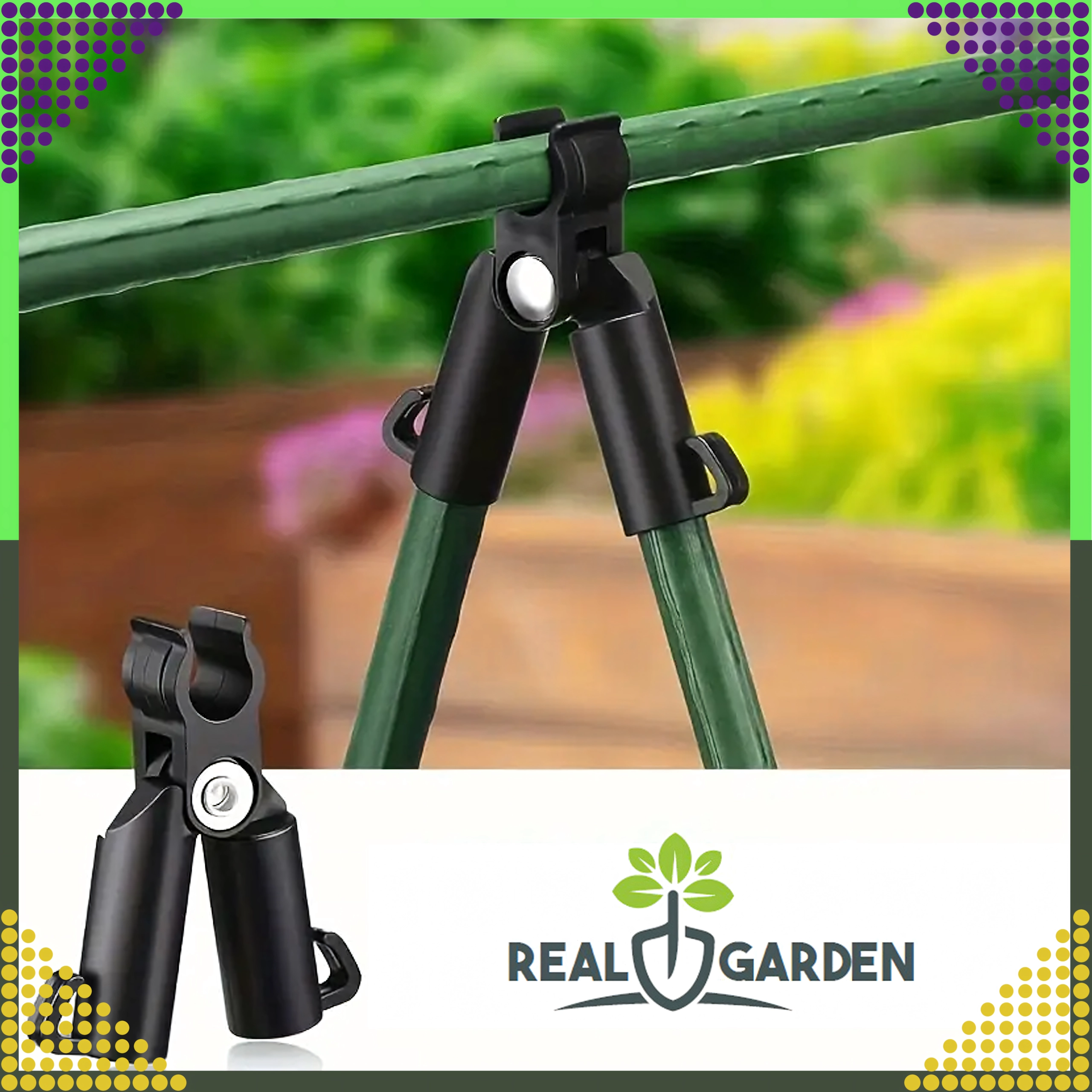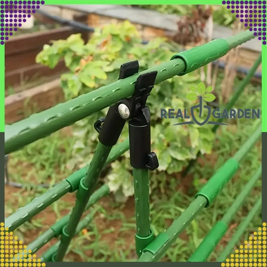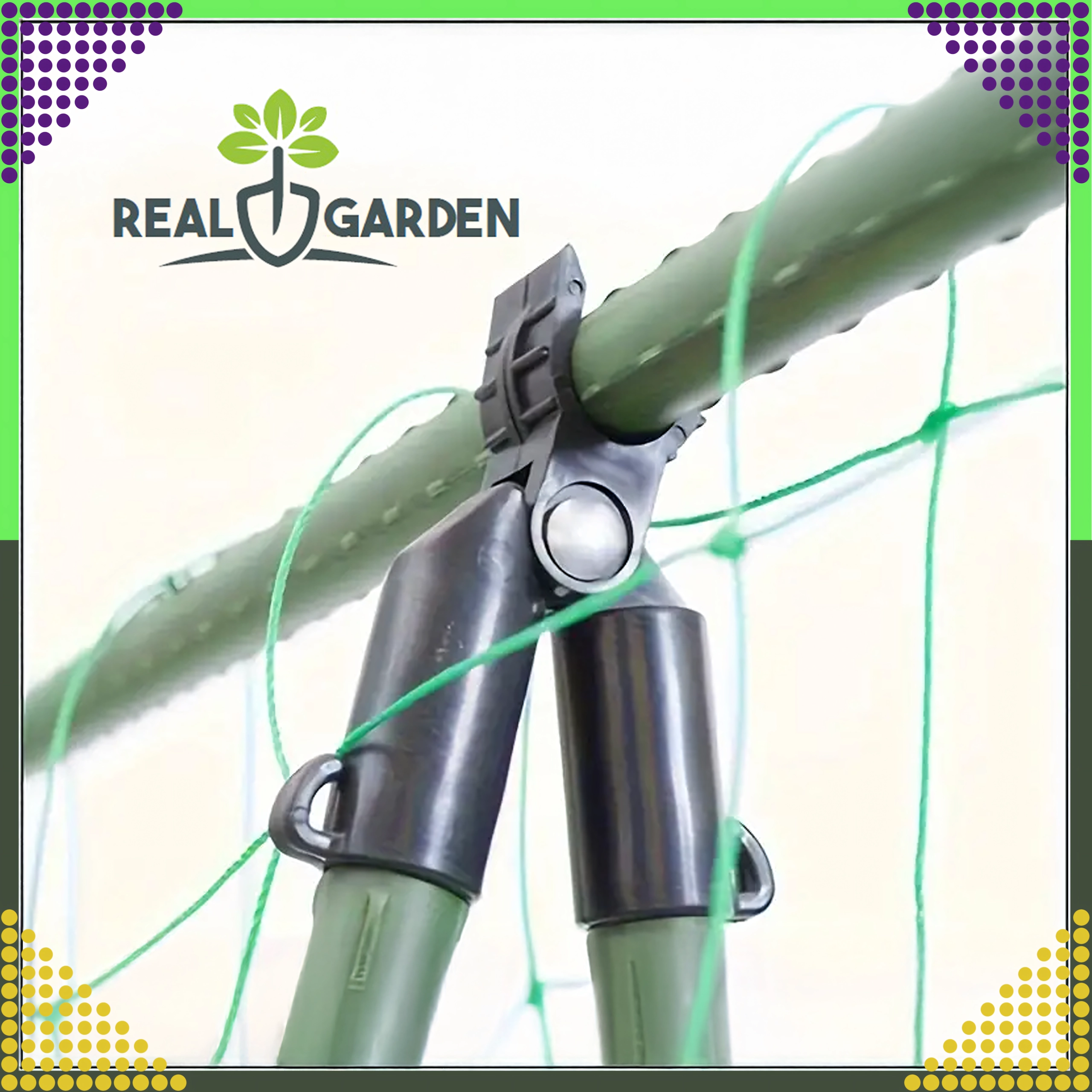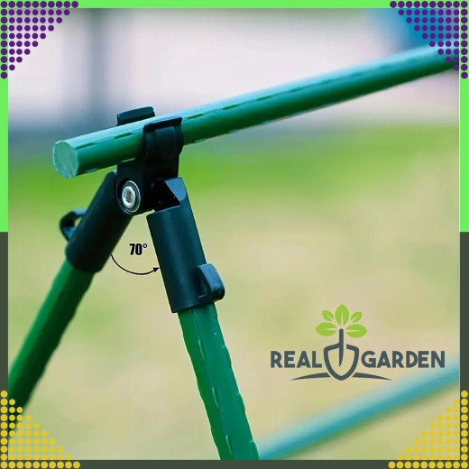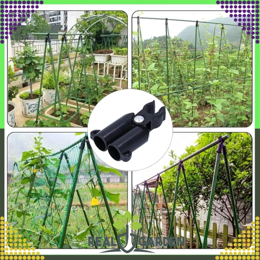 Szczytowy przegubowy łącznik T Real Garden ułatwia budowę ram, konstrukcji w kształcie litery A oraz podpór dla pomidorów, fasoli czy ogórków. Dzięki połączeniu mocnego plastiku i elementów metalowych zapewnia stabilne zespolenie ogrodowych prętów o średnicy 9 mm i sprawdza się podczas długotrwałego użytkowania na zewnątrz.