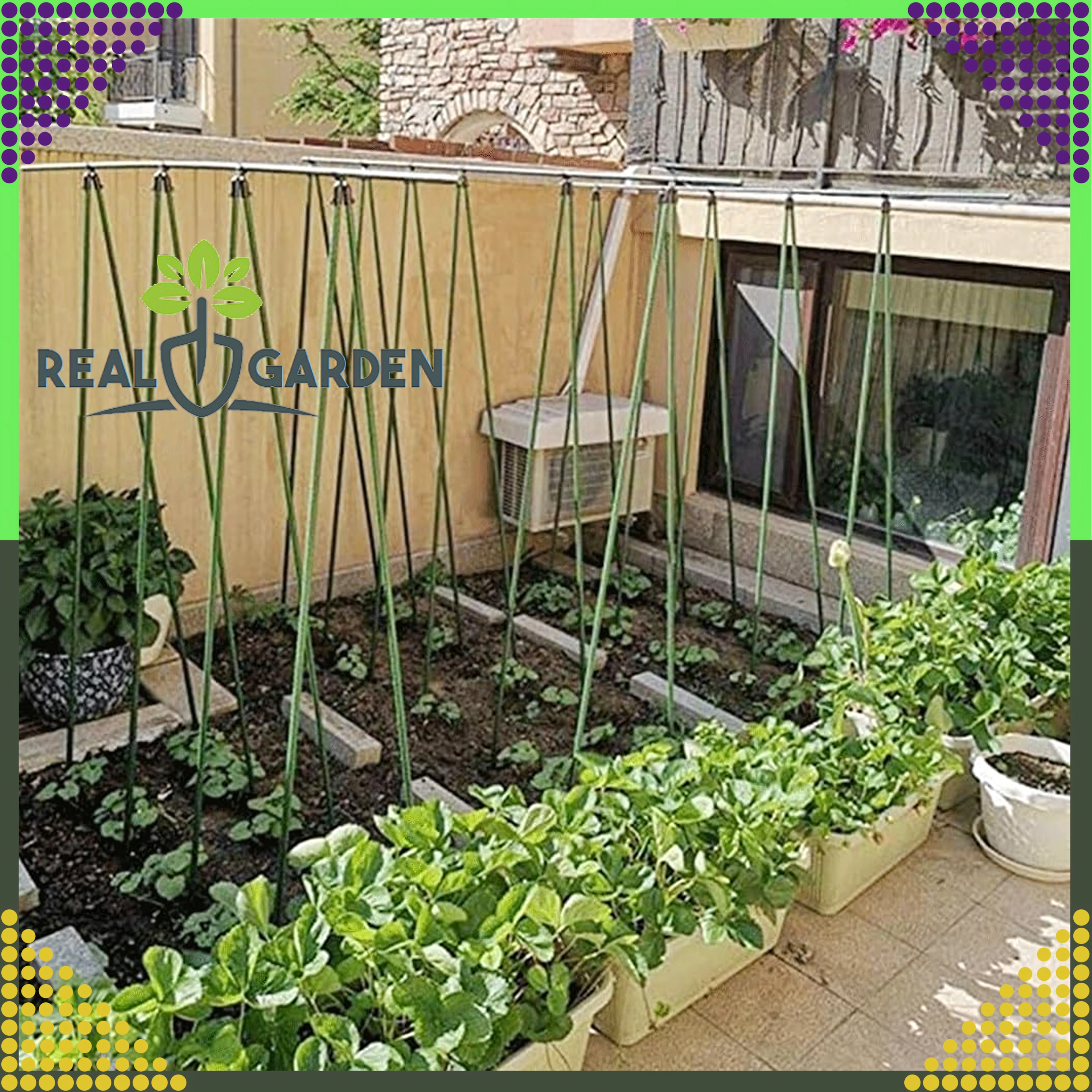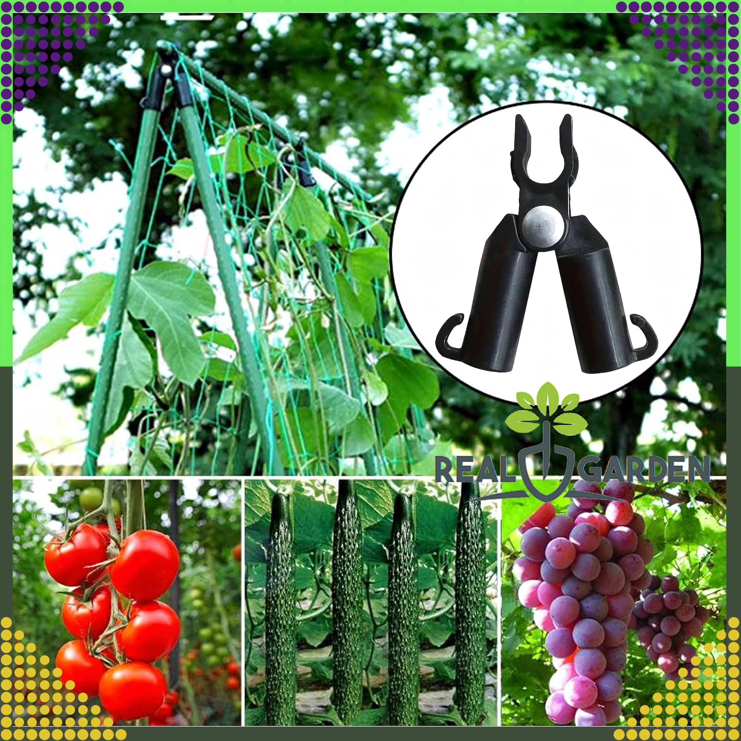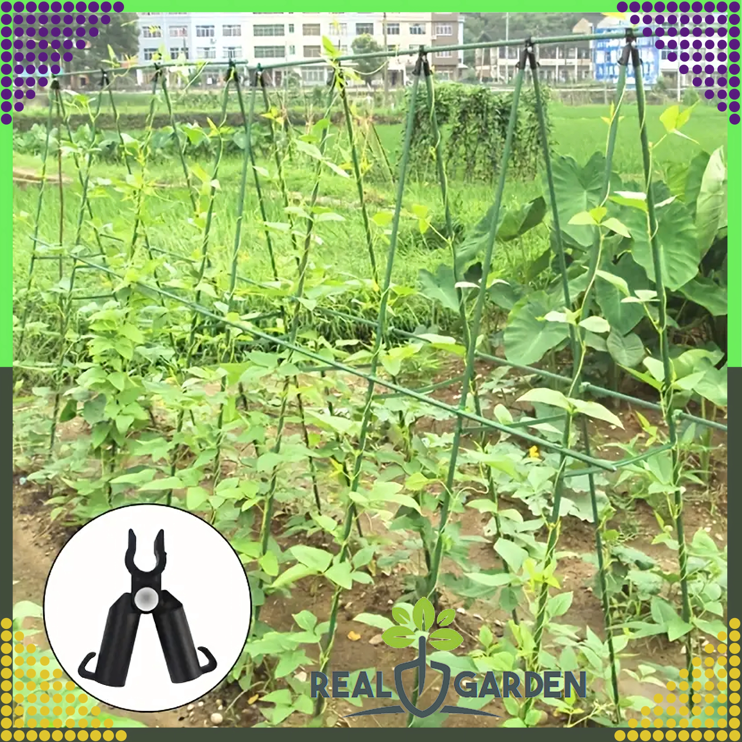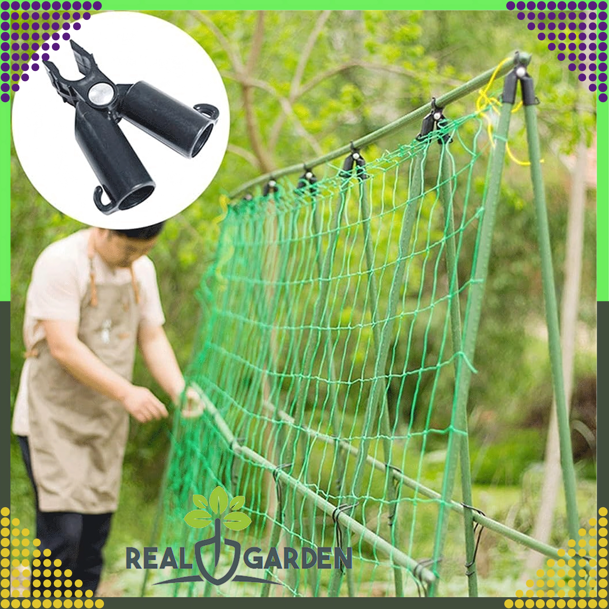 Szczytowy przegubowy łącznik T Real Garden ułatwia budowę ram, konstrukcji w kształcie litery A oraz podpór dla pomidorów, fasoli czy ogórków. Dzięki połączeniu mocnego plastiku i elementów metalowych zapewnia stabilne zespolenie ogrodowych prętów o średnicy 9 mm i sprawdza się podczas długotrwałego użytkowania na zewnątrz.