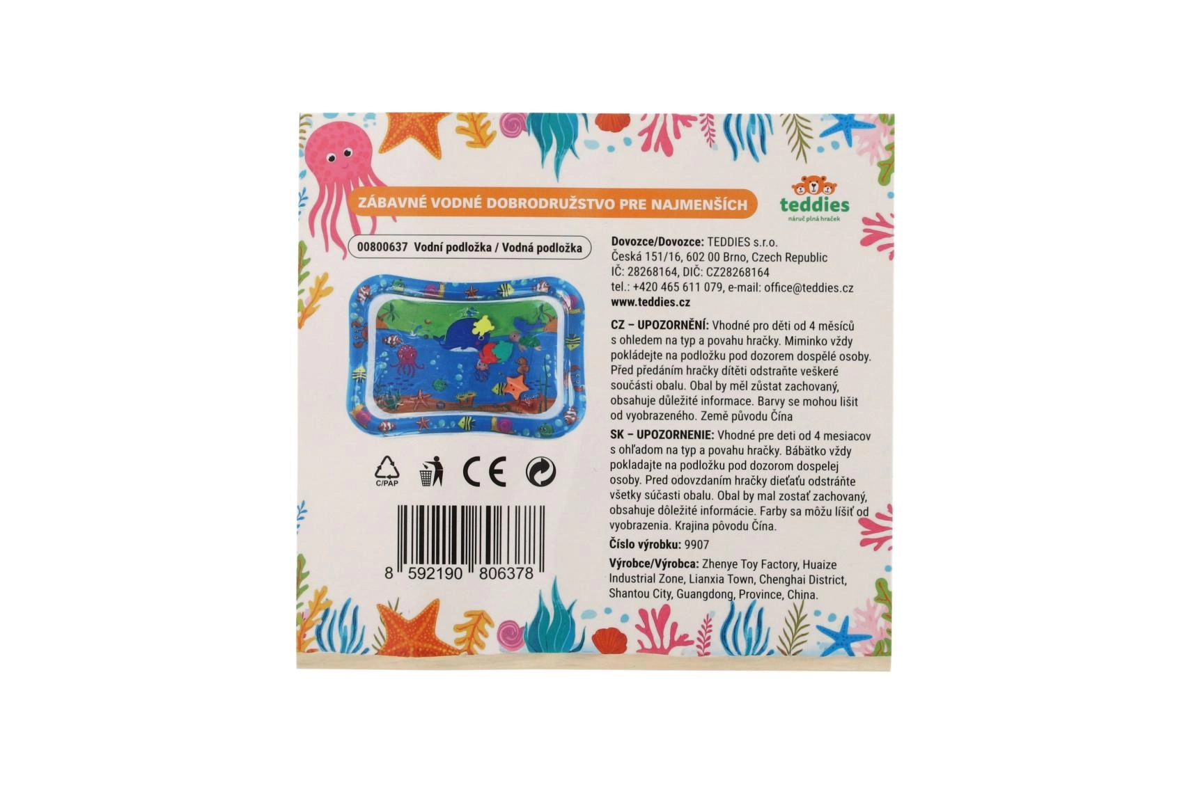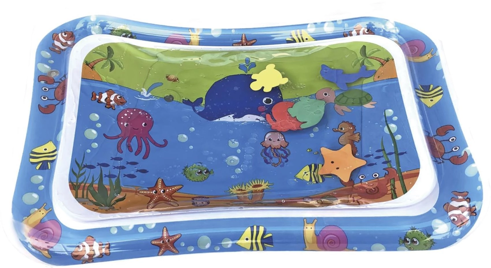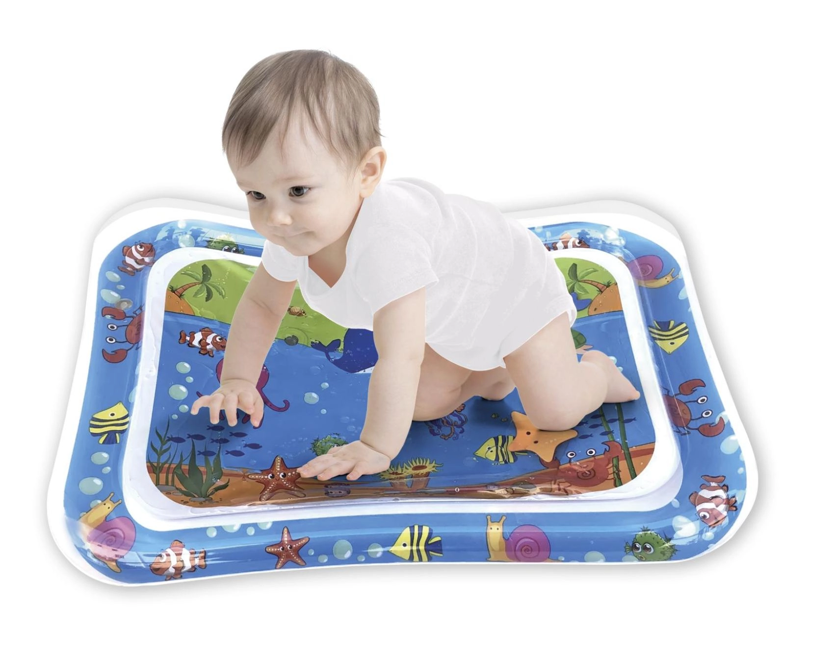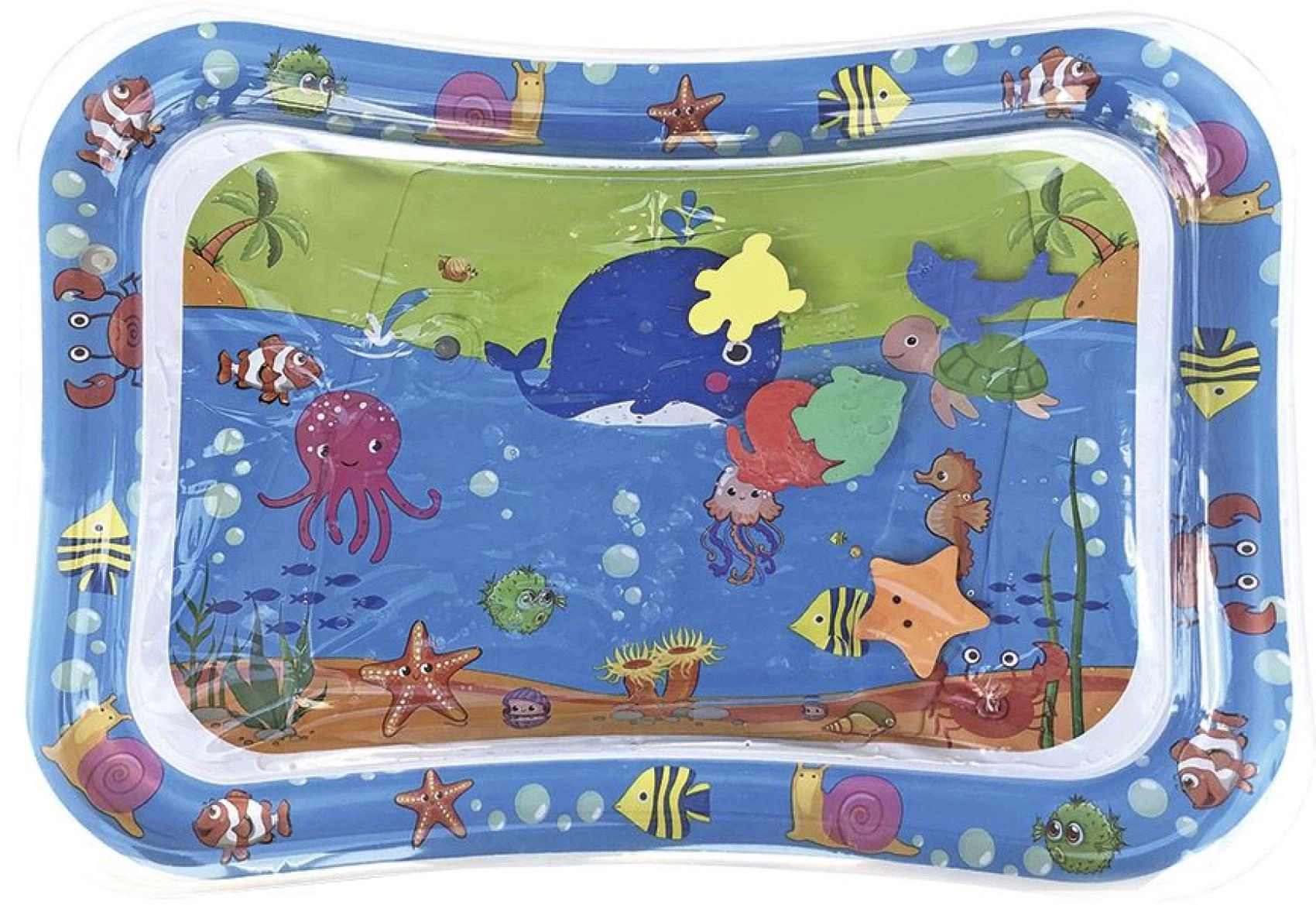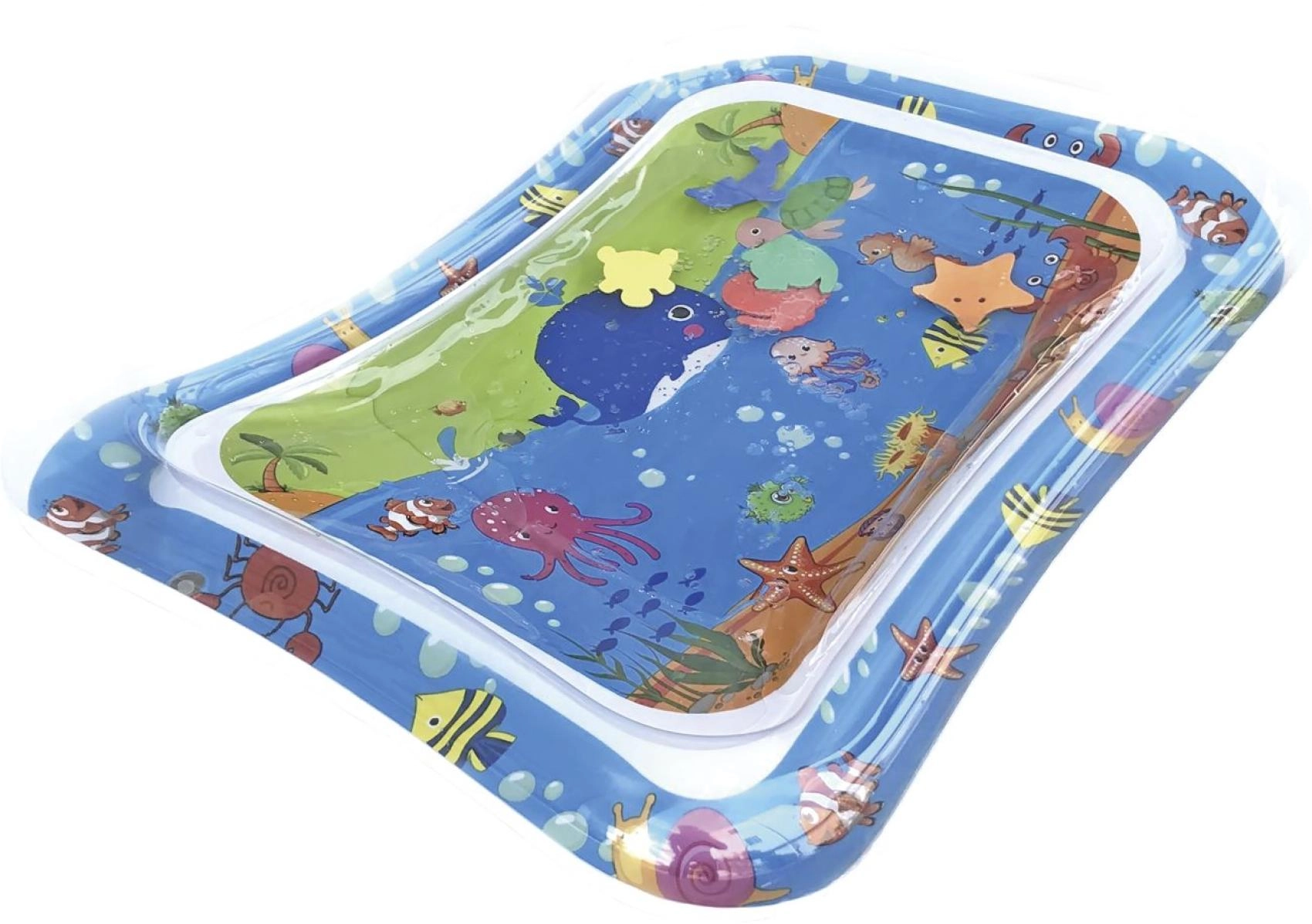 Ta nadmuchiwana wodna mata z oceanicznymi motywami oferuje dzieciom bezpieczne i zabawne środowisko do zabawy na brzuszku oraz pierwszych prób unoszenia główki. Komora wodna z pływającymi kształtami tworzy efekt ruchu, który naturalnie pobudza wzrok, dotyk i koordynację oko–ręka.