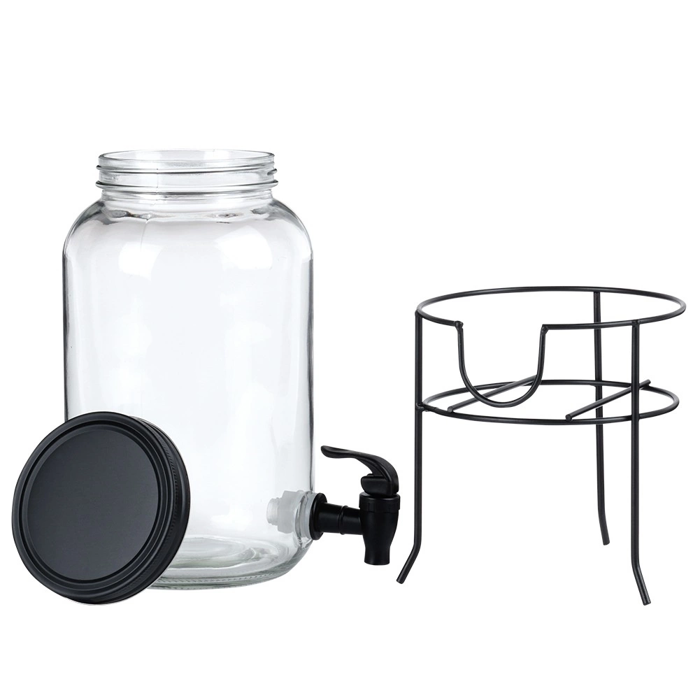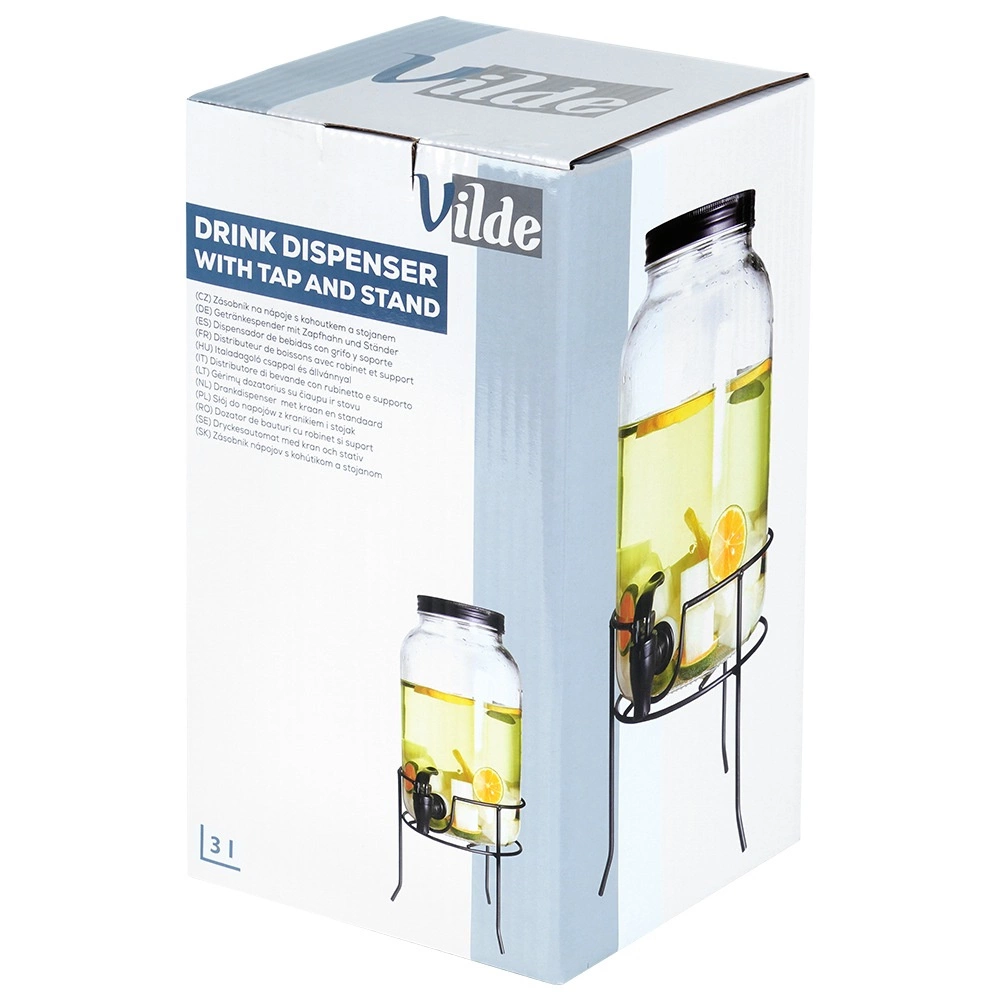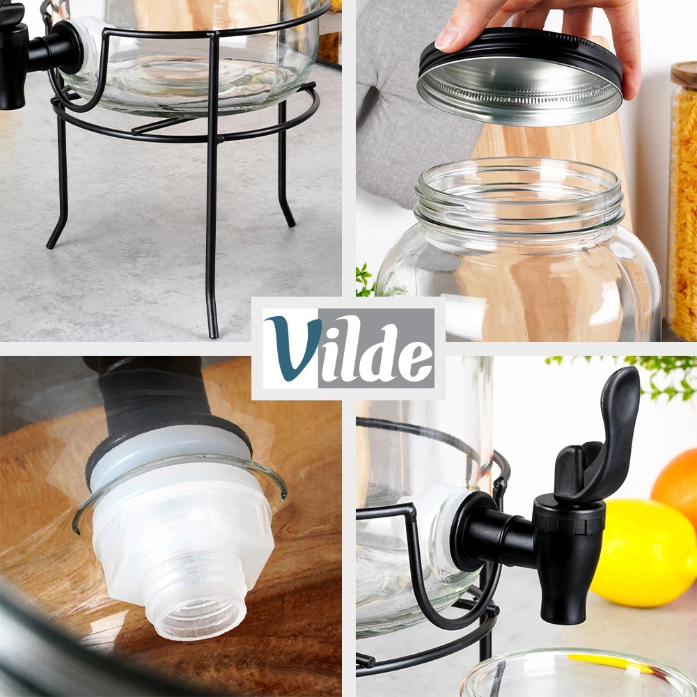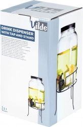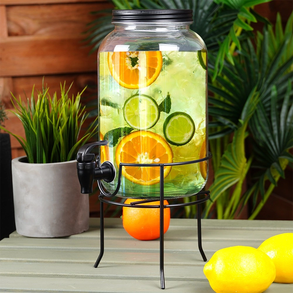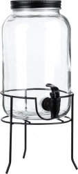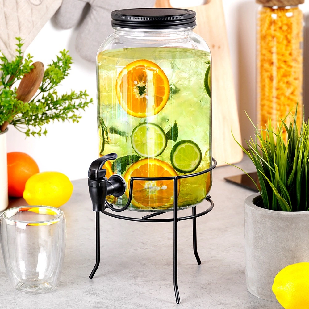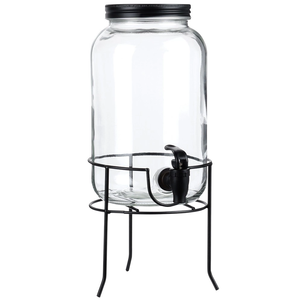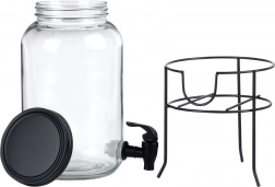 Praktyczny dyspenser do napojów z wysokiej jakości grubego szkła z czarnym kranikiem i matowym czarnym wieczkiem utrzyma Twoje orzeźwiające napoje z daleka od owadów i zanieczyszczeń. Stabilna metalowa podstawka unosi pojemnik do idealnej wysokości dla szklanek, dzięki czemu nalewanie jest czyste i wygodne.