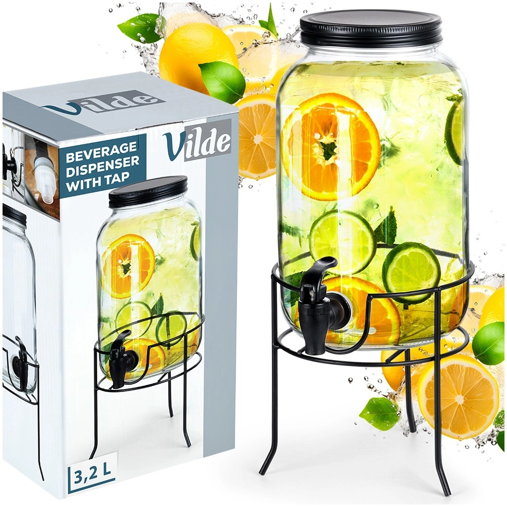 Stylowy szklany dyspenser o pojemności 3,2 l z nakręcanym wieczkiem, kranikiem i solidną metalową podstawką dla wygodnego nalewania. Idealny do lemoniad, ponczów, mrożonych herbat oraz wody z owocami. Przezroczyste szkło pięknie podkreśla zawartość, a stabilna podstawka z nóżkami zapewnia komfortowe użytkowanie w domu, w ogrodzie i podczas przyjęć.