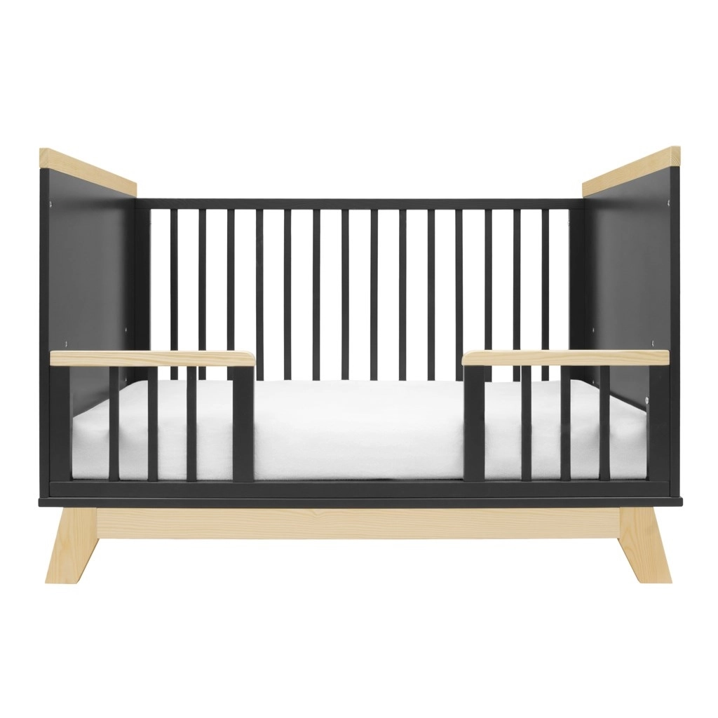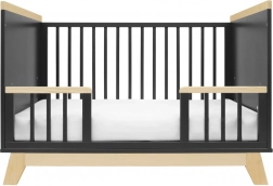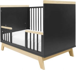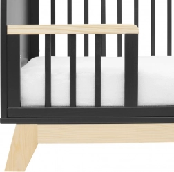 Łóżeczko łatwo dopasujesz do bieżących potrzeb: ma trzy poziomy wysokości stelaża oraz trzy wyjmowane szczebelki dla łatwiejszego dostępu. Gdy dziecko podrośnie, można zdjąć jeden bok i zastąpić go dołączoną barierką bezpieczeństwa, która wspiera samodzielność i jednocześnie chroni przed upadkiem.
