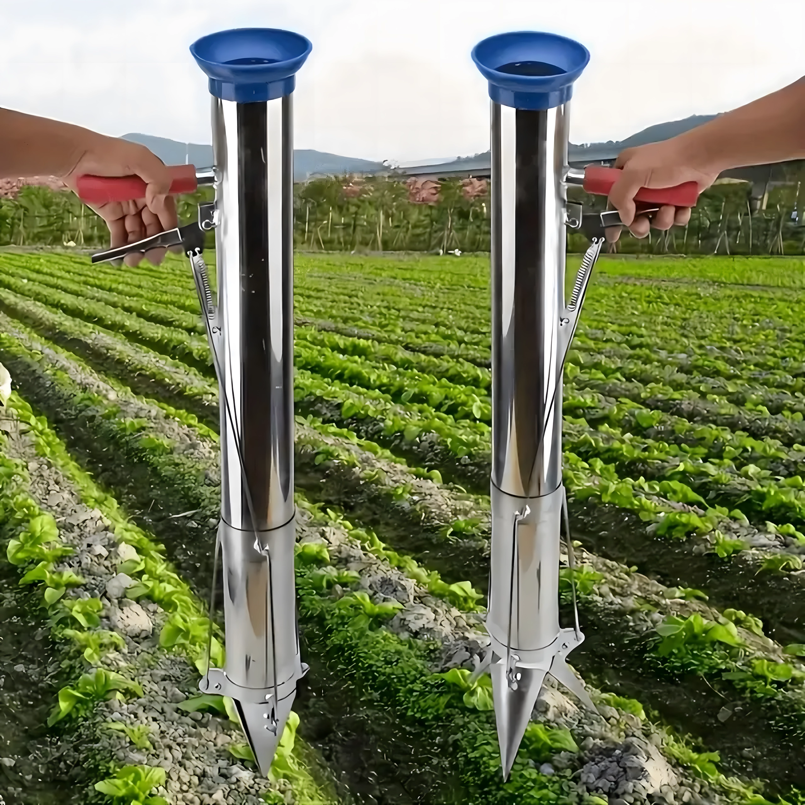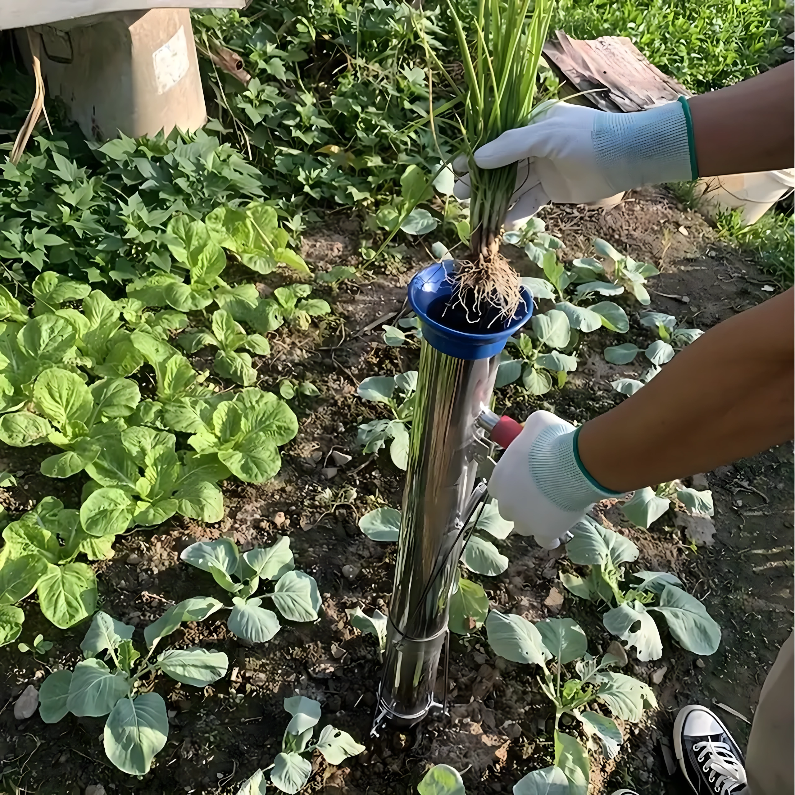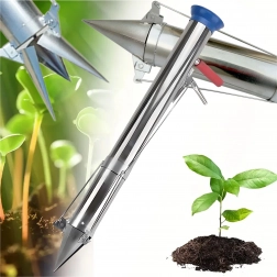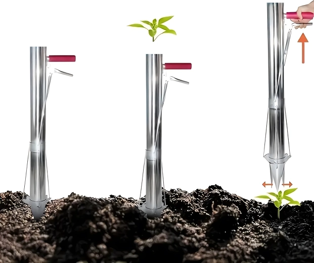 Stożkowa końcówka i cylindryczny korpus tworzą czysty otwór jednym dociśnięciem, wkładasz rozsadę, a dźwignią łatwo uwalniasz glebę z powrotem.