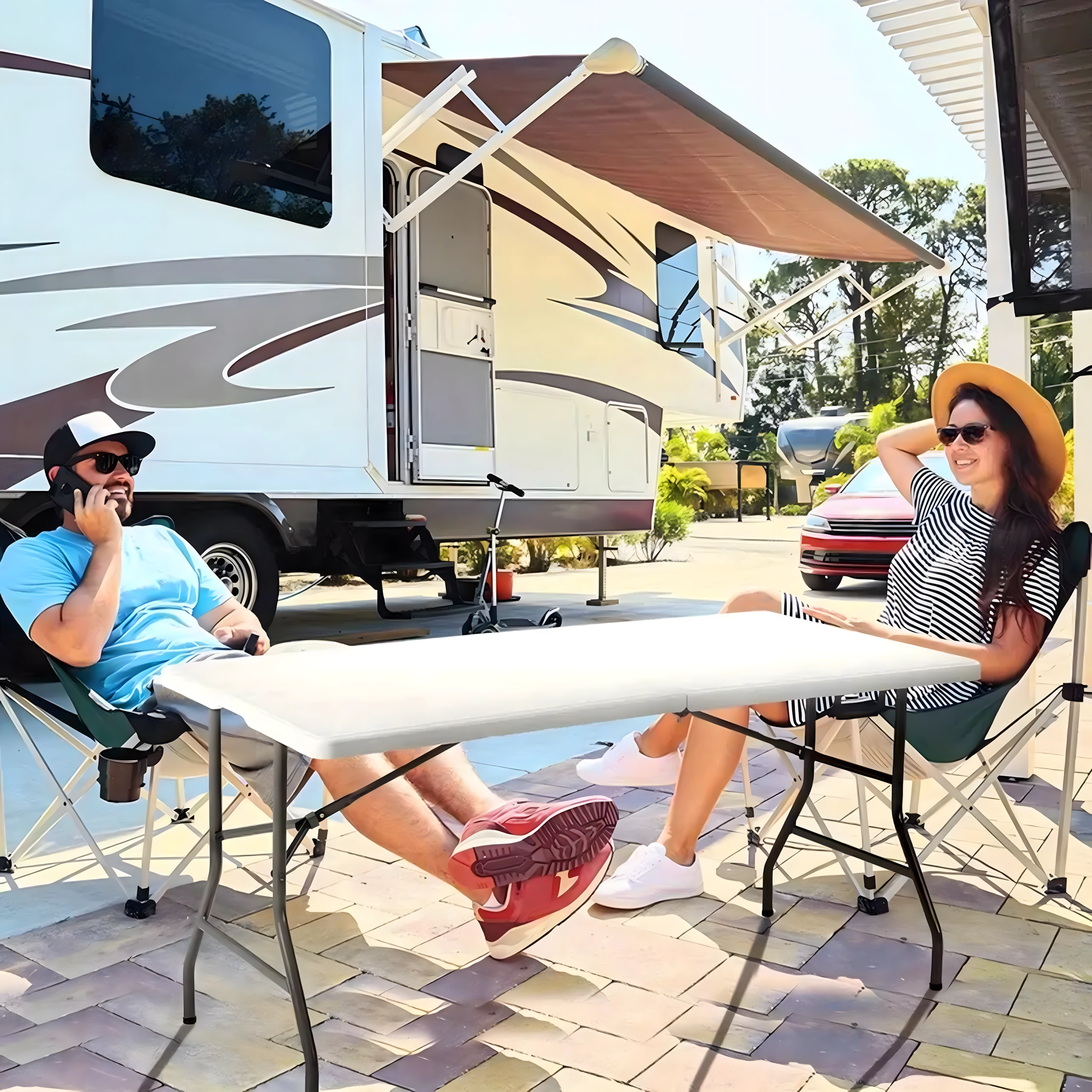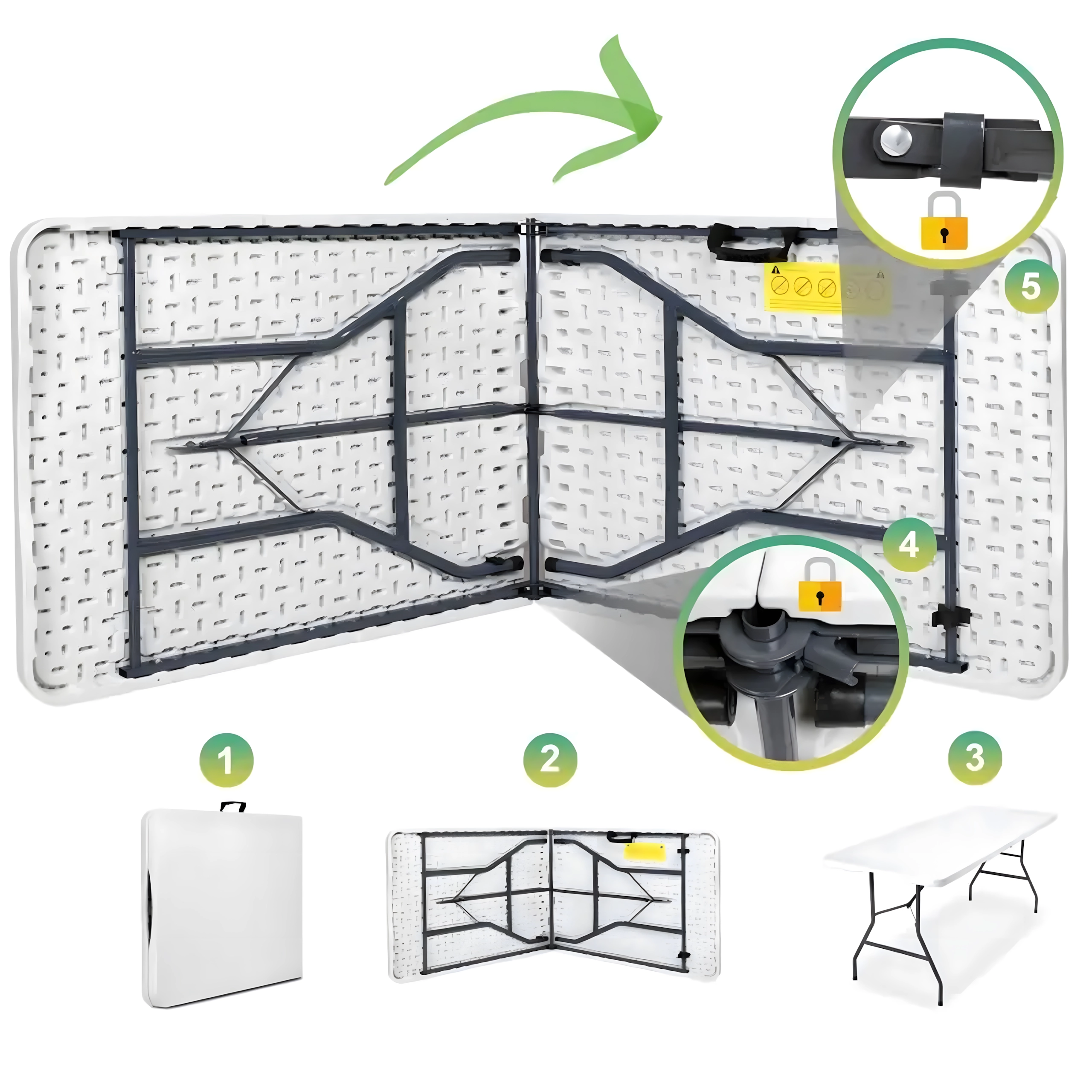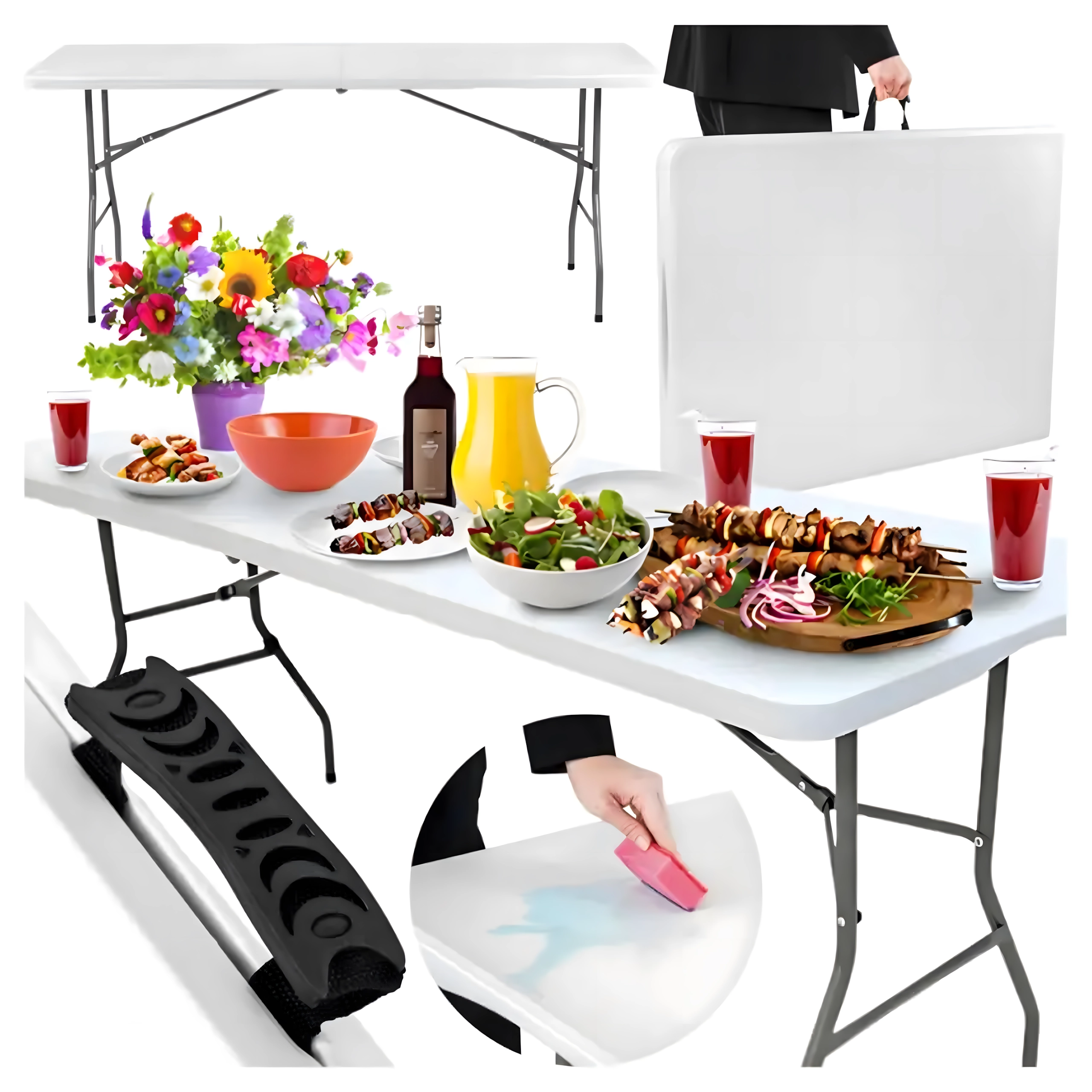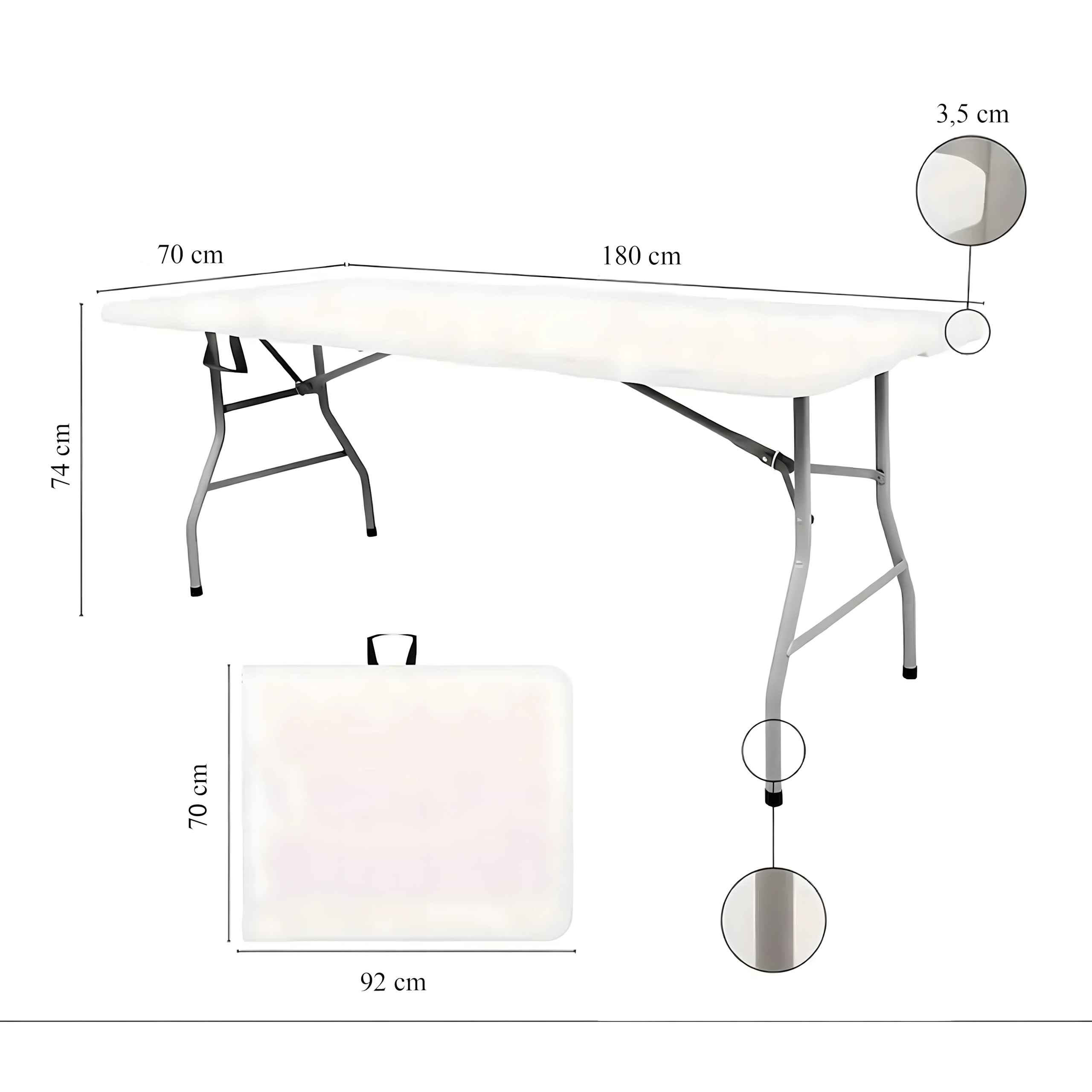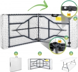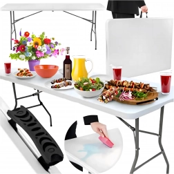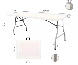 Praktyczny i przenośny składany stół o wymiarach 180 × 70 × 74 cm jest idealny na przyjęcia w ogrodzie, catering i biwakowanie. Ma odporny blat z tworzywa dla łatwego czyszczenia, stabilne stalowe nogi z zabezpieczeniem przed samoczynnym złożeniem, a po złożeniu zamienia się w walizkę z uchwytem do wygodnego przenoszenia.