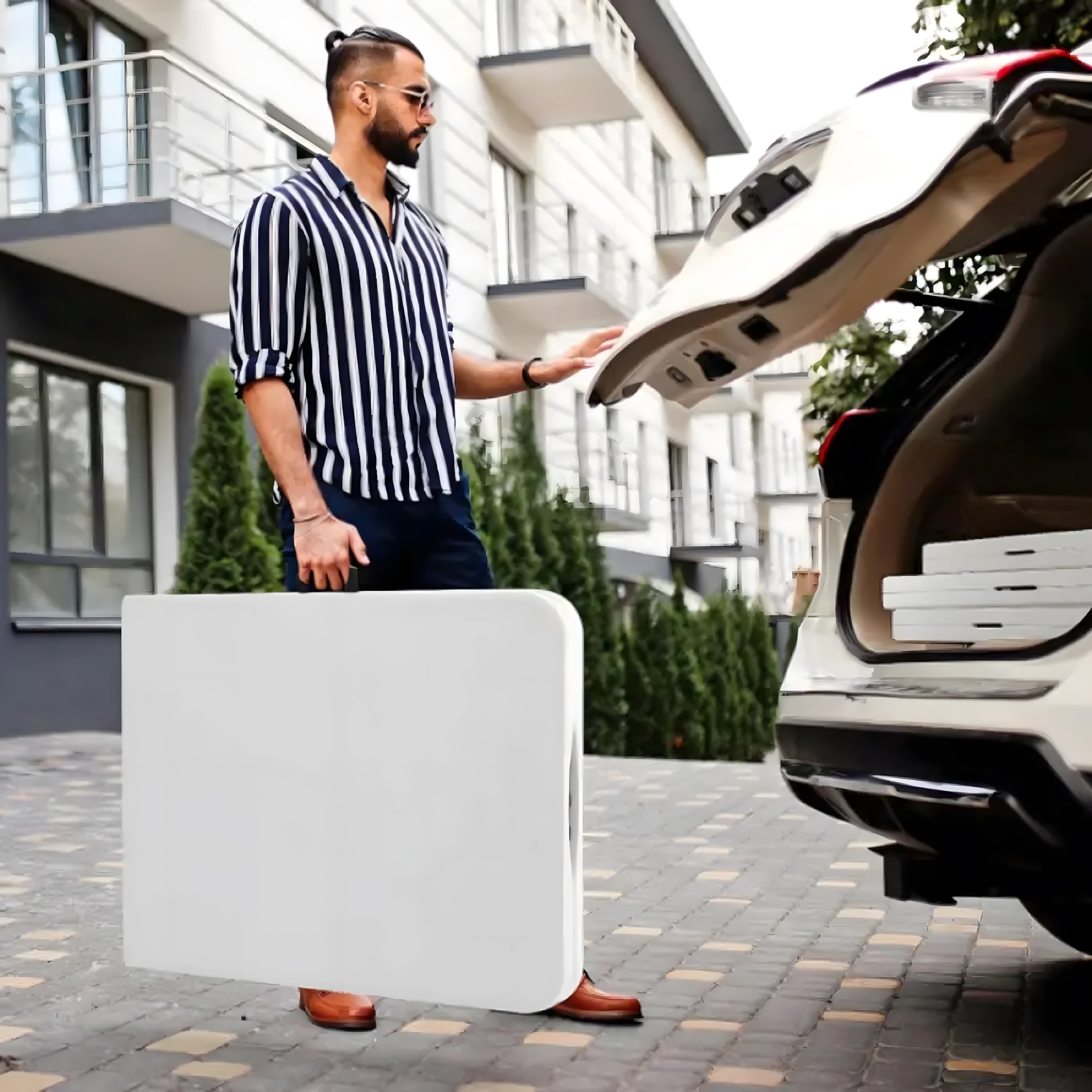 Stół składa się na pół do kompaktowej formy, a dzięki zintegrowanemu uchwytowi łatwo przeniesiesz go jedną ręką.