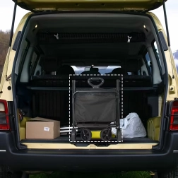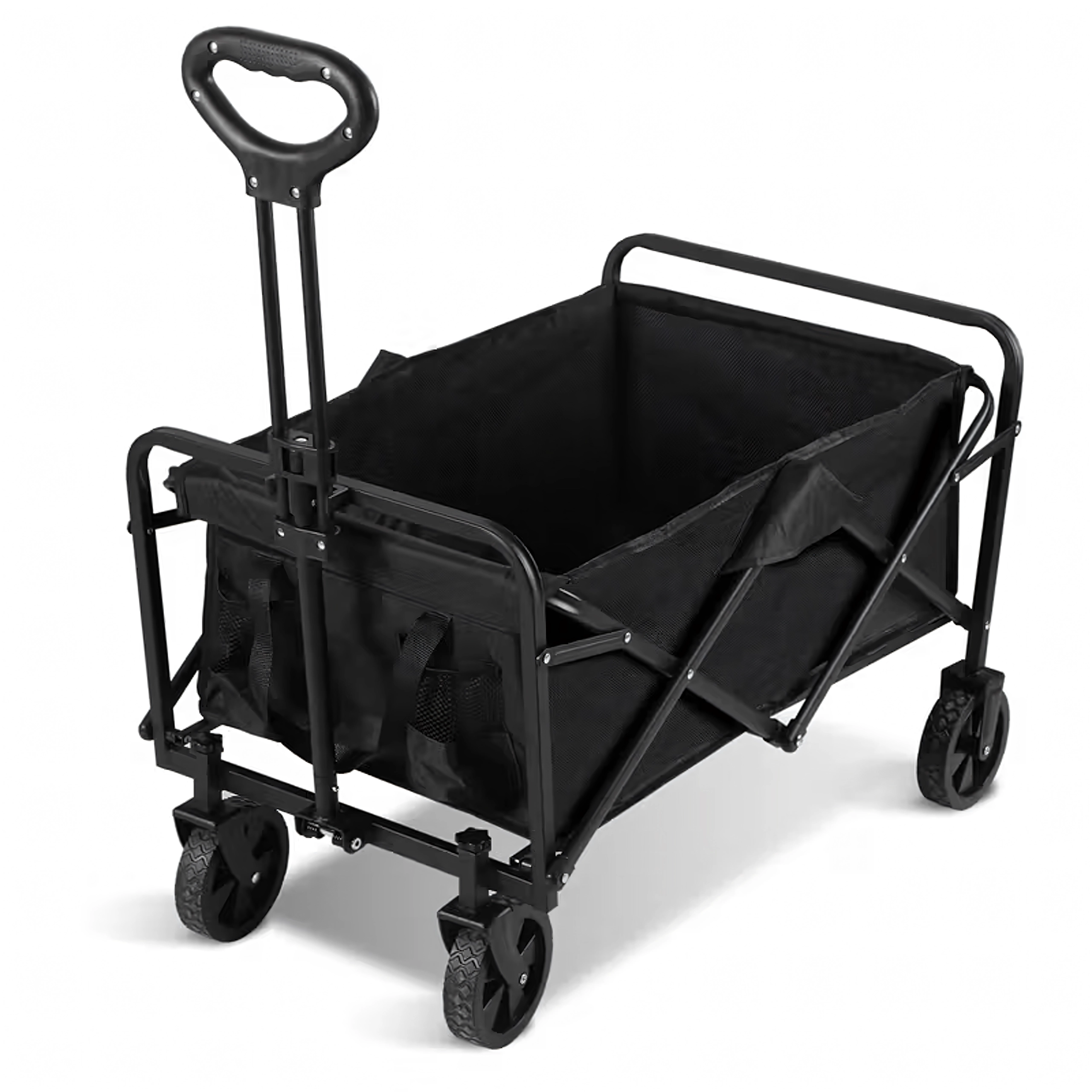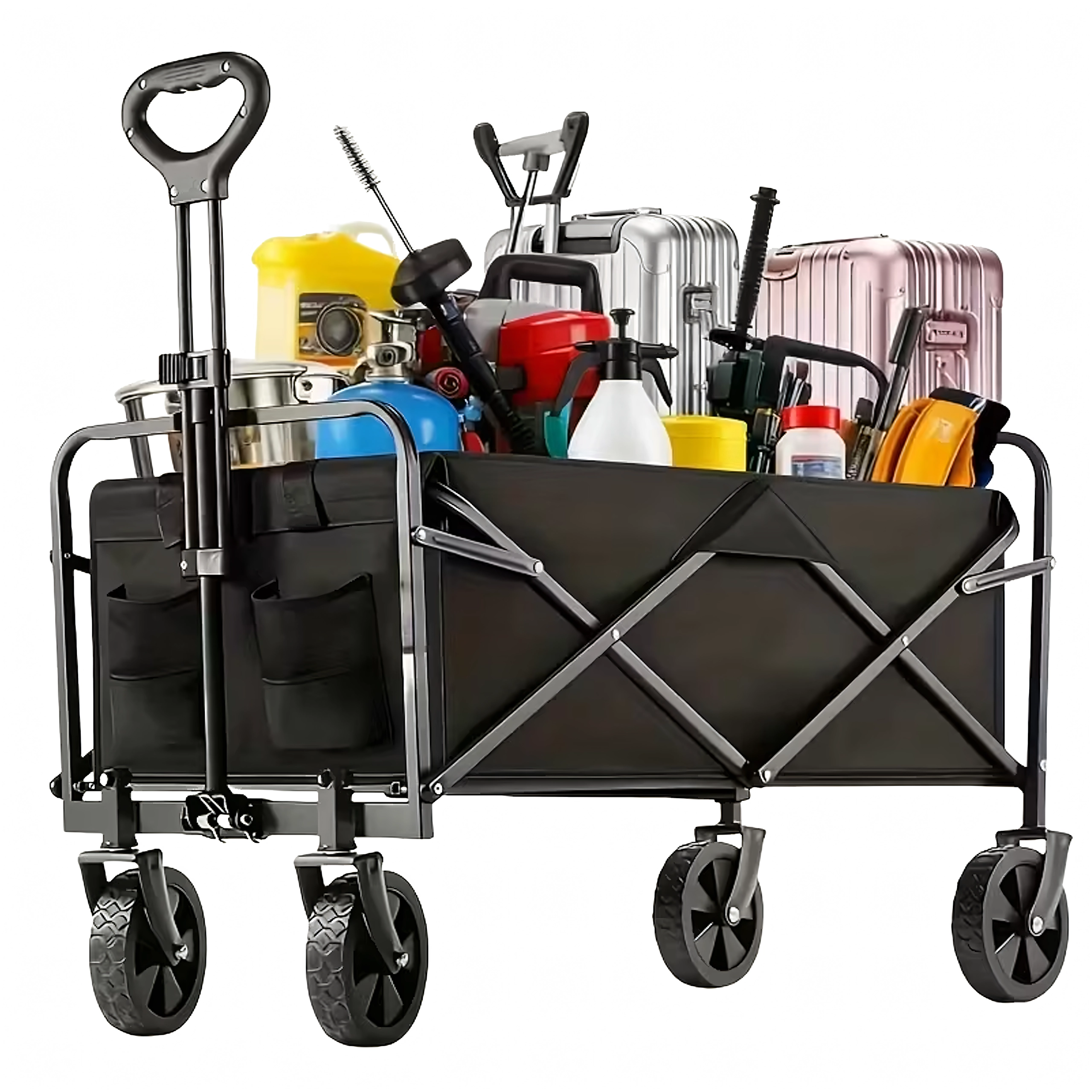 Po użyciu wózek w kilka sekund kompaktowo złożysz i schowasz do bagażnika auta lub do szafy. Praktyczne boczne kieszenie trzymają drobiazgi pod ręką, teleskopowa rączka ułatwia ciągnięcie, a stabilna konstrukcja utrzymuje kształt nawet przy pełnym obciążeniu.