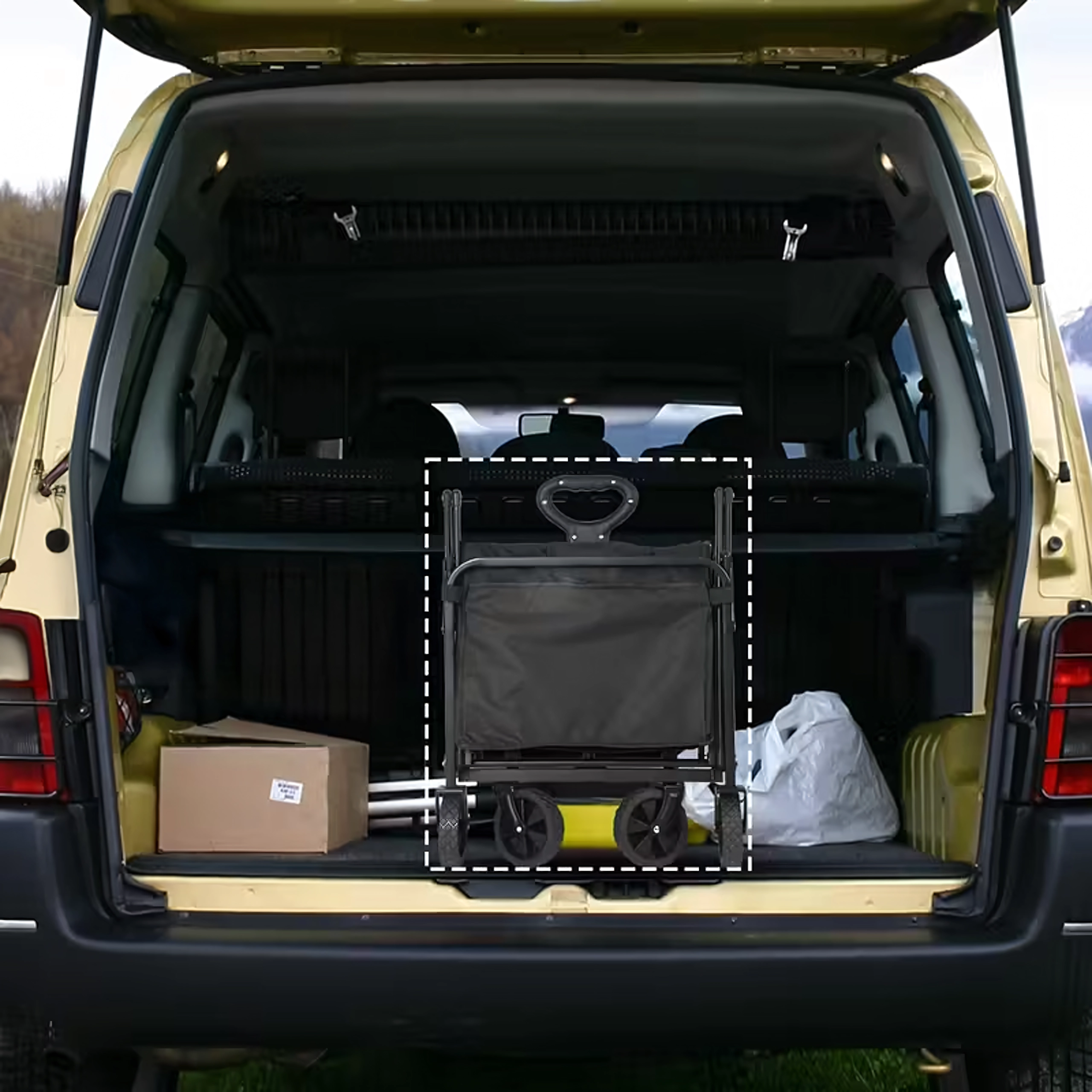 Składana stalowa rama i wytrzymała tkanina umożliwiają bezpieczny przewóz cięższego ładunku – od drewna po sprzęt kempingowy.