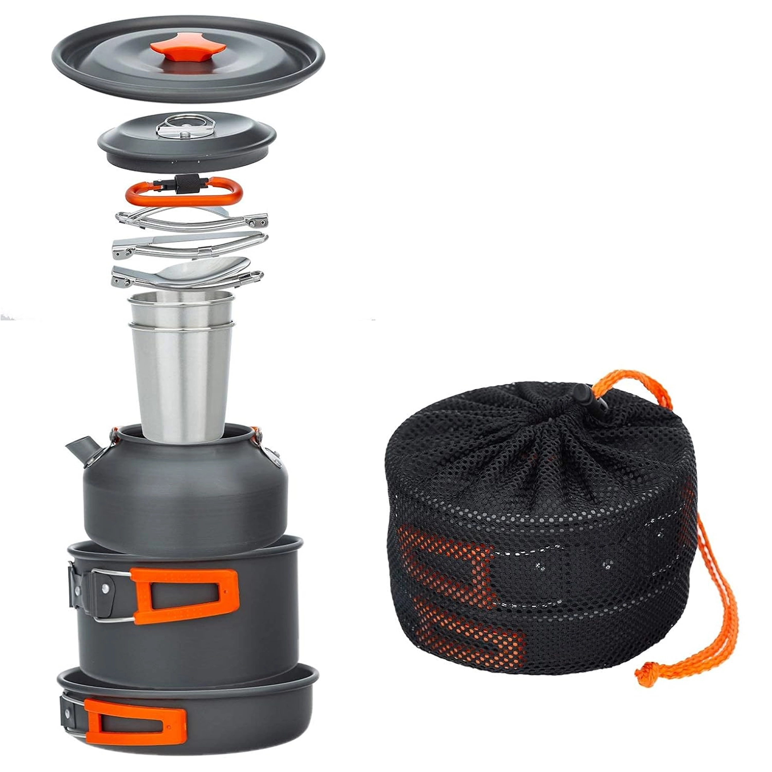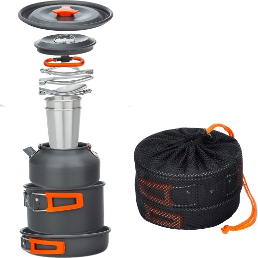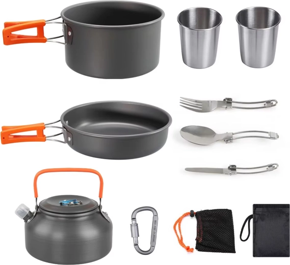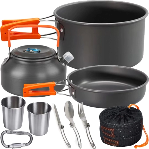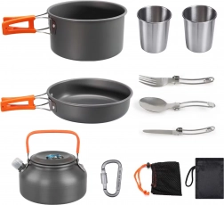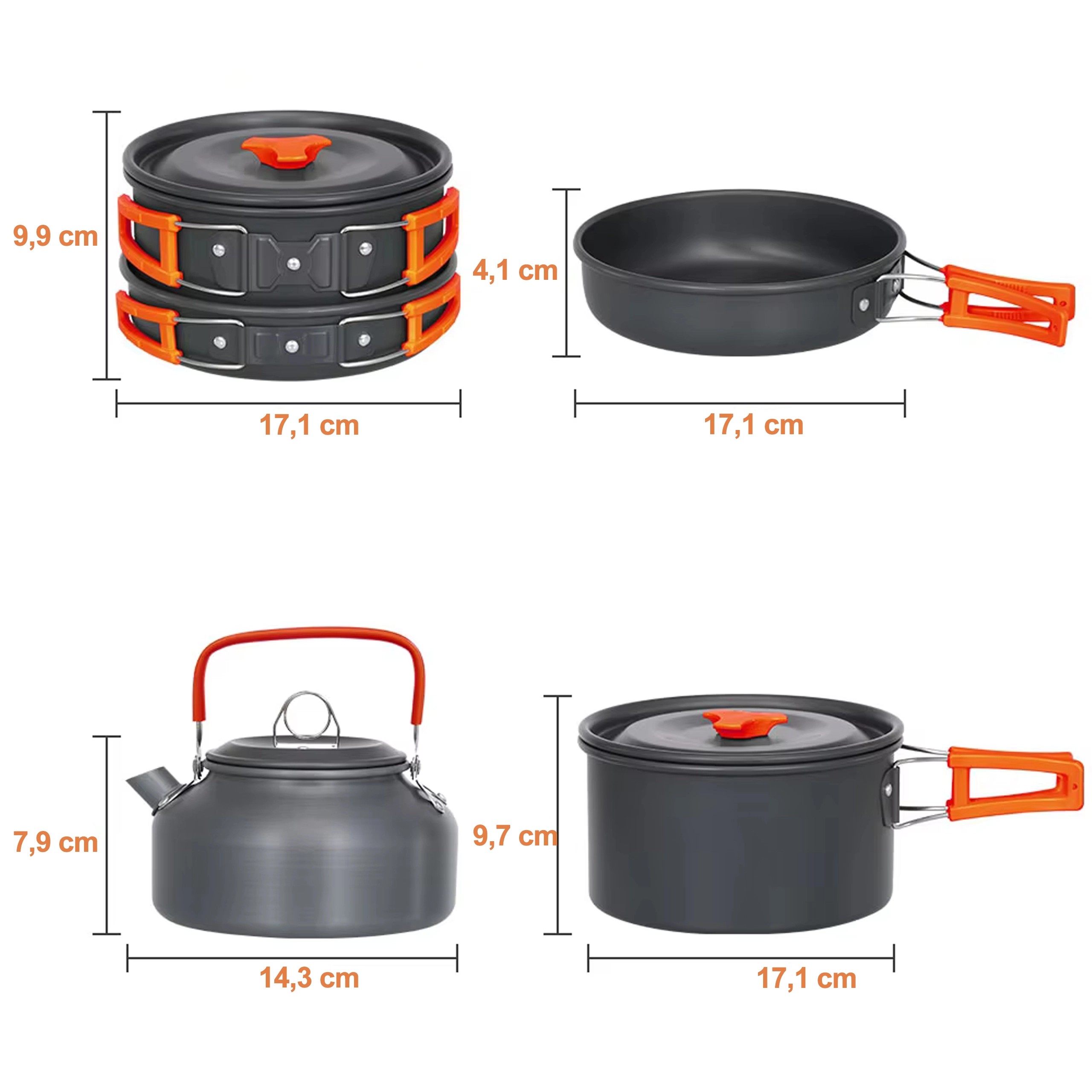 Praktyczny i lekki zestaw naczyń kempingowych dla 2 osób z garnkiem, patelnią, czajnikiem i dodatkami. Dzięki składanym uchwytom, kompaktowemu sztaplowaniu oraz wytrzymałej stalowej/metalowej konstrukcji idealny na biwak, wędrówki i podróże. W zestawie znajdują się także kubki oraz siatkowane etui dla łatwego przenoszenia.