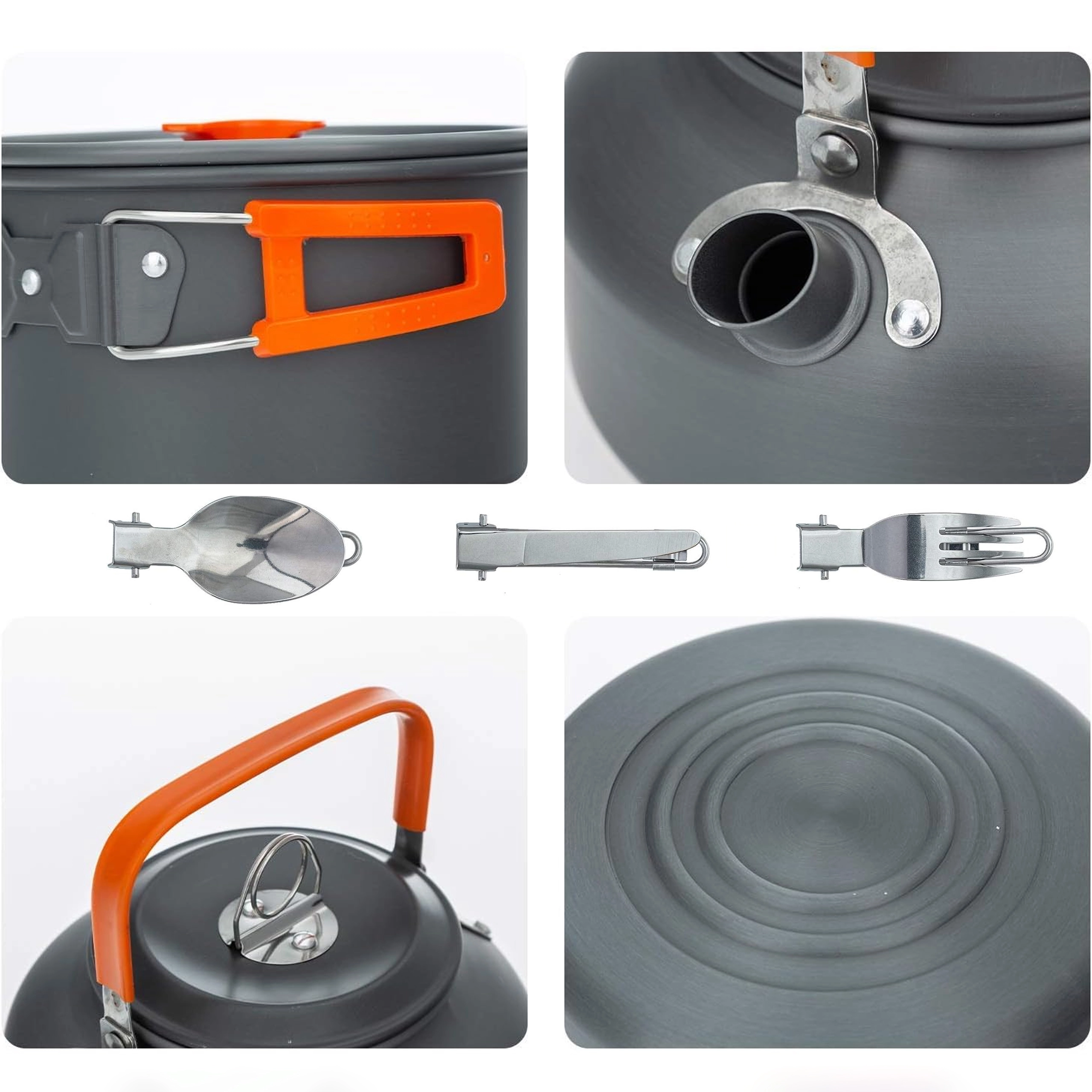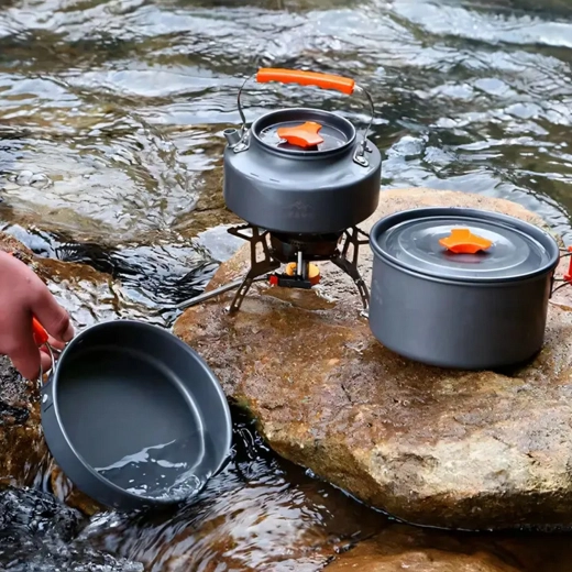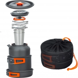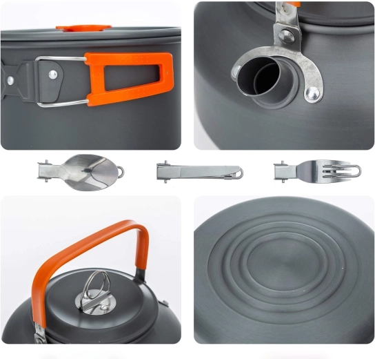 Ten uniwersalny zestaw naczyń kempingowych oferuje wszystko, czego potrzebujesz do komfortowego gotowania na łonie natury. Garnek z pokrywką, patelnia i czajnik turystyczny zapewniają solidną bazę do gotowania, smażenia i podgrzewania wody. Dzięki składanym, odpornym na ciepło uchwytom oraz sprytnemu systemowi pakowania „nesting” cały komplet łatwo mieści się w plecaku.