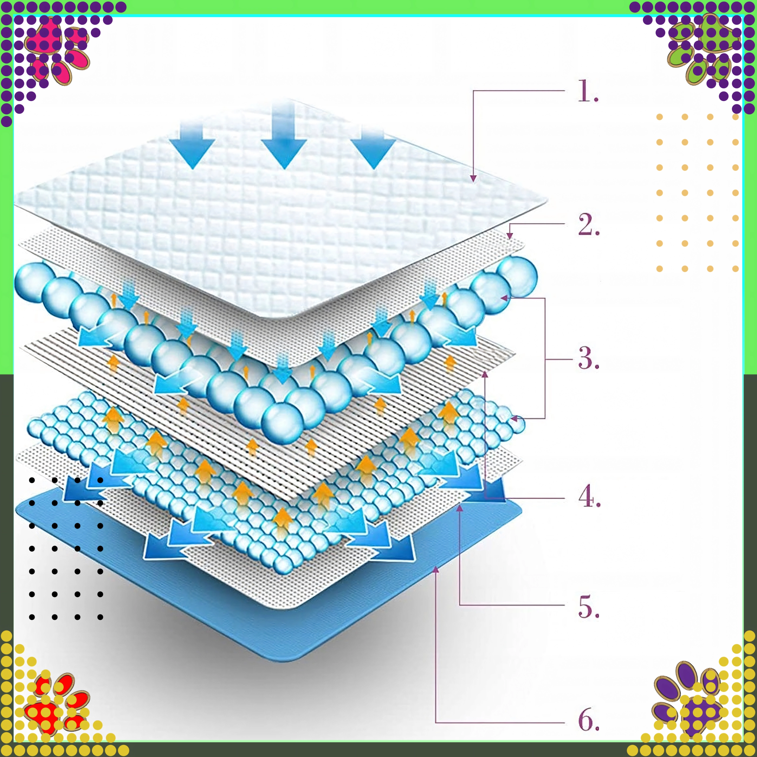 Sześciowarstwowa konstrukcja szybko rozprowadza i zatrzymuje płyn, dzięki czemu powierzchnia pozostaje sucha i czysta, a spodnia warstwa nie przepuszcza wilgoci na podłogę.