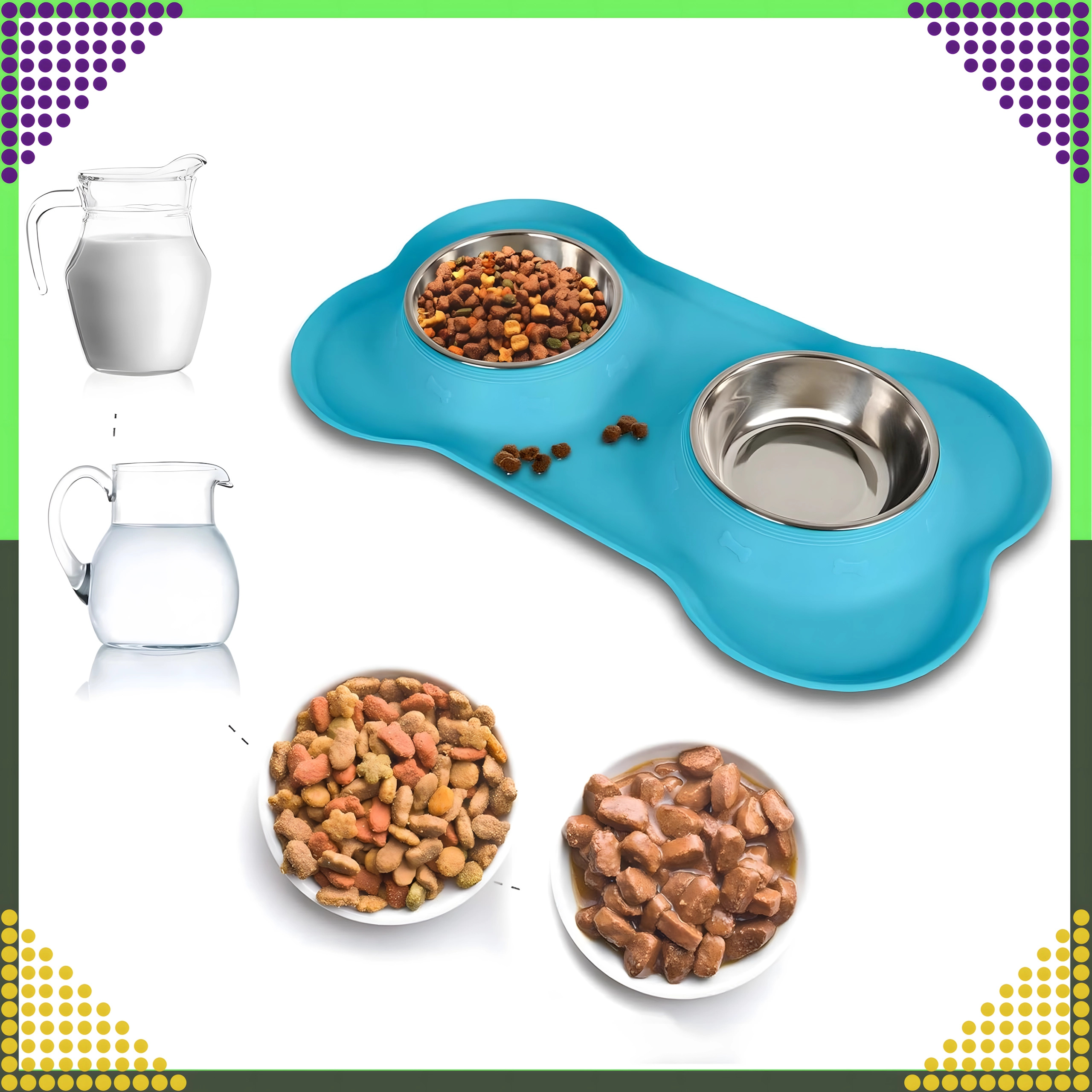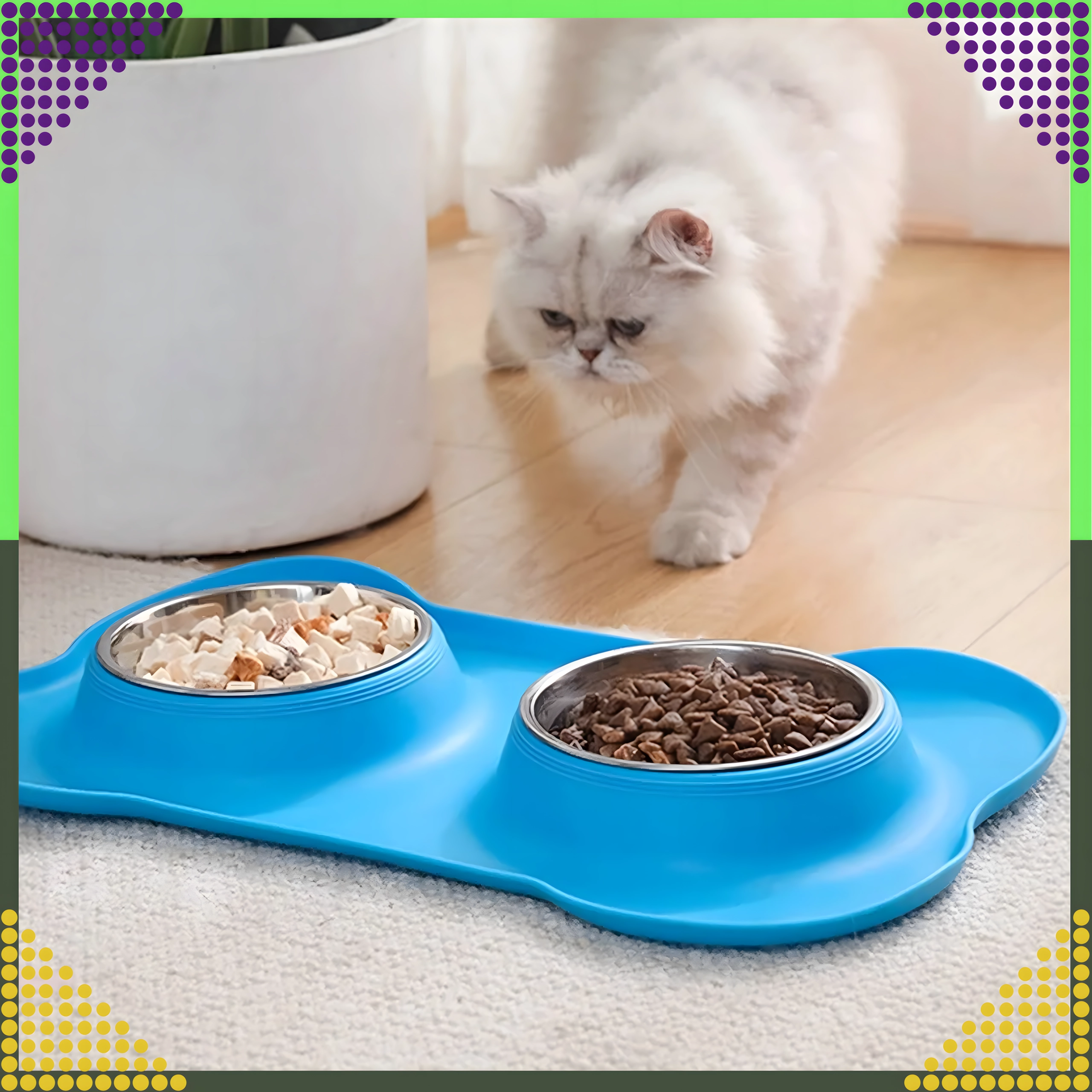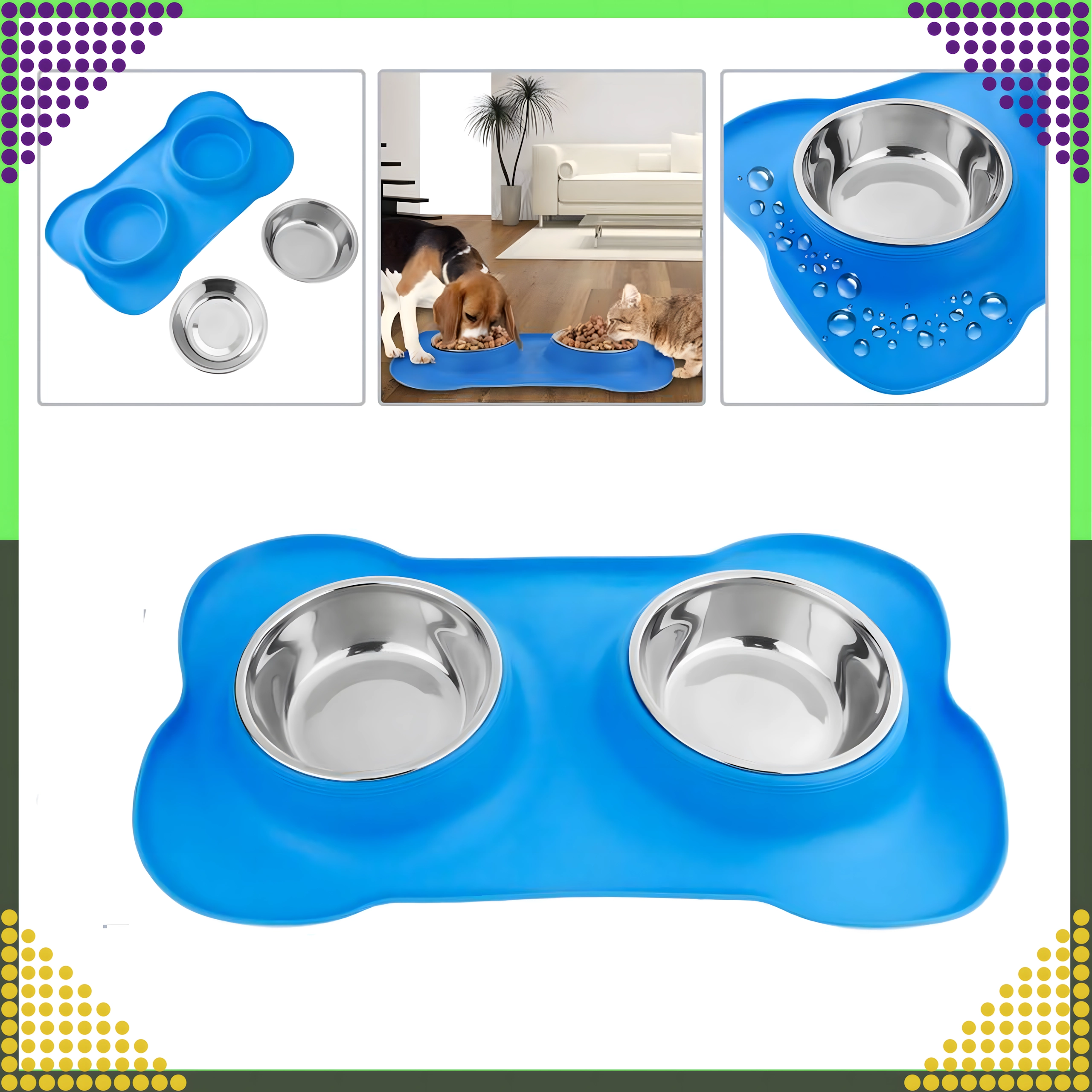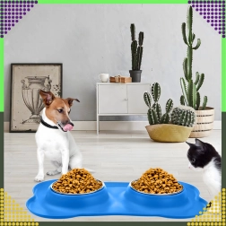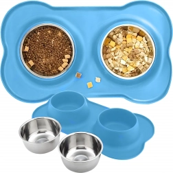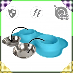 Spraw, aby karmienie było czystsze i wygodniejsze. Podwójna miska z solidną silikonową podkładką utrzymuje wszystko na miejscu, wychwytuje rozsypaną karmę i krople wody, a dzięki stalowym wkładom łatwo ją umyjesz – również w zmywarce.