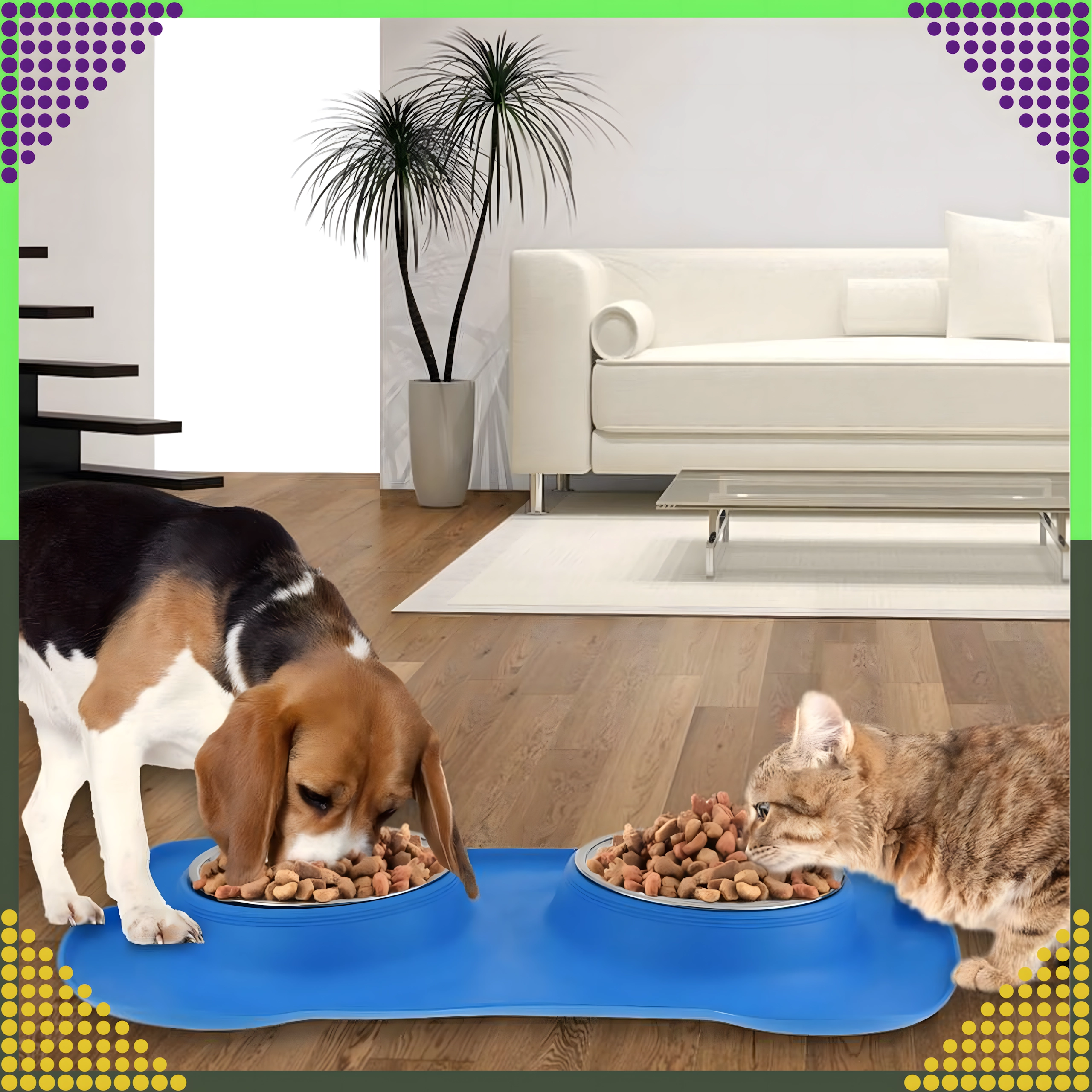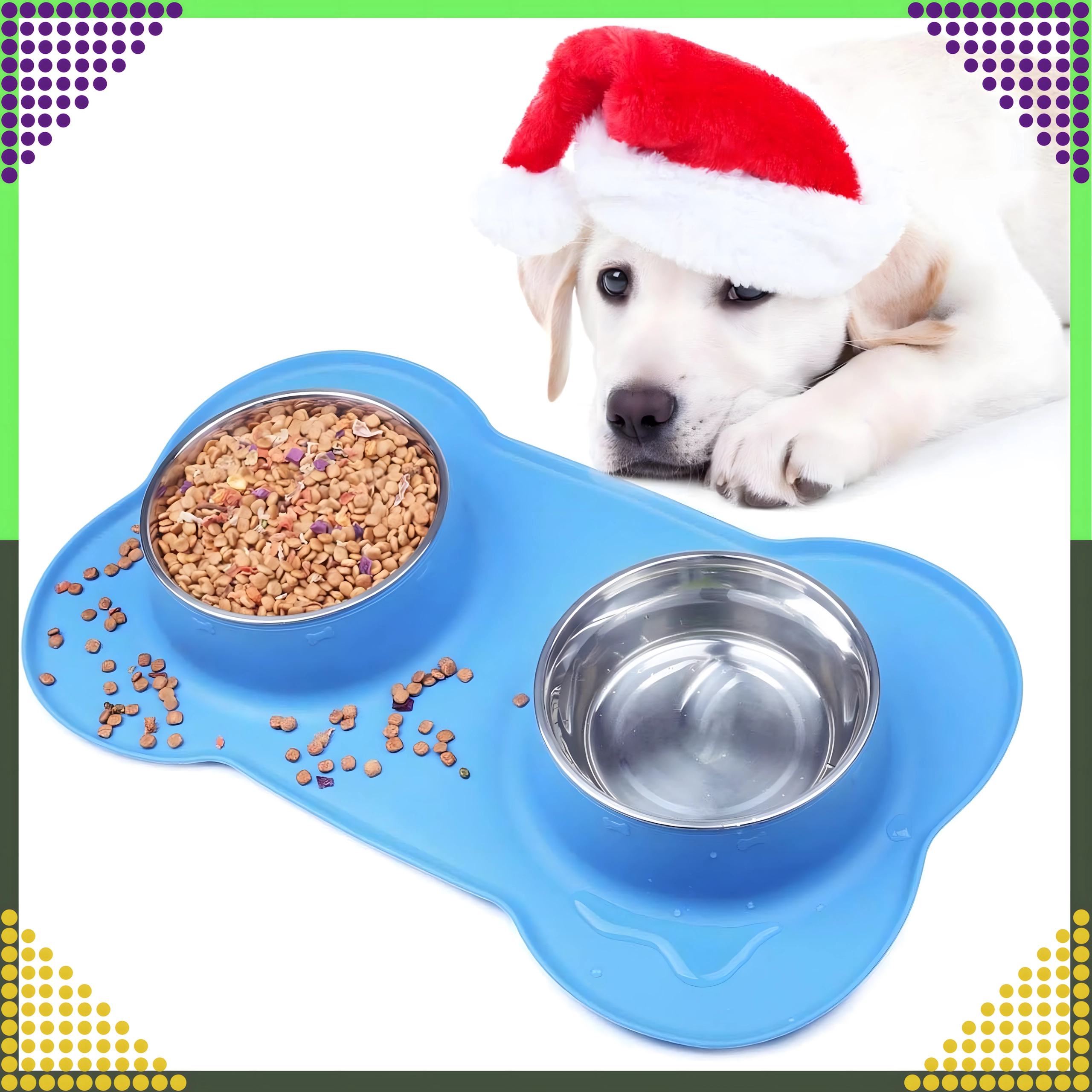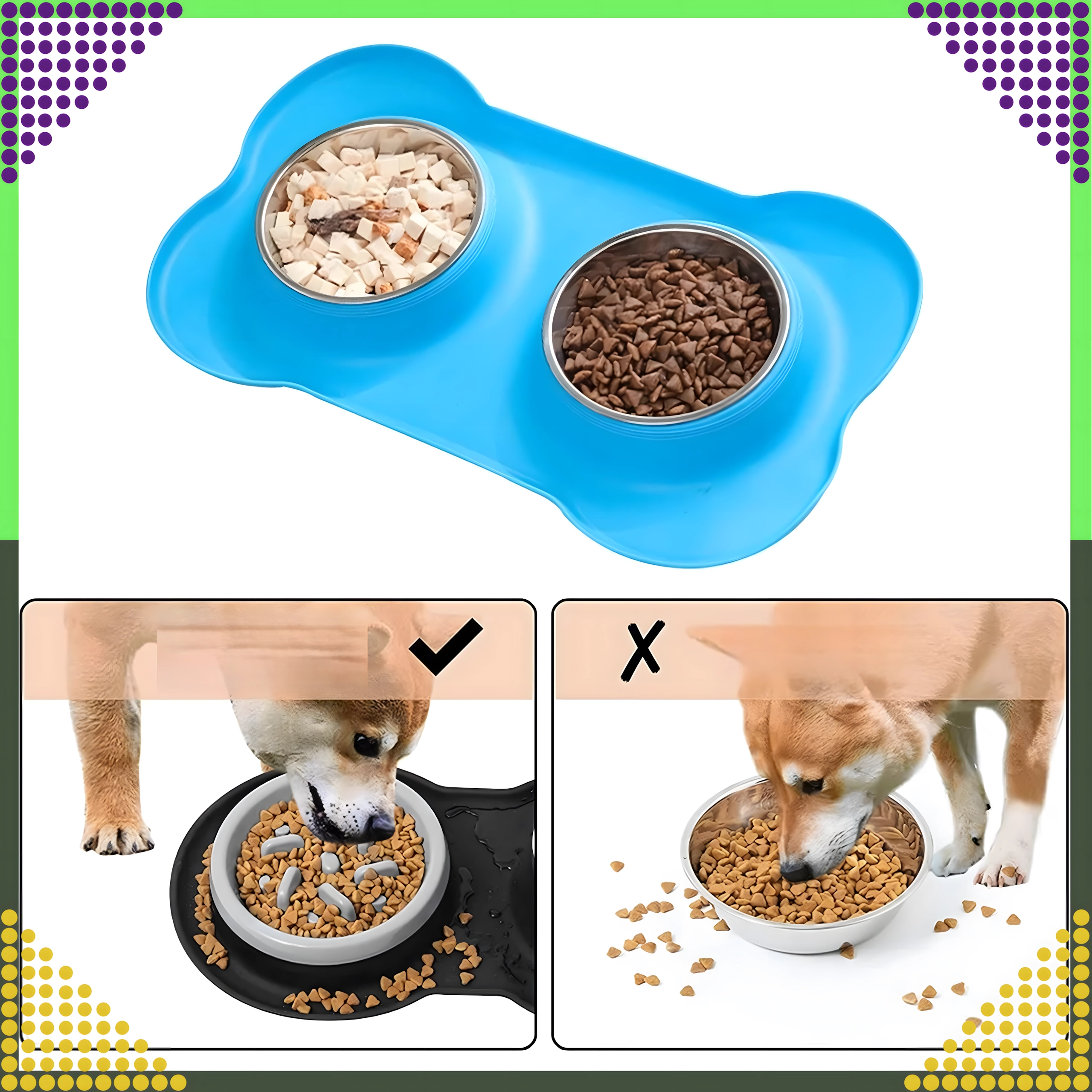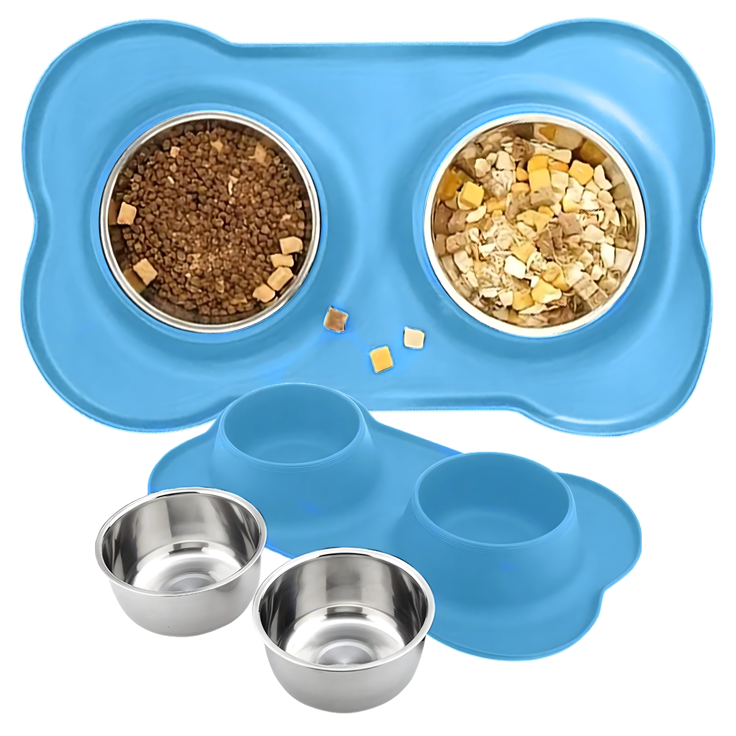 Spraw, aby karmienie było czystsze i wygodniejsze. Podwójna miska z solidną silikonową podkładką utrzymuje wszystko na miejscu, wychwytuje rozsypaną karmę i krople wody, a dzięki stalowym wkładom łatwo ją umyjesz – również w zmywarce.