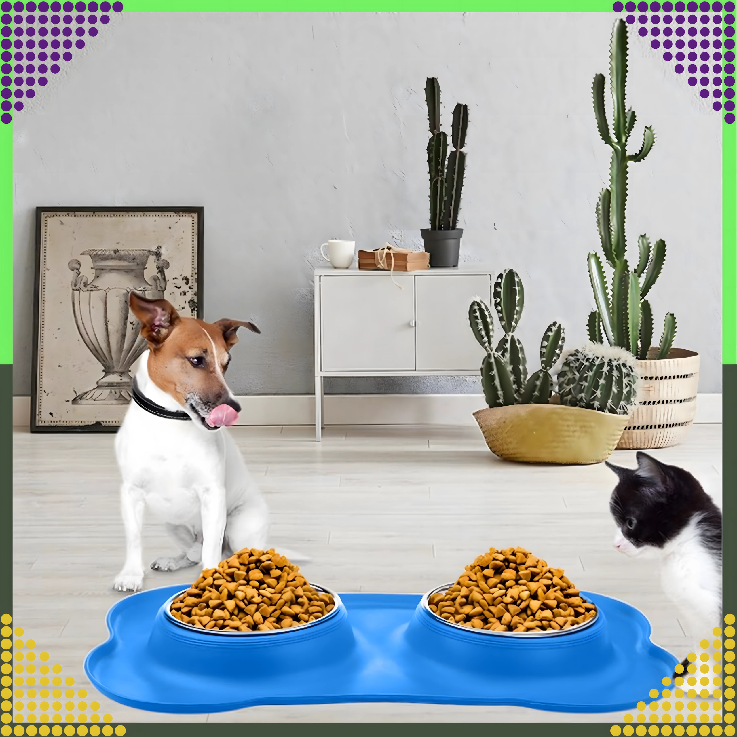 Szeroka silikonowa baza stabilnie trzyma miski na miejscu i wychwytuje granulat oraz krople wody, zapewniając czystsze otoczenie karmienia.