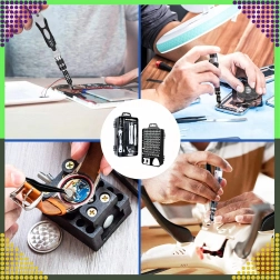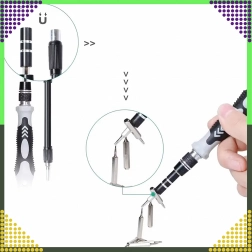 Znajdziesz tu 100 magnetycznych bitów z dłuższymi szyjkami dla lepszego zasięgu, rękojeść z przedłużeniem, pęsetę, przyssawkę, pazy i trójkątne otwieraki oraz magnetyzer/demagnetyzer. Zestaw jest idealny do napraw telefonów, laptopów, PC, zegarków, okularów, aparatów i małych modeli.