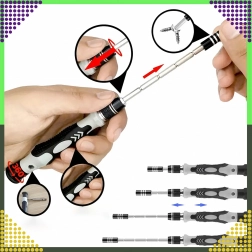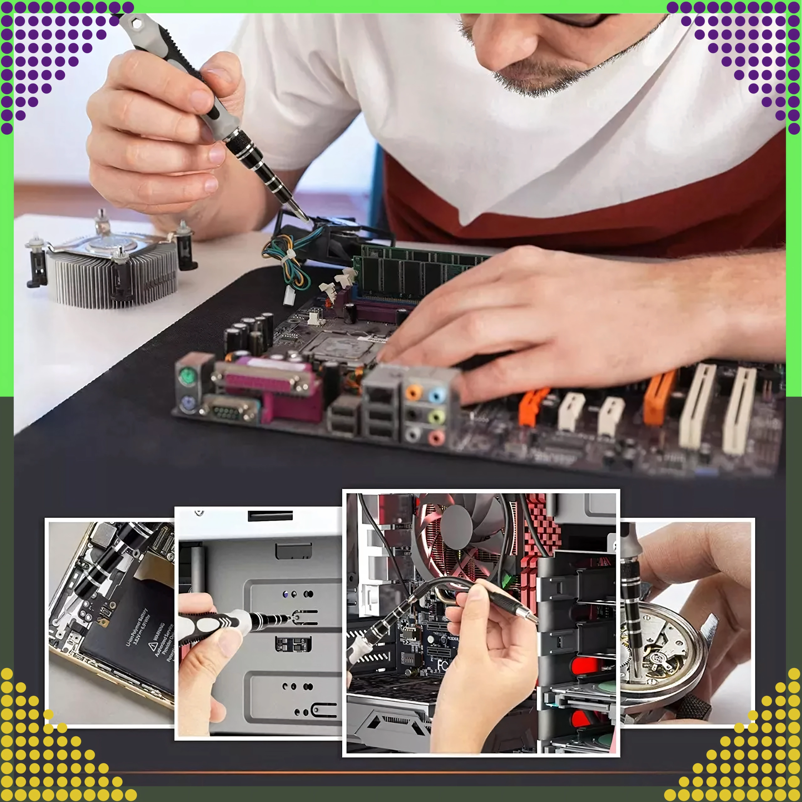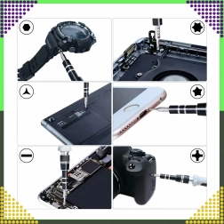 Idealny do napraw telefonów, laptopów, zestawów PC, konsol do gier, aparatów oraz do prac zegarmistrzowskich i optycznych. Trwałe materiały i precyzyjne wykonanie zapewniają długą żywotność i bezpieczną pracę w ciasnych przestrzeniach.