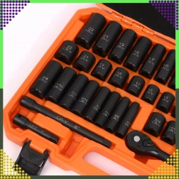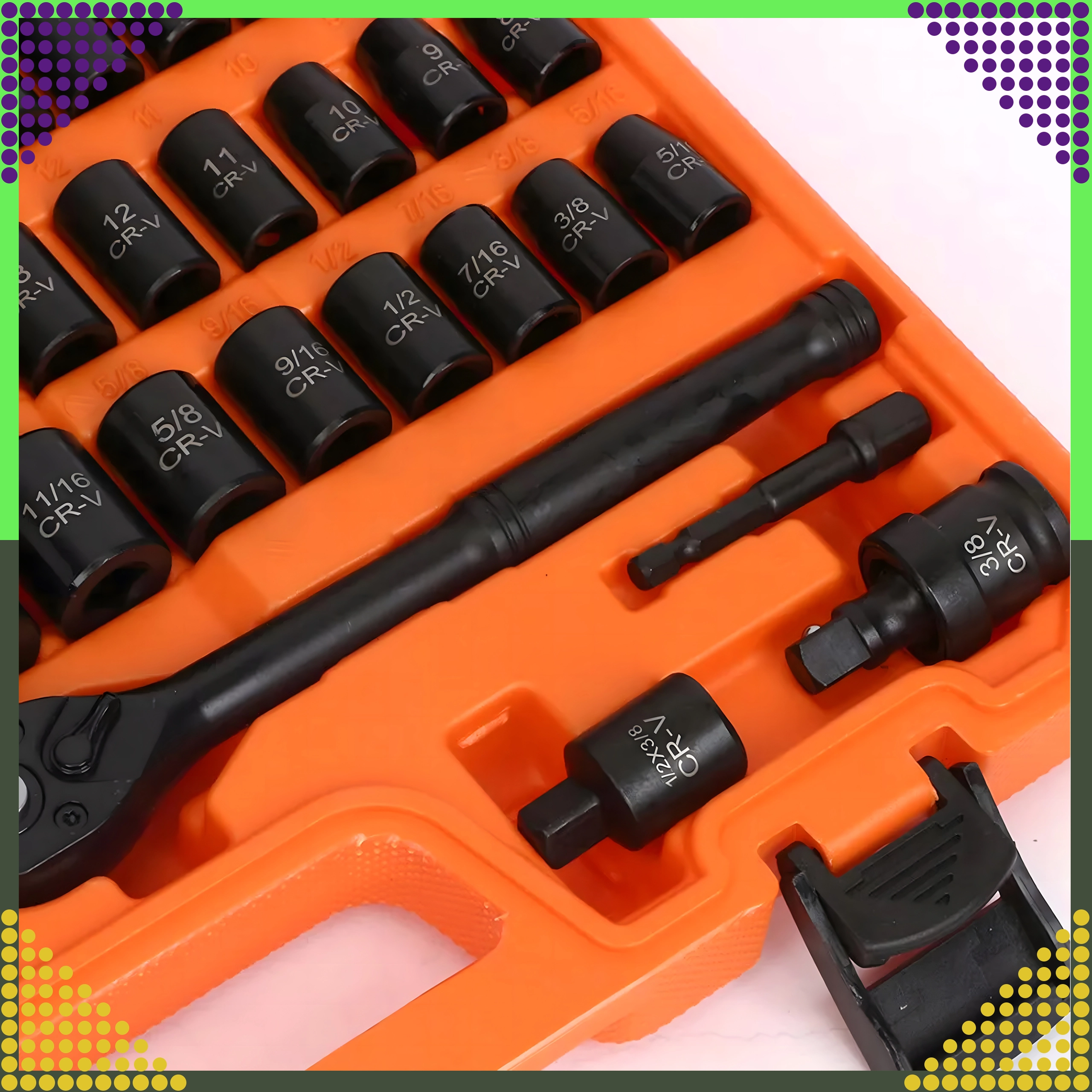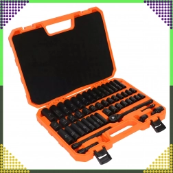 Przejrzyście ułożone nasadki metryczne i SAE, grzechotka, przedłużki i adaptery w wytrzymałej pomarańczowej walizce dla łatwego transportu.